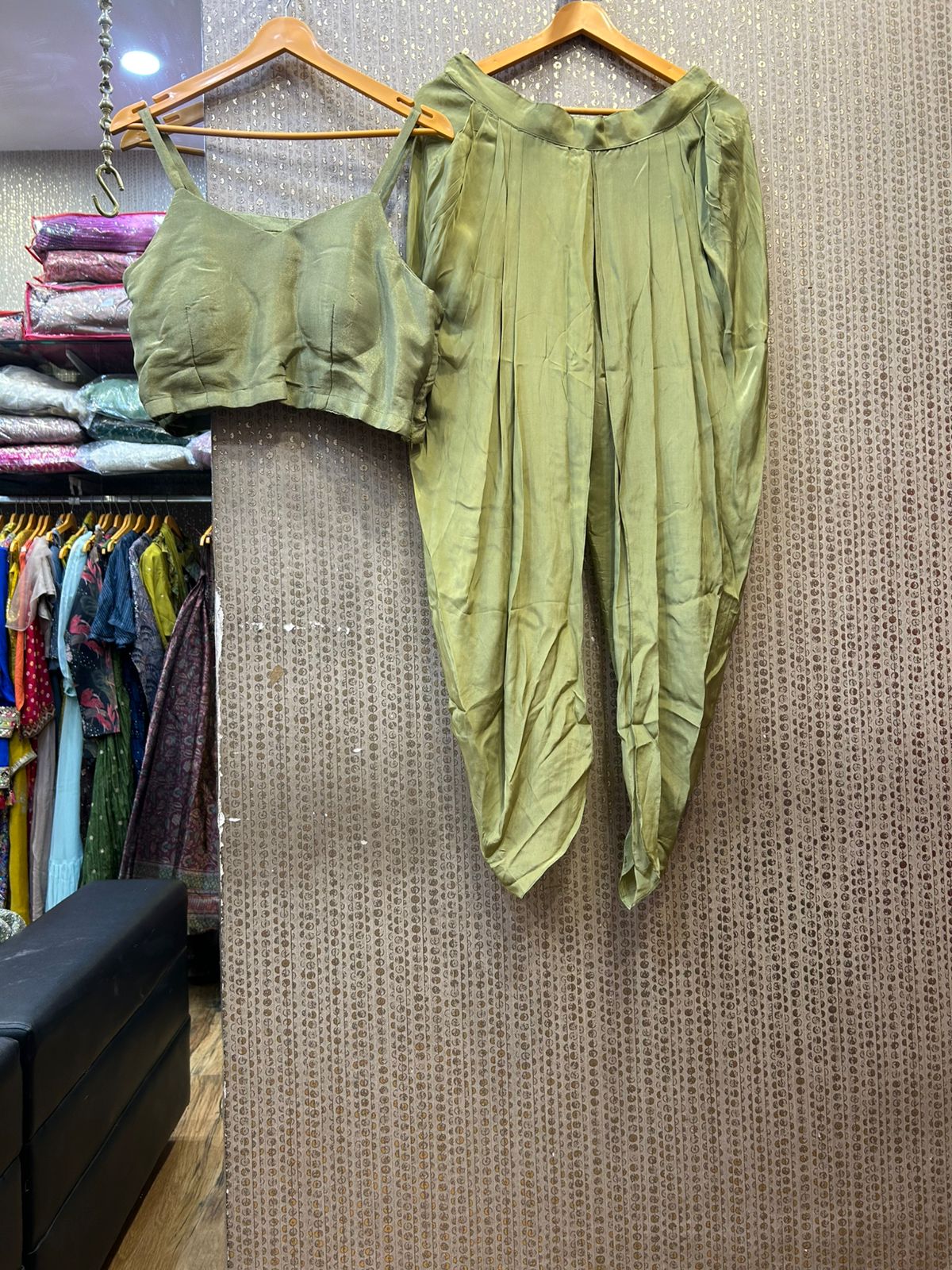 The ensemble is completed with pure silk dhoti pants, which bring a touch of tradition to the modern blazer and blouse combination. The fluid draping of the silk dhoti adds an element of grace and elegance, while its structured folds provide a contemporary edge. The rich texture and luxurious feel of the silk enhance the overall sophistication of the look, making it perfect for high-fashion events, festive celebrations, or stylish evening gatherings.