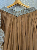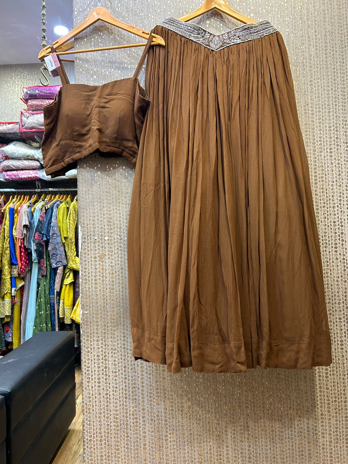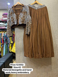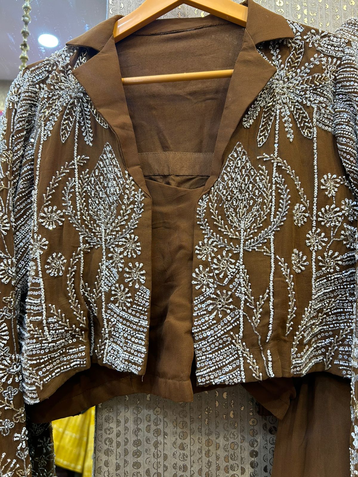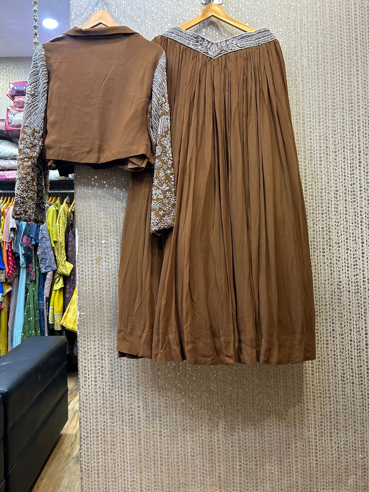 Complementing the short koti and blouse is a rich, plain georgette skirt in coffee brown pastel hues. The soft, flowing fabric of the skirt adds a graceful movement to the ensemble, while its simple design contrasts beautifully with the detailed handwork of the jacket. The subtle pastel shades of the coffee brown color palette evoke a sense of understated luxury, creating a refined and sophisticated aesthetic.