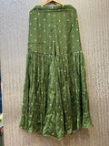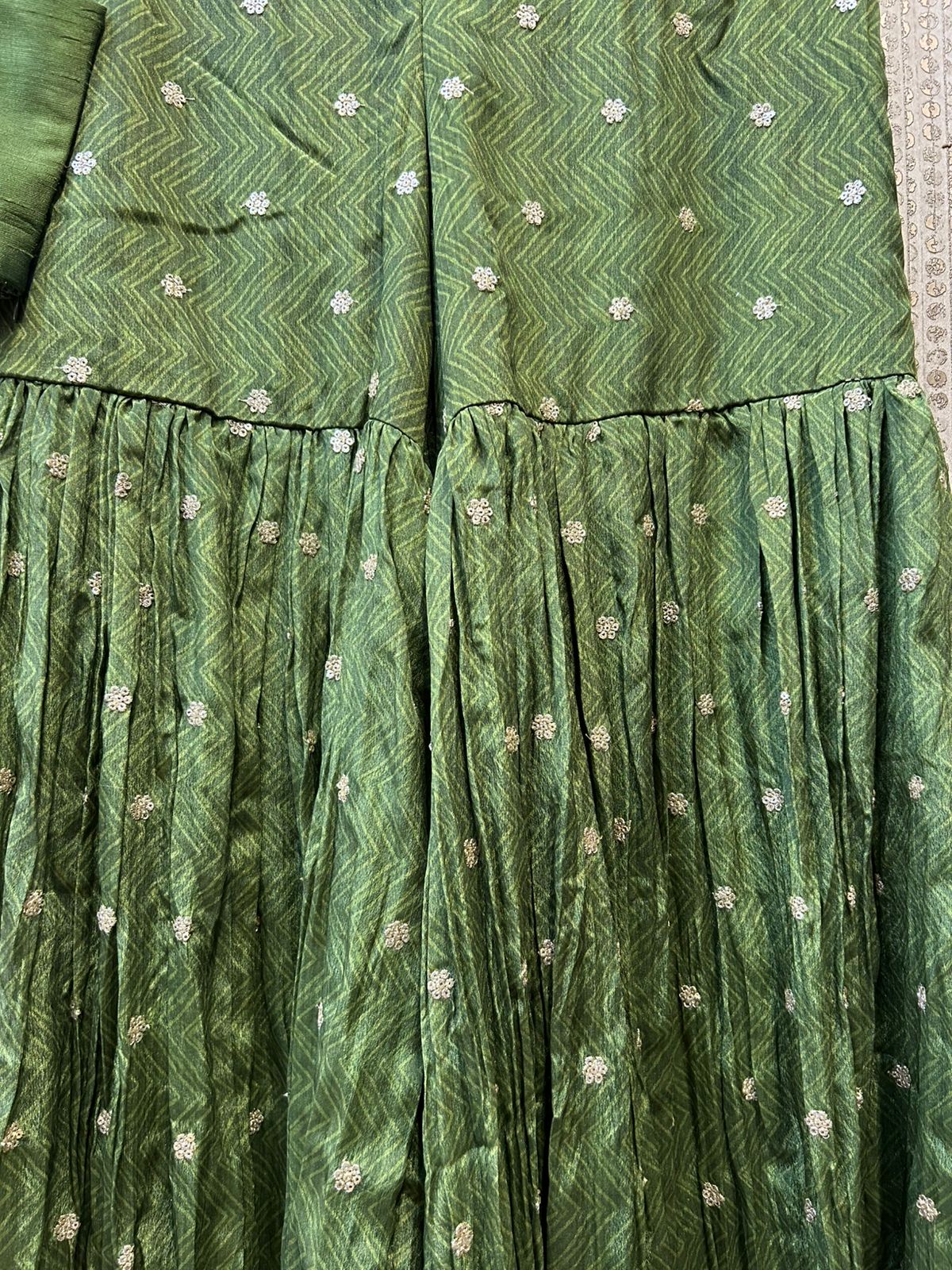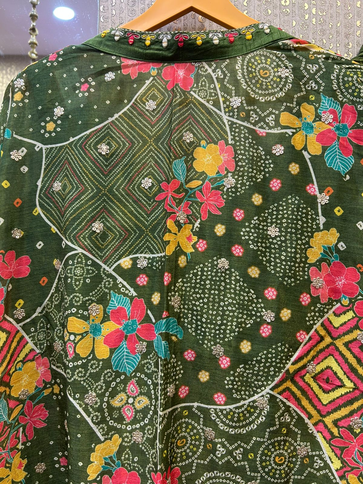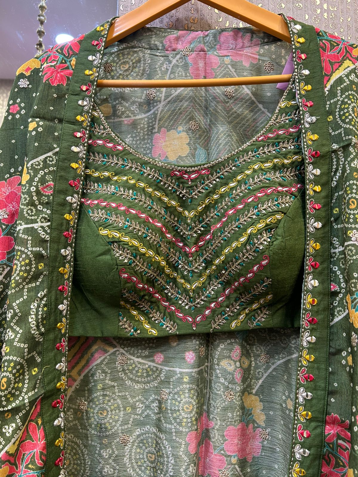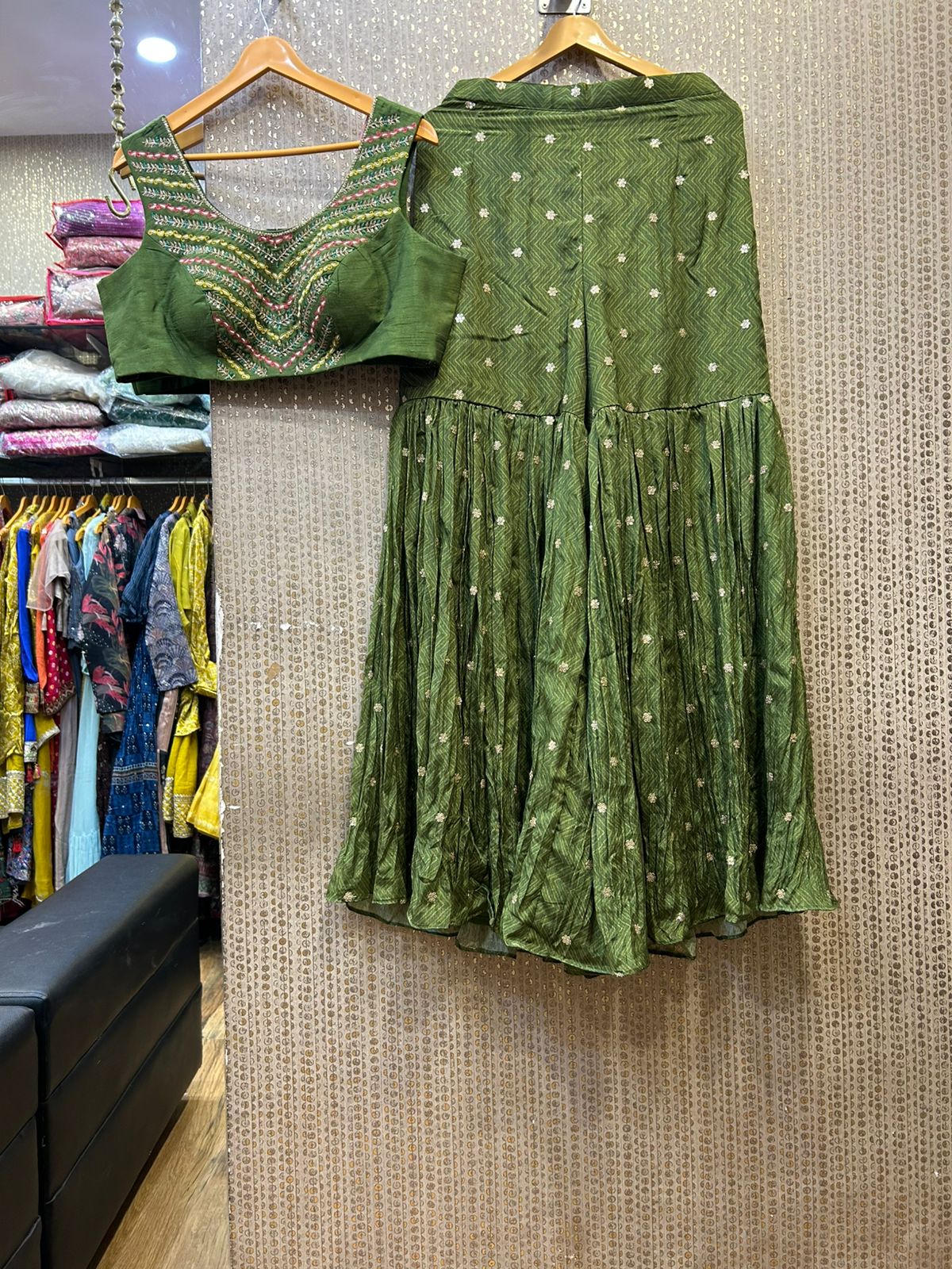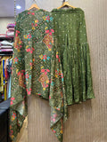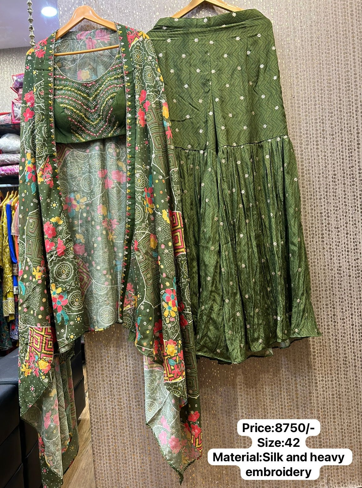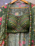 This ensemble by Kalpana’s Creations is the epitome of modern chic, blending intricate handwork with cutting-edge design. The fancy cut cape, paired with the heavily embroidered crop top and weaving fusion sharara, creates a fashion-forward yet elegant look. Ideal for weddings, festive celebrations, or stylish gatherings, this outfit is designed for the modern woman who appreciates the perfect balance of tradition and contemporary style. The rich mehendi green color adds a touch of vibrancy, making this ensemble truly unique and eye-catching.