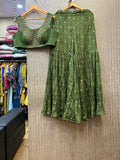 Completing the ensemble is the weaving fusion sharara, designed to offer comfort and elegance. The sharara features a subtle weave pattern that adds texture and depth to the look. Its flowing wide-leg design creates a graceful silhouette, while the mehendi green hue brings a fresh, earthy sophistication to the outfit. The fusion of traditional weaving techniques with contemporary styling makes this sharara a standout piece, adding both cultural richness and modern flair.