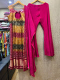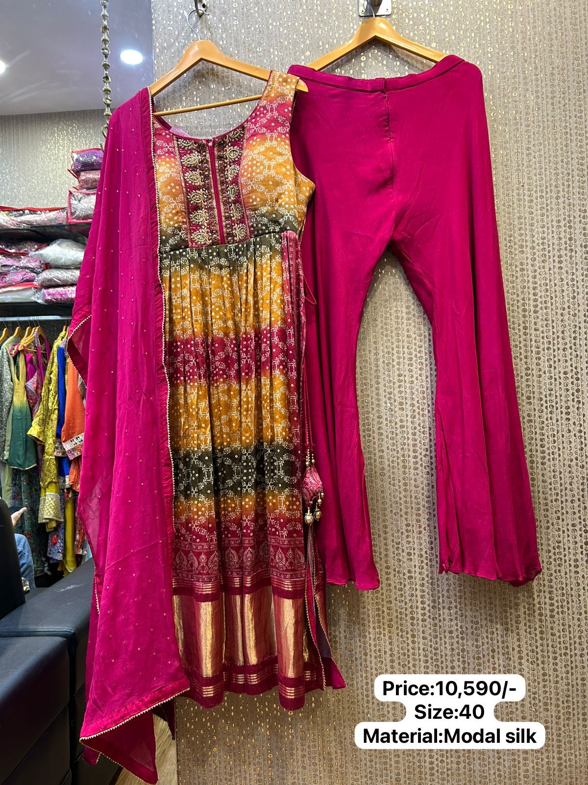 The focal point of this ensemble is the exquisite long top crafted from pure modal fabric in a rich rani hue. The bandhani fusion design adds a unique twist, showcasing intricate tie-dye patterns that celebrate traditional craftsmanship. The fancy side cut of the top not only enhances its modern aesthetic but also adds an element of surprise and elegance to the silhouette, making it a perfect choice for the fashion-forward woman.