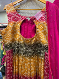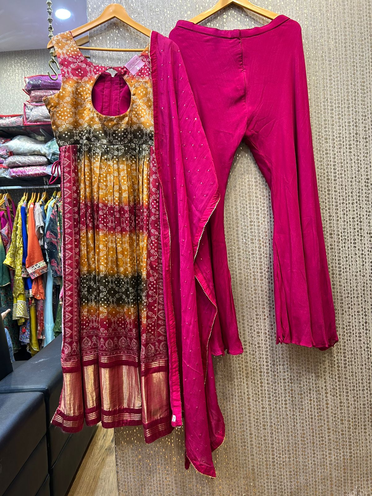 Kalpana’s Creations presents a stunning designer ensemble featuring a pure modal bandhani fusion long top in vibrant rani color, designed with a fancy side cut and adorned with heavy handwork buttas. This sophisticated outfit is complemented by matching pants and a coordinating dupatta, creating a modern chic look that beautifully merges traditional artistry with contemporary flair.
