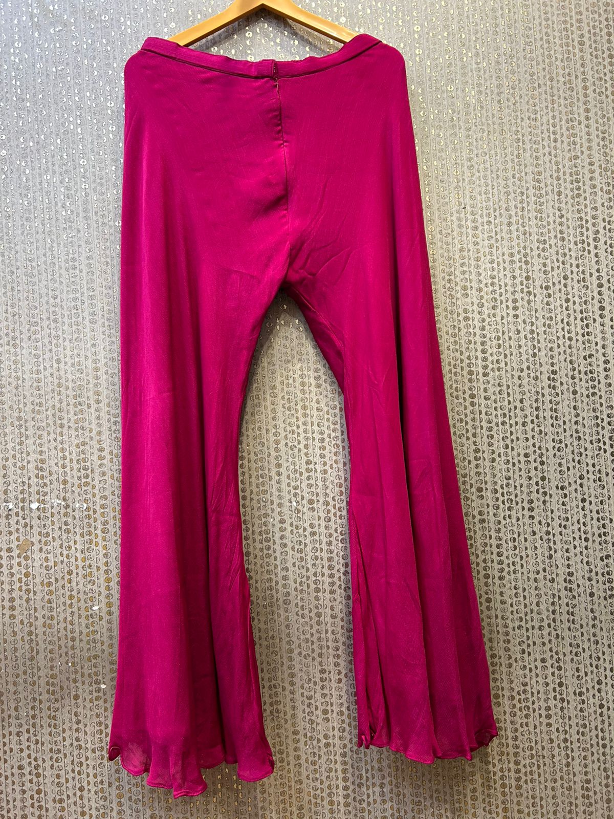 The ensemble is paired with tailored pants that offer a sleek and polished finish. Designed for both comfort and style, the pants complement the long top perfectly, allowing for easy movement while maintaining a chic silhouette. Their simplicity balances the ornate details of the top, creating a cohesive and elegant look.