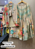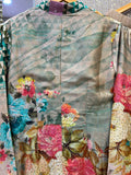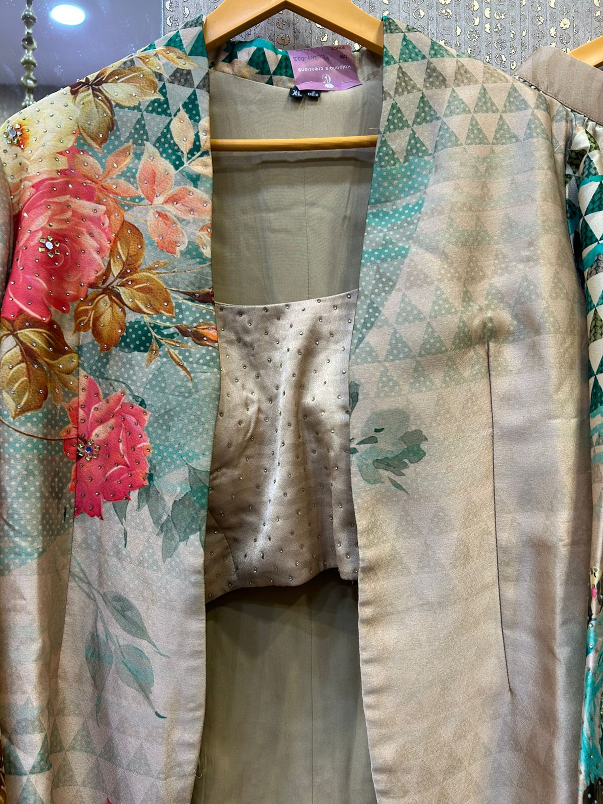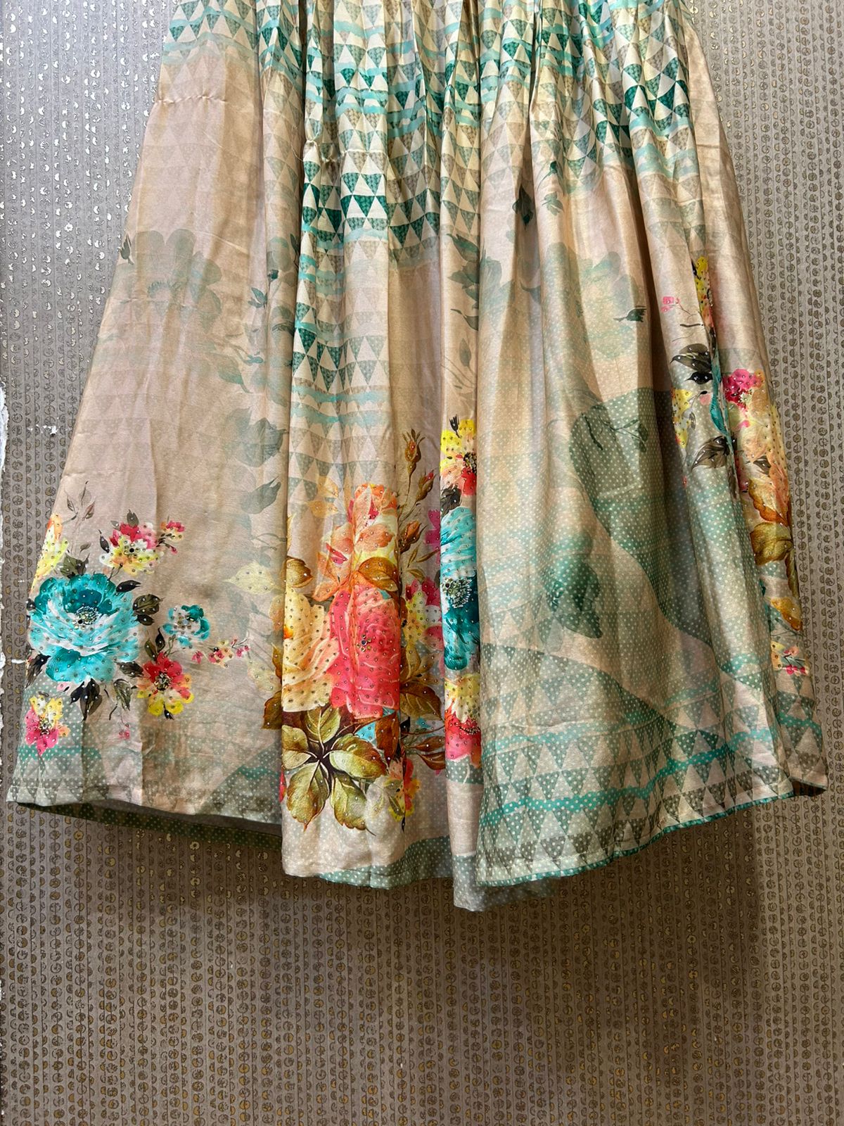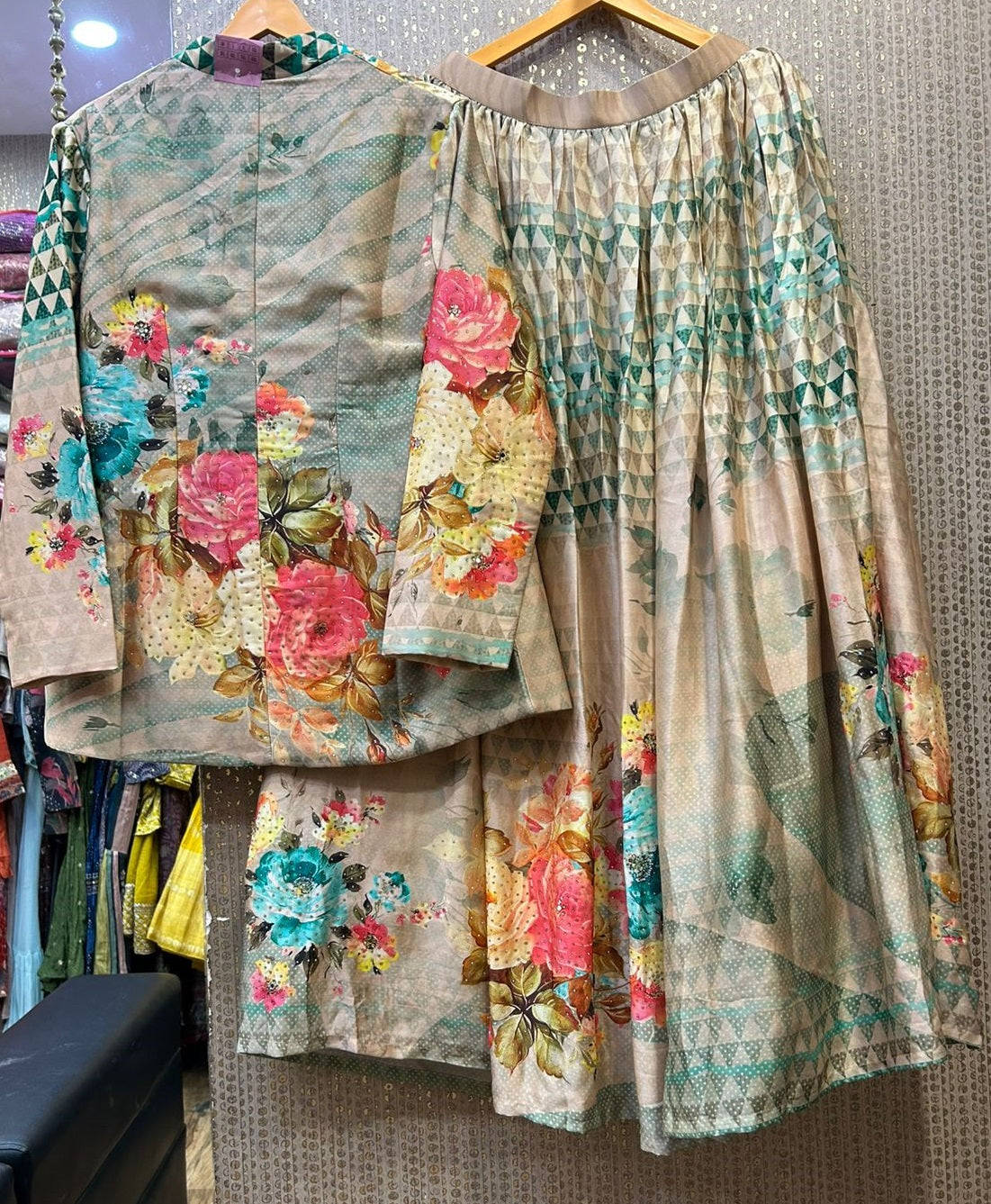 The highlight of this ensemble is the elegant chaniya, crafted from luxurious pure silk and adorned with intricate heavy stone tikki work. The shimmering stones catch the light beautifully, adding a touch of opulence and glamour to the outfit. The rich fabric drapes gracefully, ensuring a flattering silhouette, while the combination of floral and abstract prints adds depth and visual interest, making the chaniya a statement piece.
