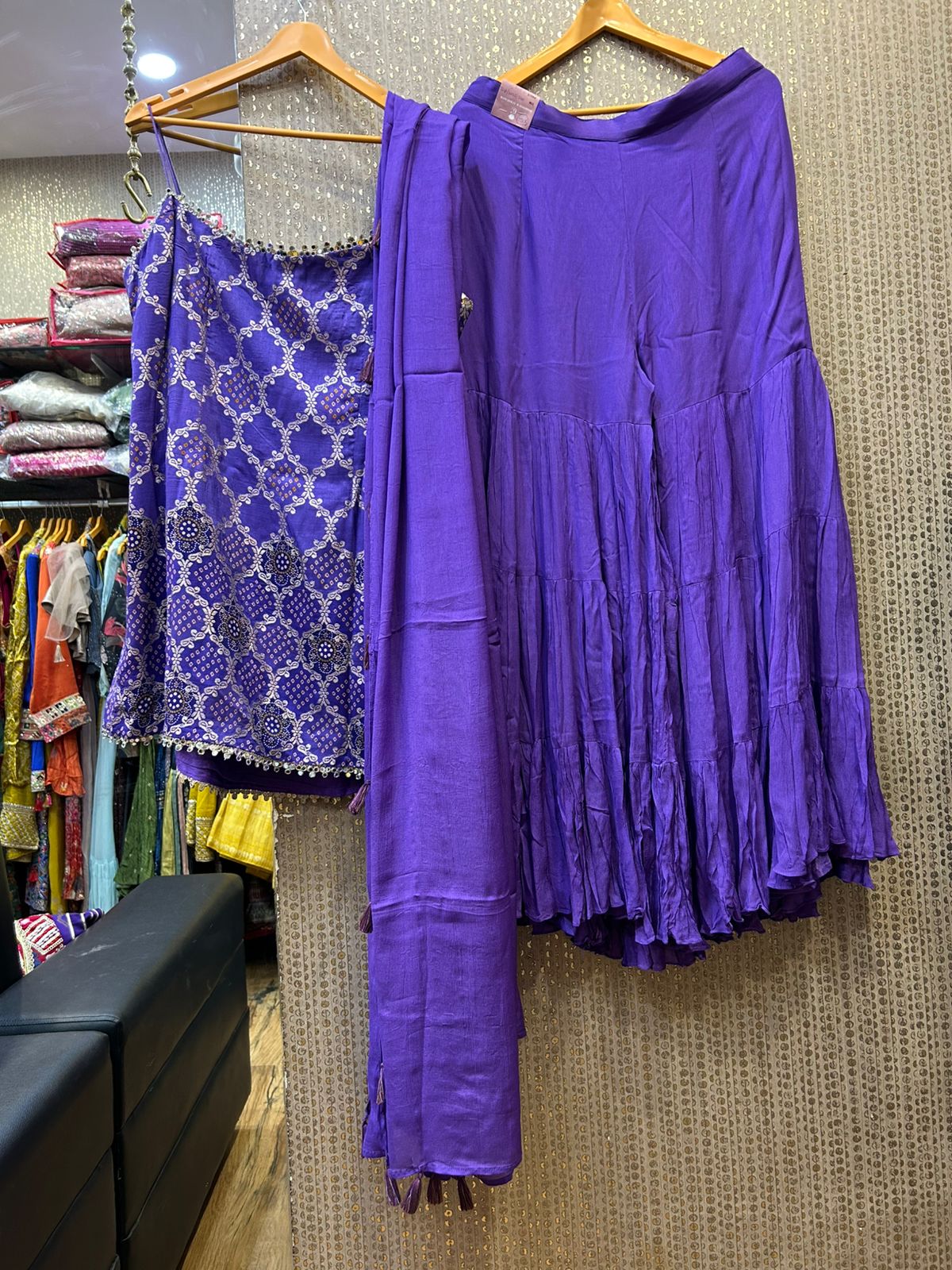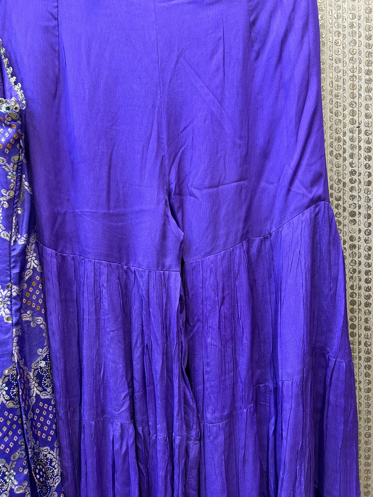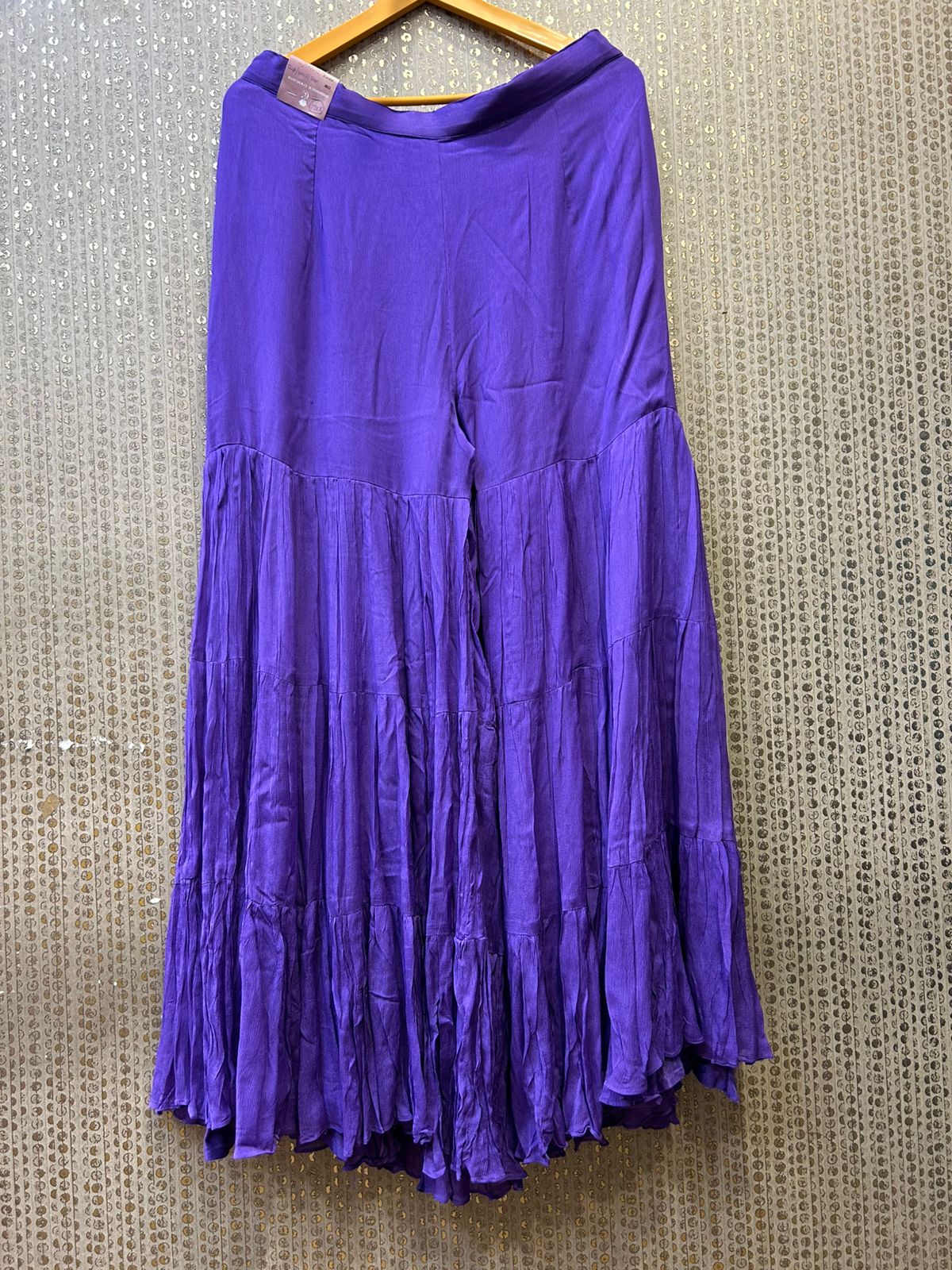 Completing the ensemble is a dramatic sharara bottom that adds volume and movement. The wide-leg silhouette of the sharara flatters the figure, while the flowing fabric provides ease and comfort. The rich purple sharara creates a striking contrast with the fitted spaghetti top, offering a balanced, yet bold aesthetic.
