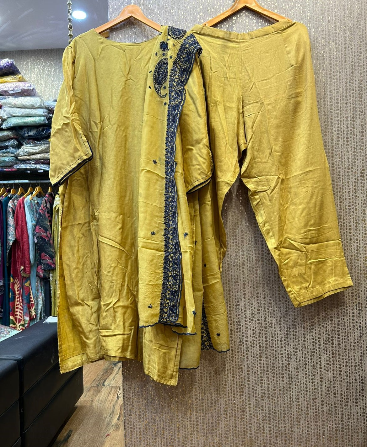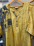 The standout feature of this ensemble is the unique heavy embroidered dupatta, which adds a touch of opulence and artistry. The intricate embroidery work is meticulously done, featuring traditional motifs and patterns that elevate the overall elegance of the outfit. The mustard hue of the dupatta ties in beautifully with the rest of the ensemble, while the heavy embroidery creates a rich contrast, turning this piece into a statement accessory. The dupatta drapes gracefully, adding texture and depth to the look.