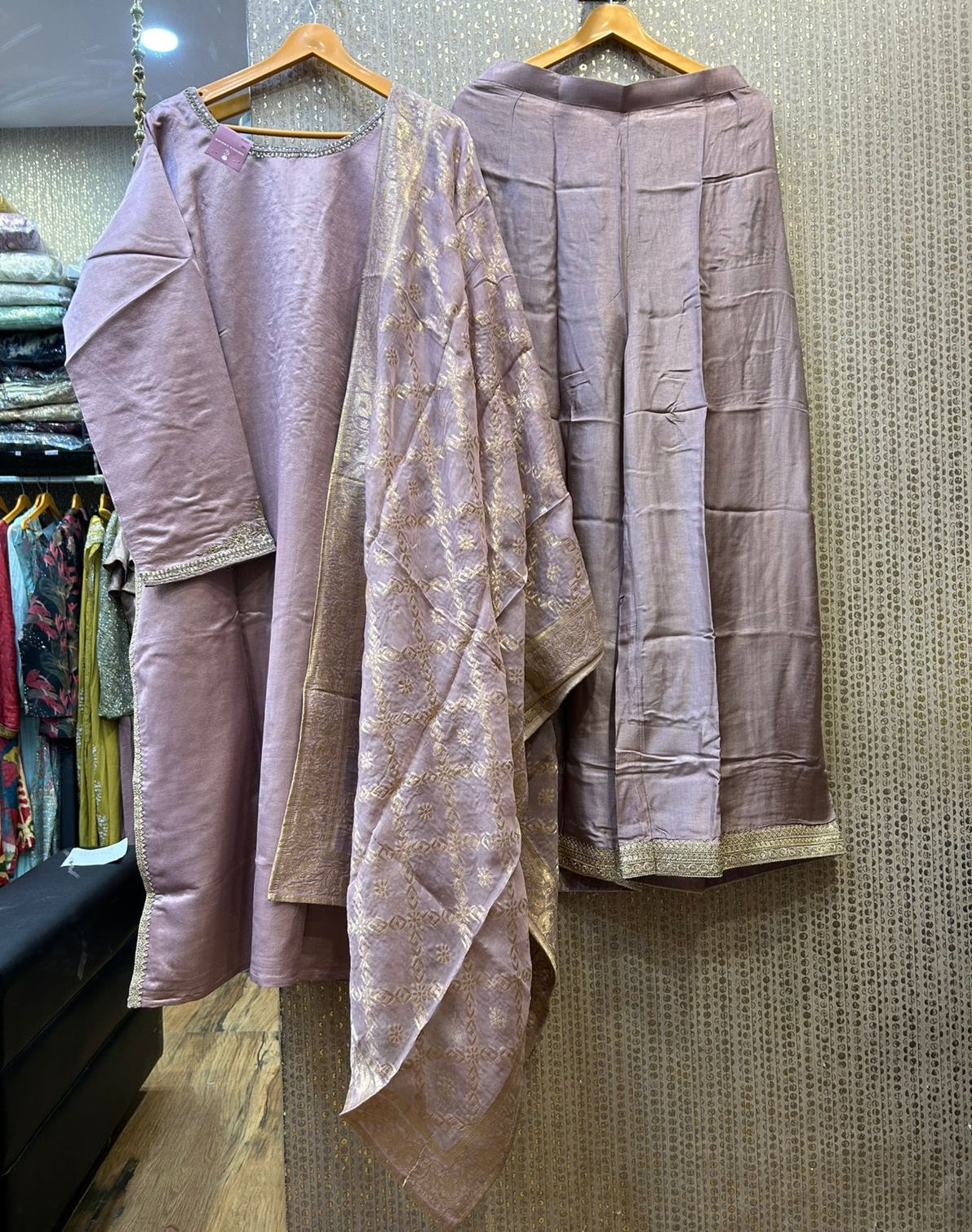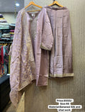 Kalpana’s Creations presents a breathtaking designer pure silk-based plus-size DRESS in a delicate onion pink shade, paired with matching pants and a luxurious Banarasee weaving dupatta. This ensemble blends the softness of silk with intricate handwork and traditional elegance, offering a modern chic look for festive and formal occasions.