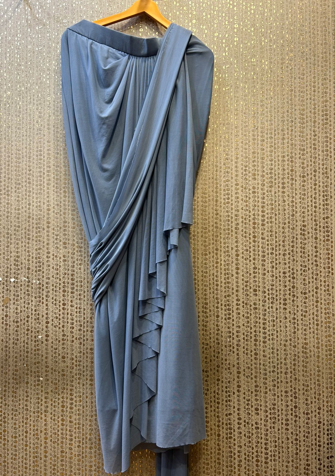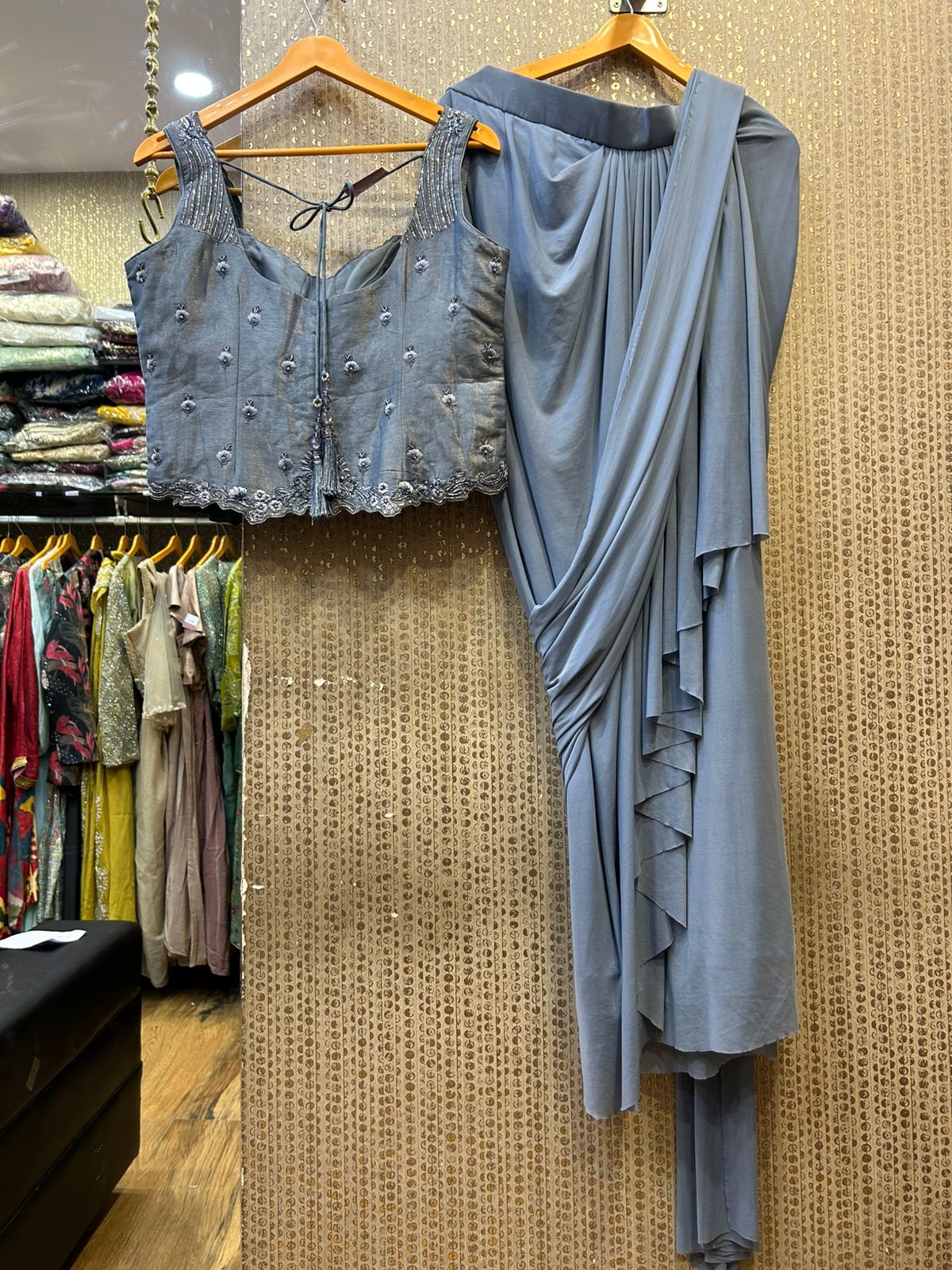 This ensemble by Kalpana’s Creations perfectly embodies a modern chic aesthetic, effortlessly blending traditional artistry with contemporary fashion. Ideal for weddings, festive occasions, or upscale gatherings, the combination of the grey stretchable net drape saree and the fancy spaghetti blouse creates a captivating look. Embrace the elegance of this outfit, designed for the modern woman who appreciates both sophistication and style.