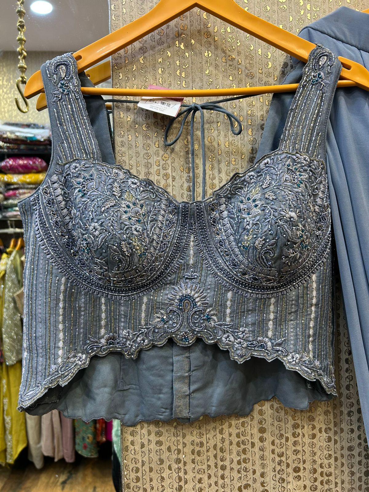 The highlight of this outfit is the elegantly draped saree made from luxurious stretchable net fabric. This innovative material allows for a flattering fit while providing the perfect flow and drape. The subtle grey hue adds sophistication, while the delicate banarasi tissue khat work enhances the overall design with intricate detailing. The drape is expertly styled to create a contemporary silhouette that highlights the wearer's figure, making it an ideal choice for the fashion-savvy woman.