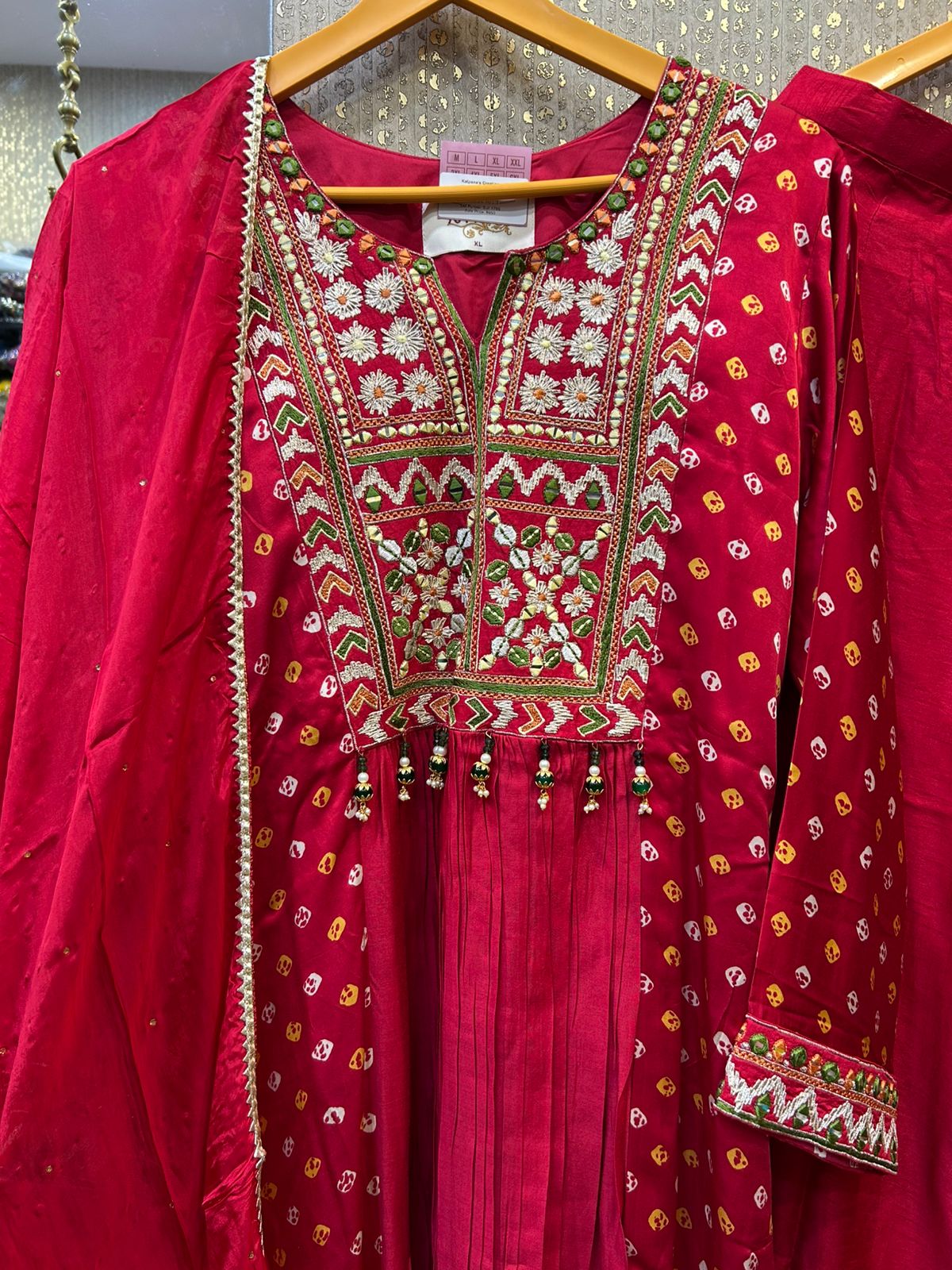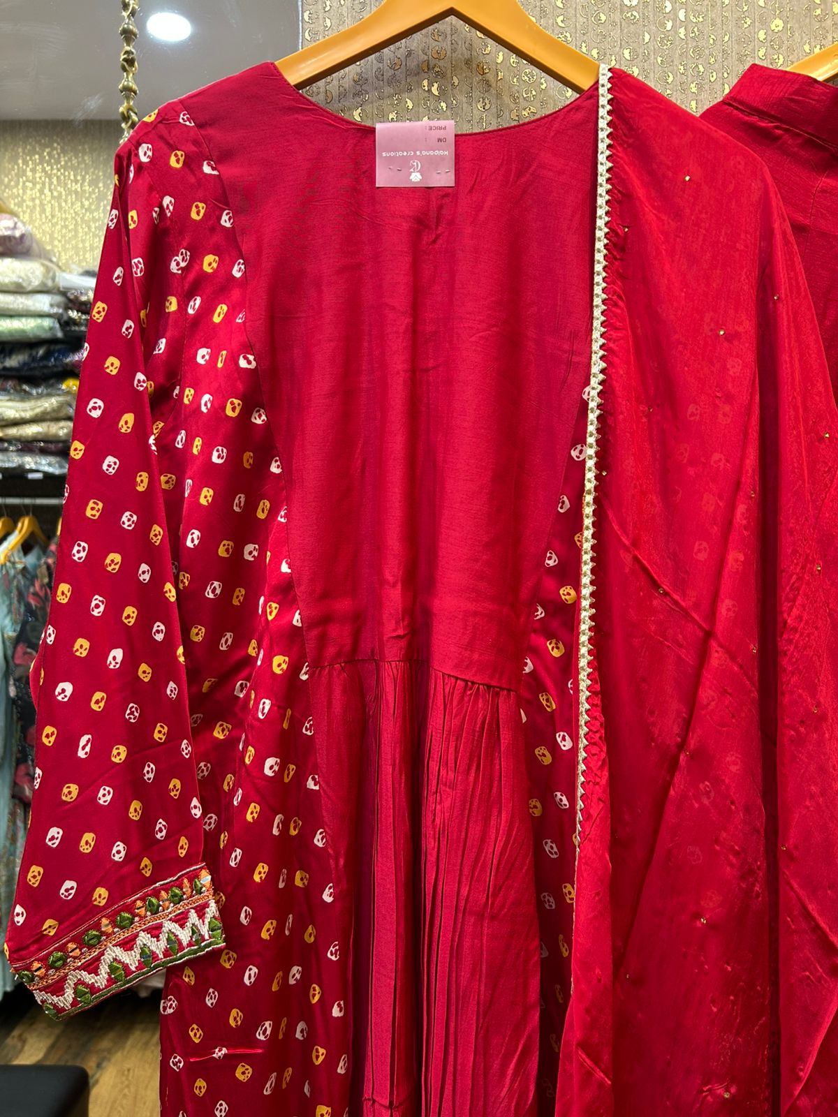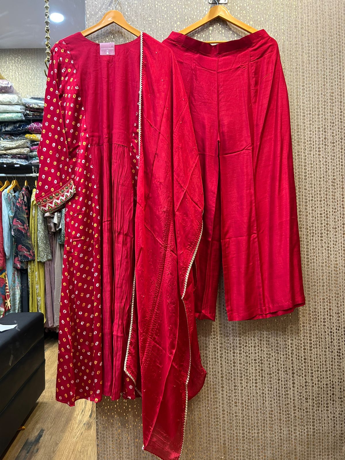 Kalpana’s Creations presents a stunning DESIGNER ensemble featuring a vibrant red silk and Bandhani havay dress, paired with elegant pants and a coordinating dupatta. This captivating outfit perfectly embodies a modern chic look while celebrating the rich heritage of traditional craftsmanship, making it an ideal choice for festive occasions and special gatherings.