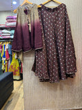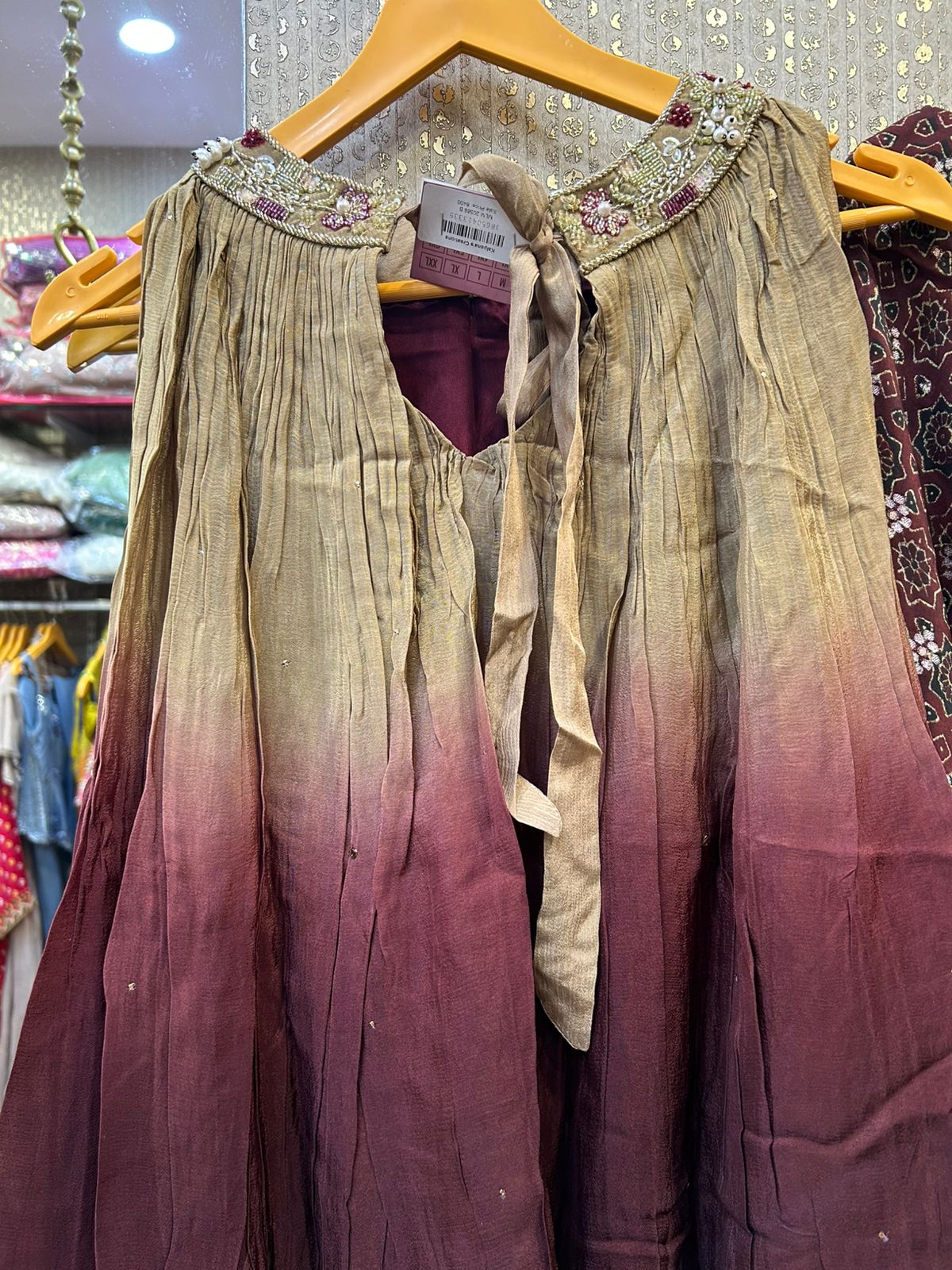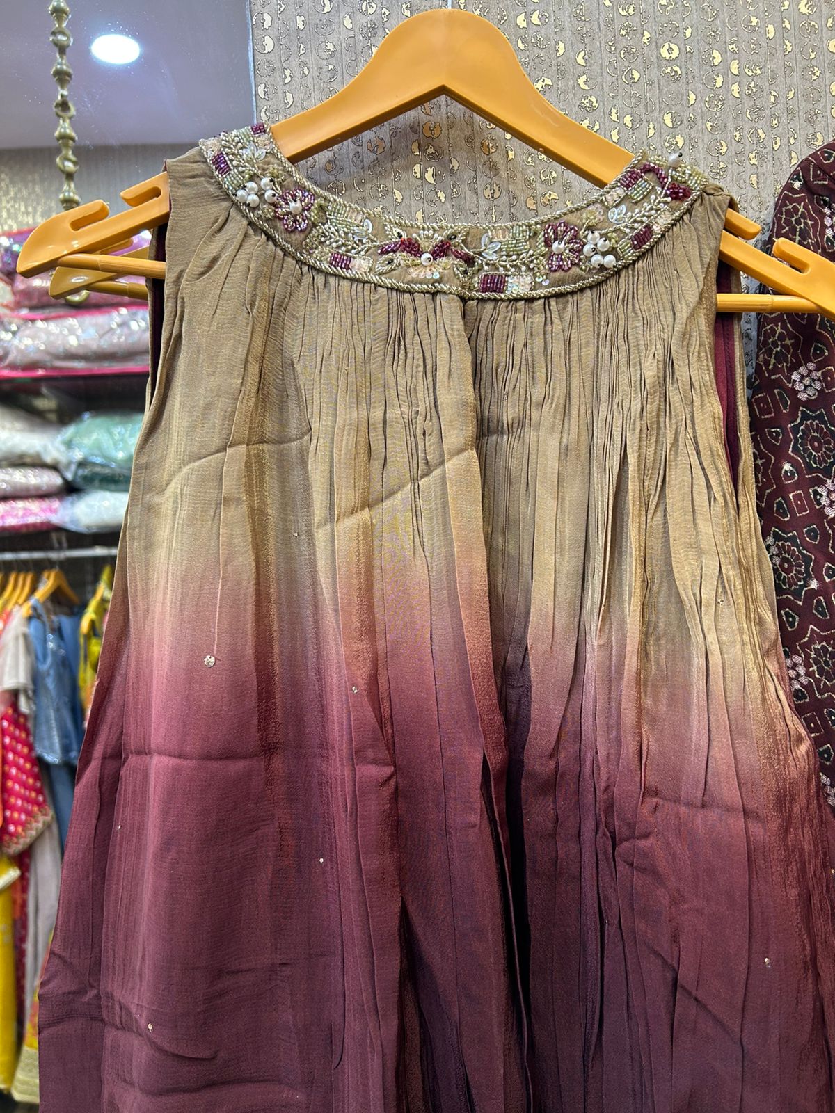 Kalpana’s Creations proudly presents an exquisite designer ensemble featuring a heavy handwork maroon balloon top paired with elegant double ghera palazzo pants. This stunning combination fuses traditional craftsmanship with modern chic elements, creating a versatile outfit perfect for a variety of occasions.