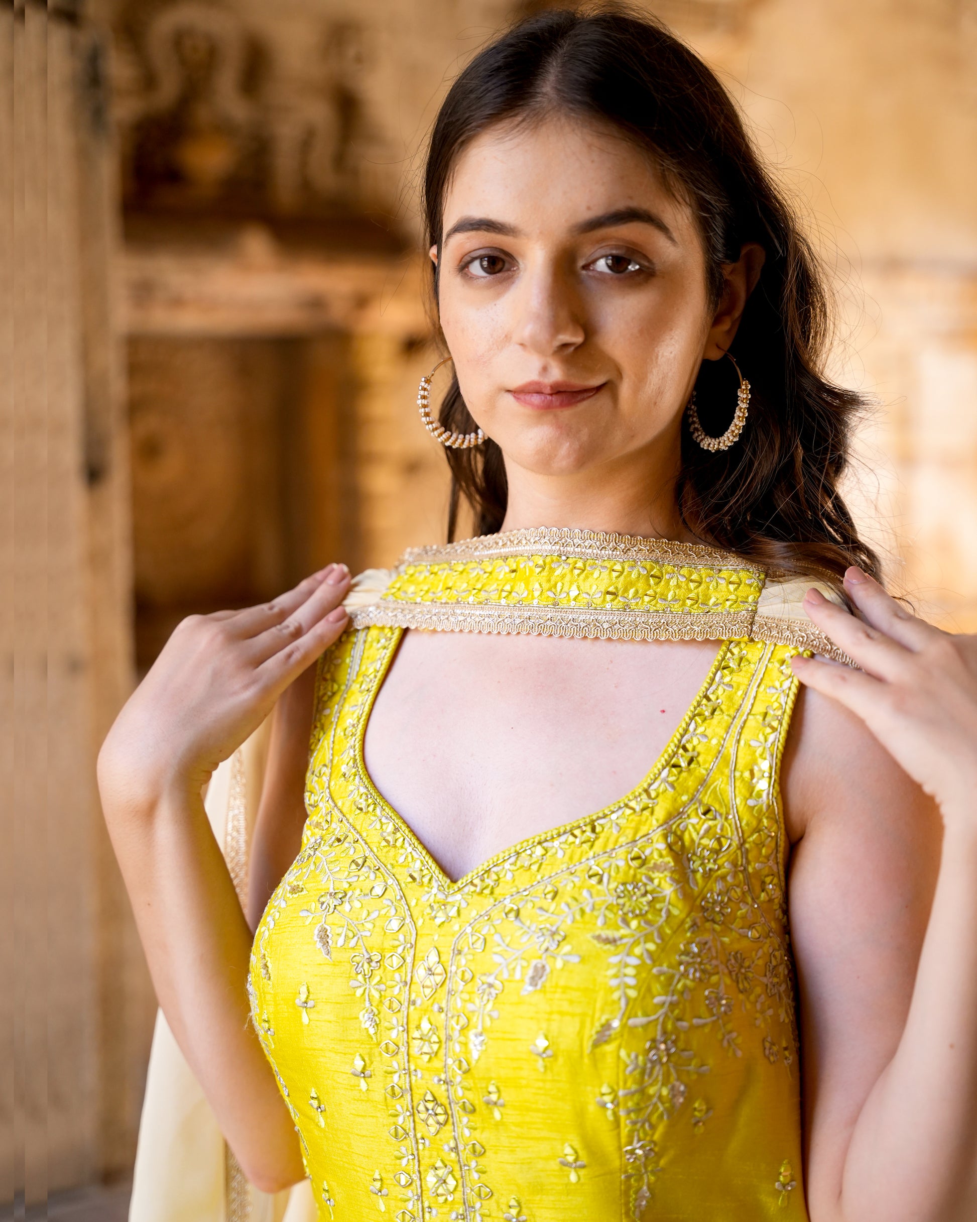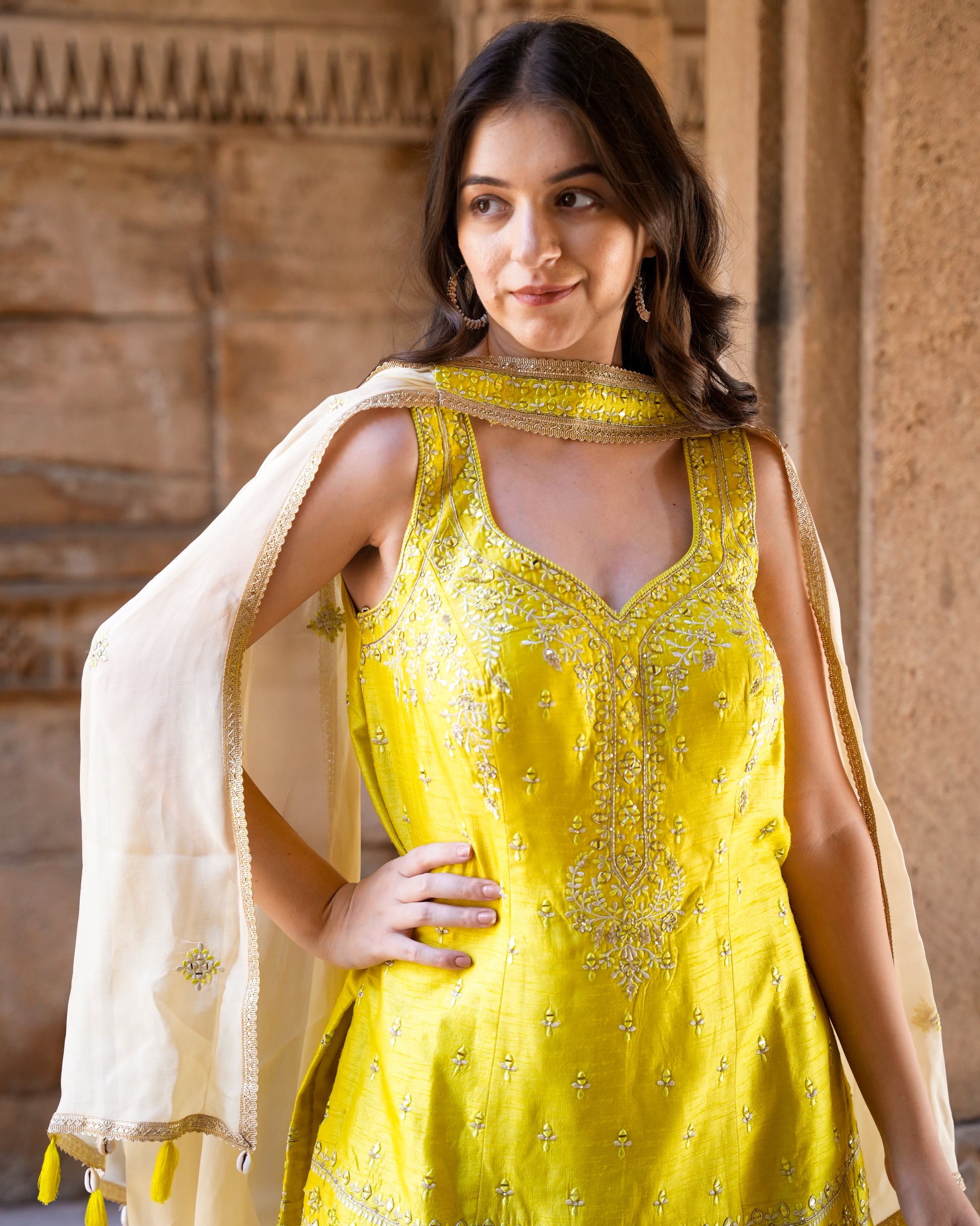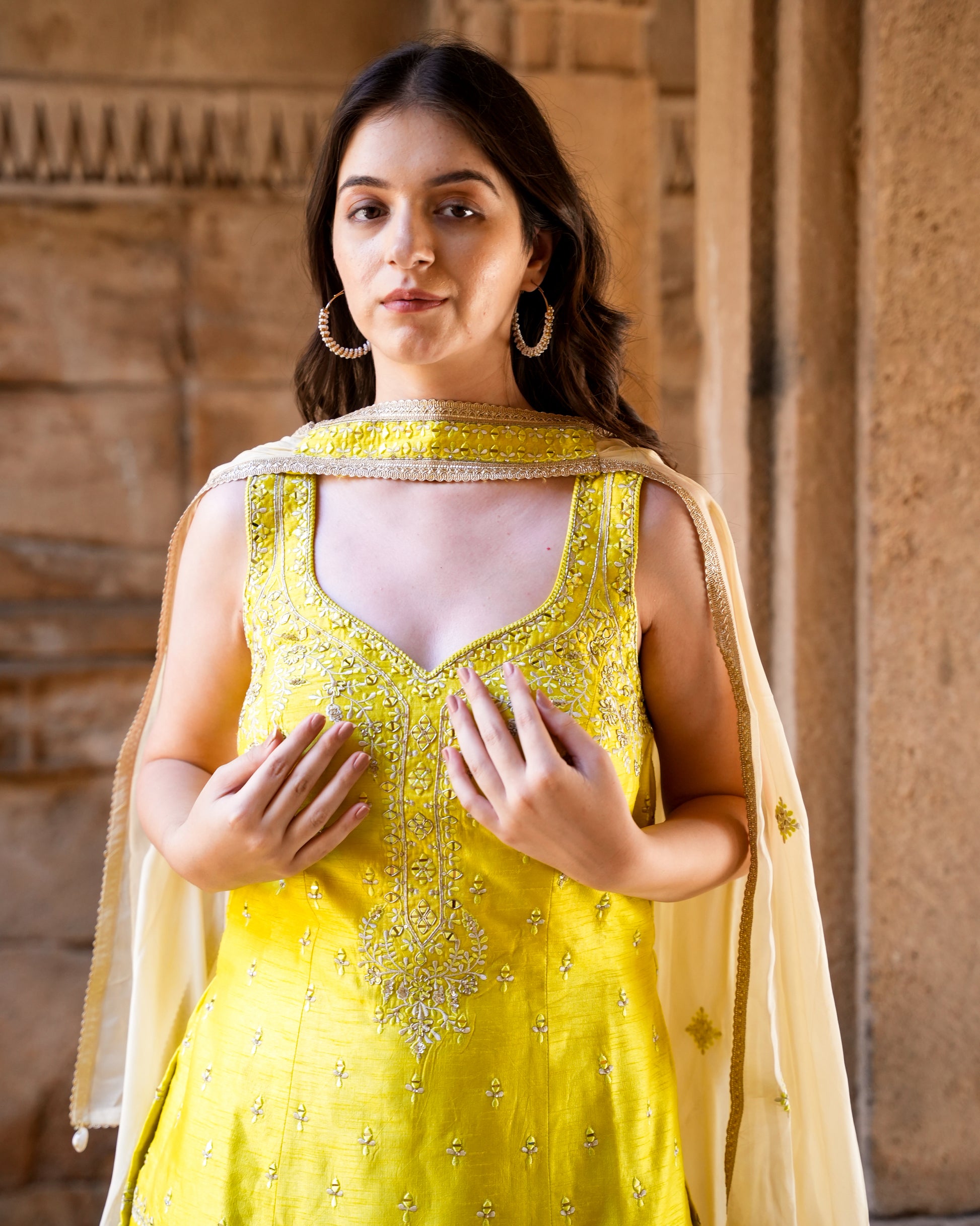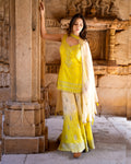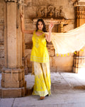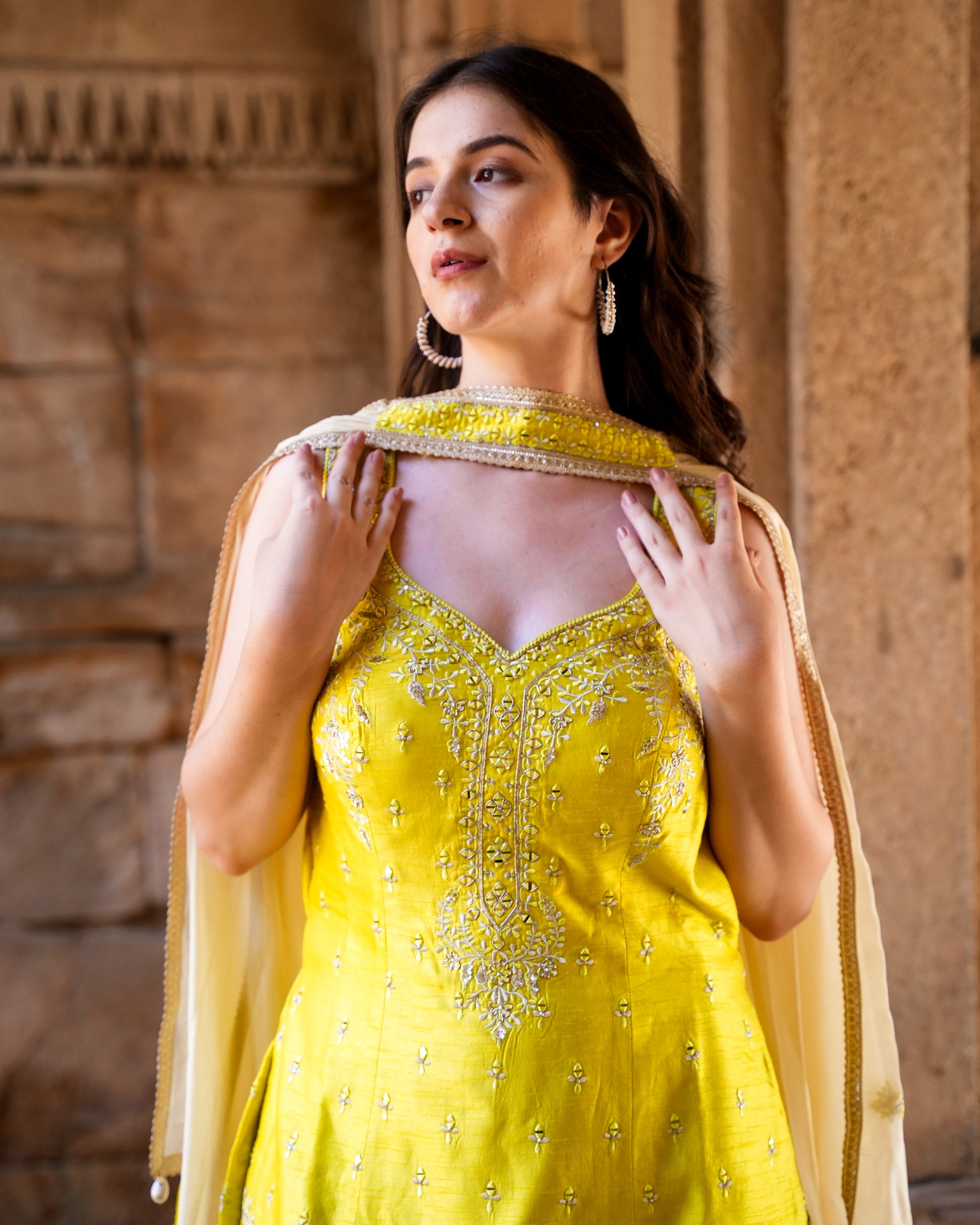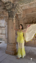 Introducing the fourth creation from the Indie Spark Collection by Kalpana's Creations Sindhubhavan – a striking Lime Yellow Indo-Western ensemble that radiates elegance and vibrancy, making it the perfect choice for sider functions and haldi celebrations.