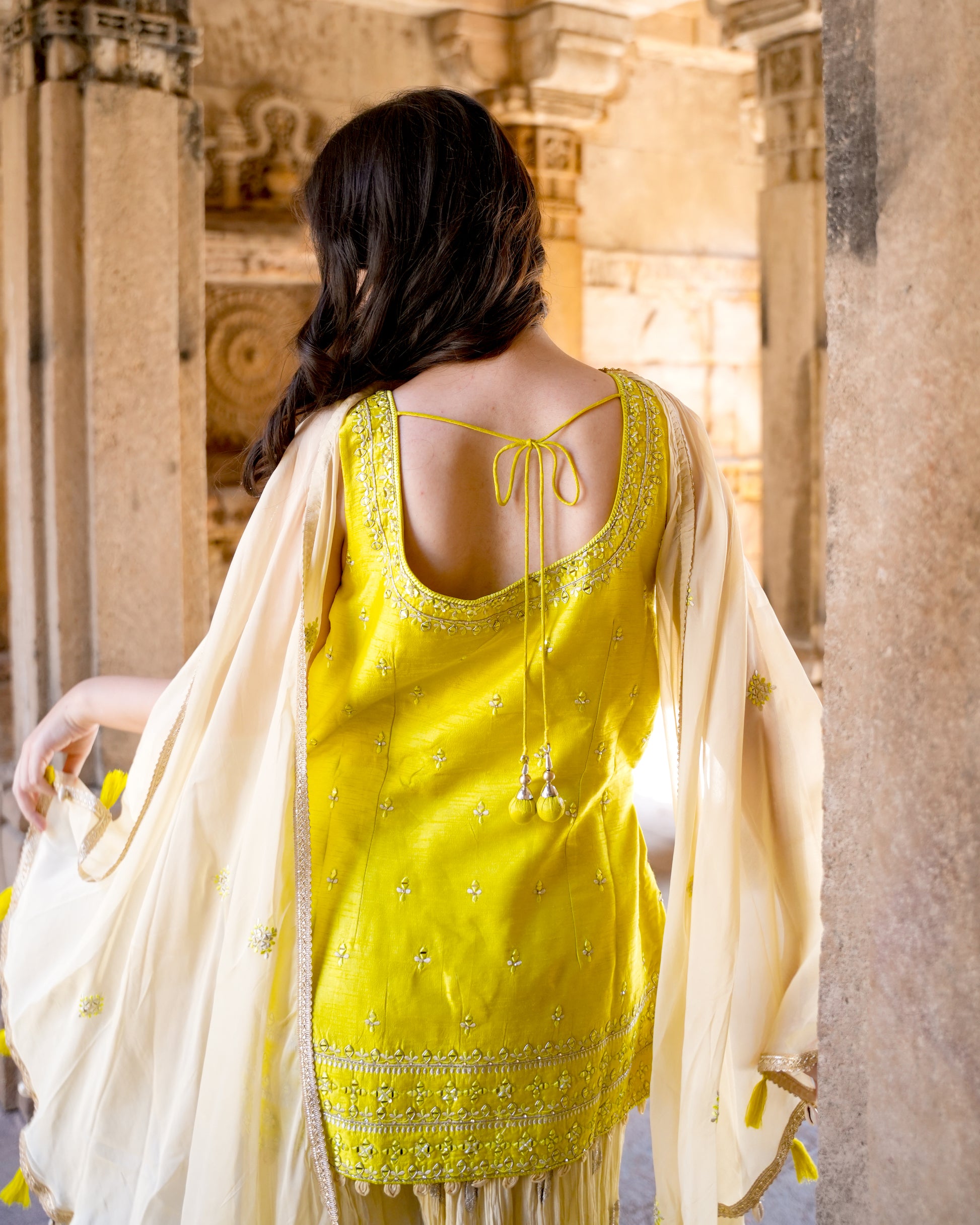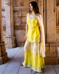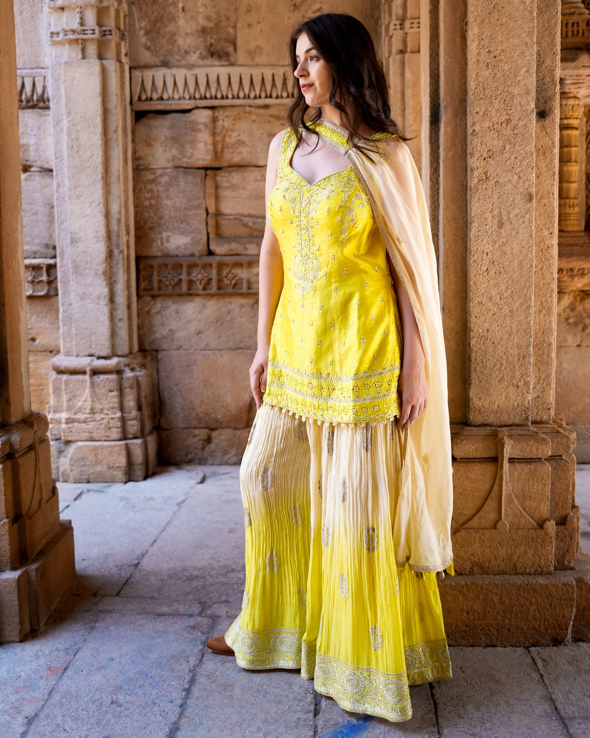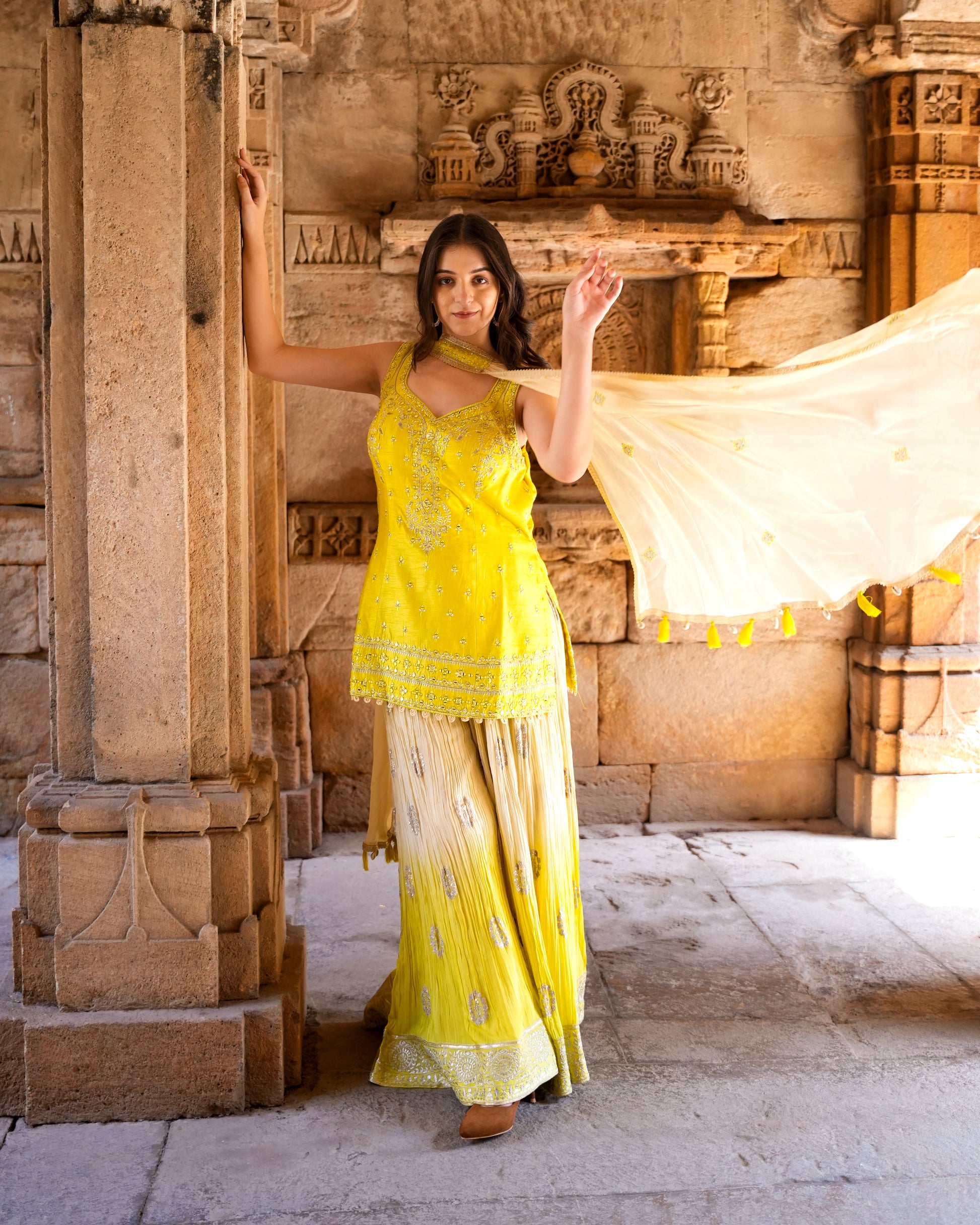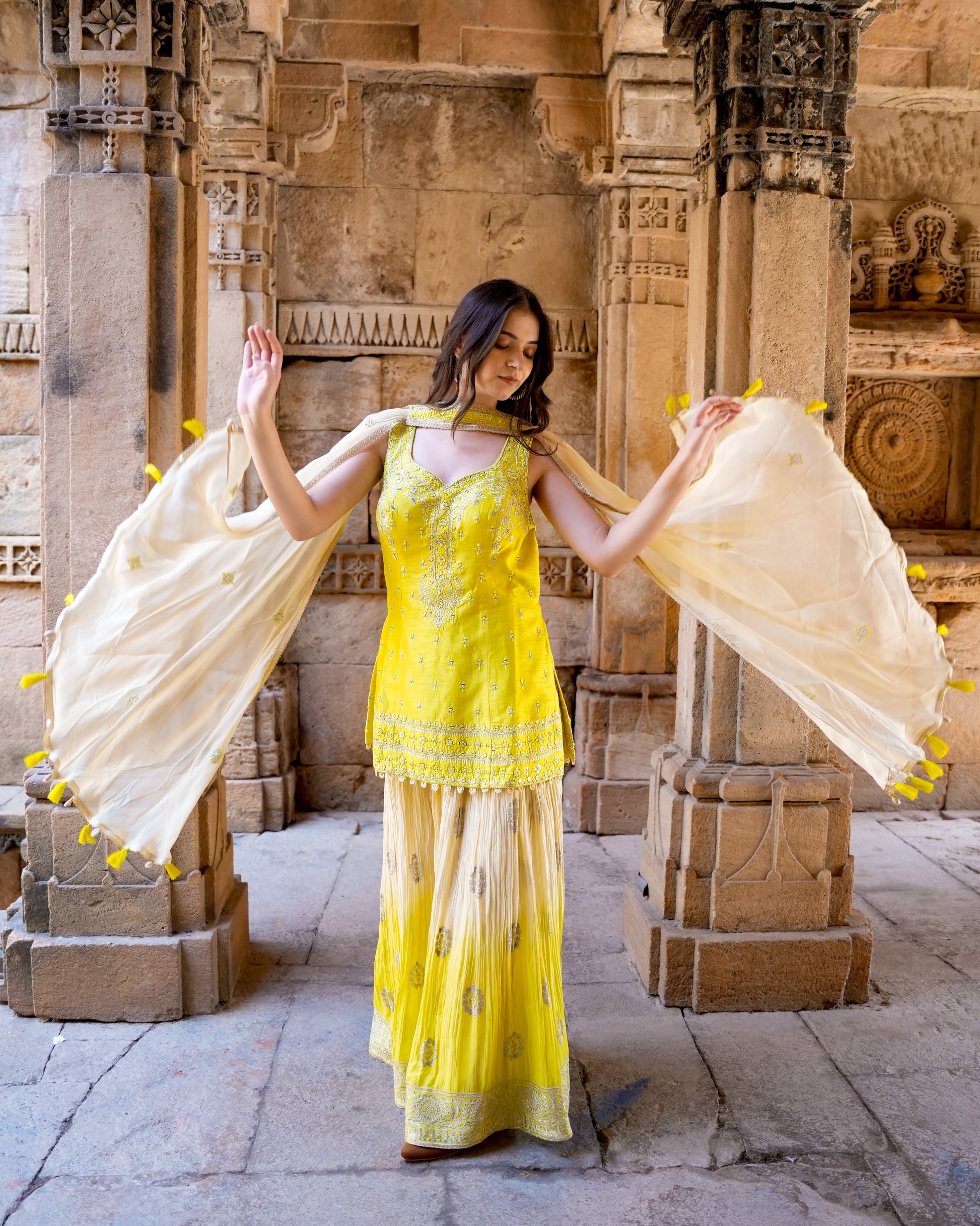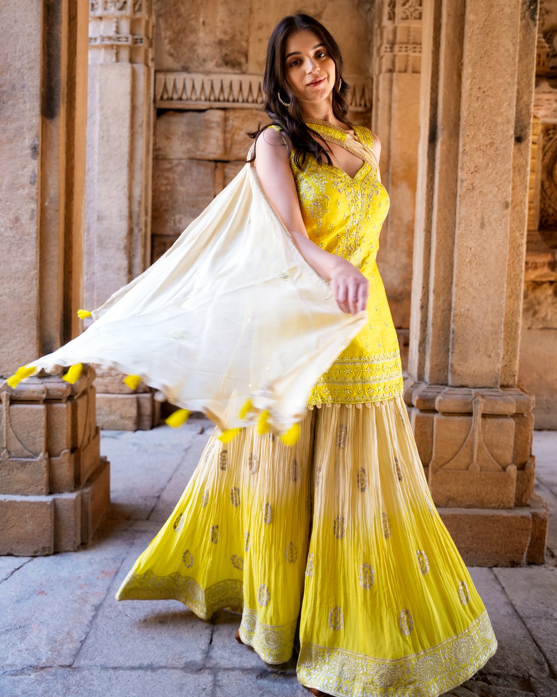 Paired with the top is a unique ombre cream-to-lime yellow ghera palazzo. Designed with a delicate crushed effect, the palazzo flows gracefully with every movement. It features intricate weaving throughout, adding texture and richness that complement the subtle shades of cream and lime yellow, creating a balanced, ethereal look.