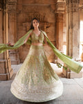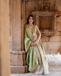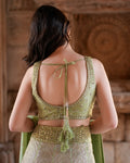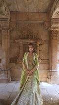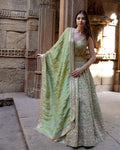 Introducing the seventh masterpiece from the Indie Spark Collection by Kalpana's Creations Sindhubhavan – a dazzling Pista-Colored Fusion Chaniya Choli that combines traditional elegance with a modern flair. This ensemble is designed to captivate with its intricate detailing and luxurious textures, making it a perfect choice for celebrations where sophistication and glamour are key.