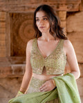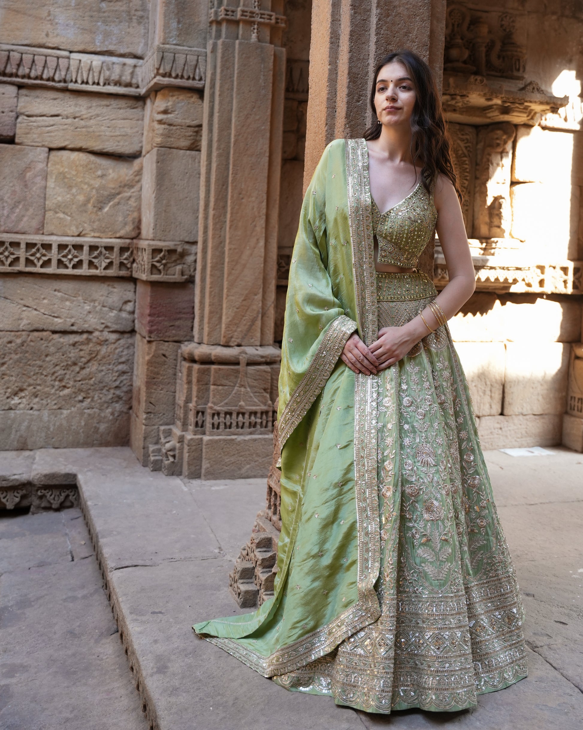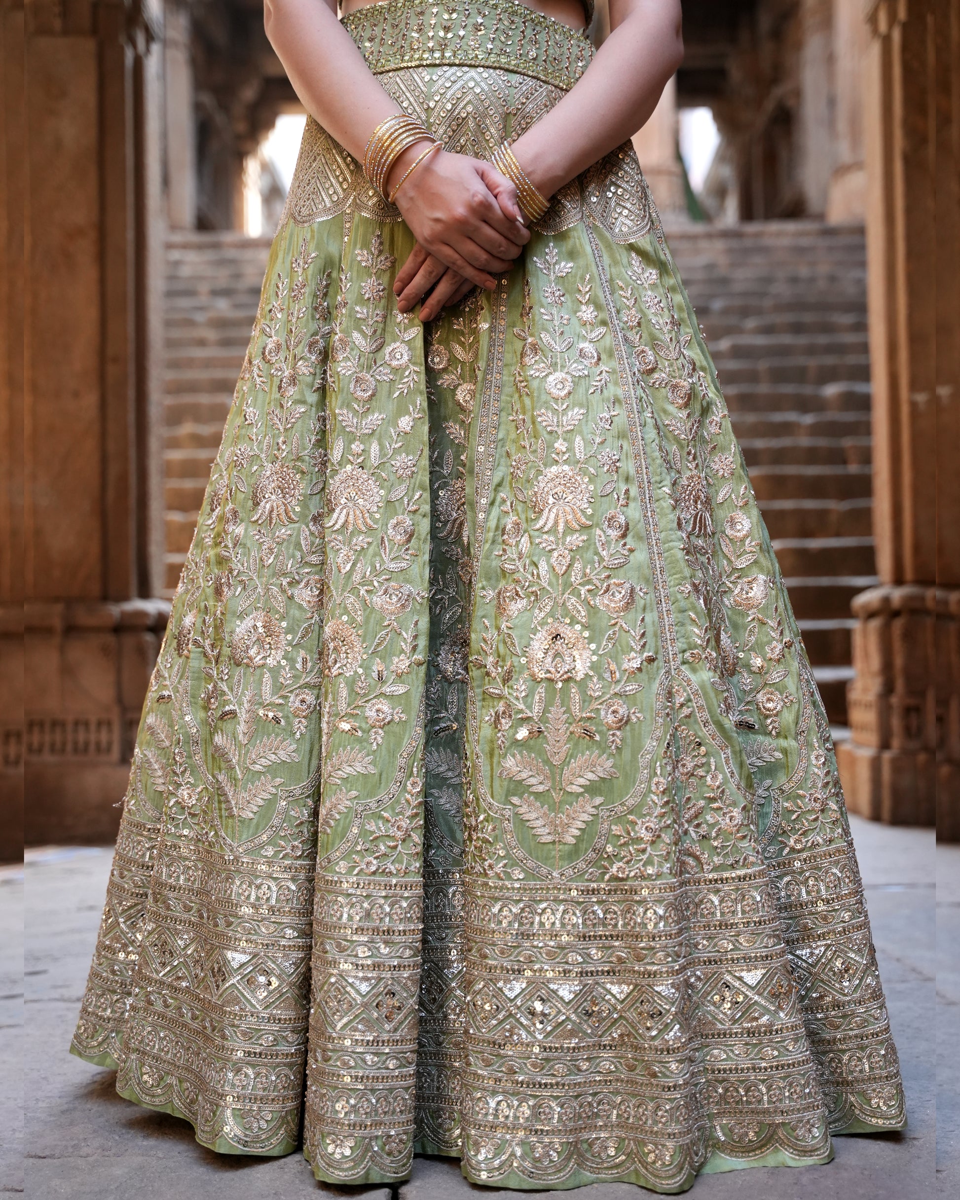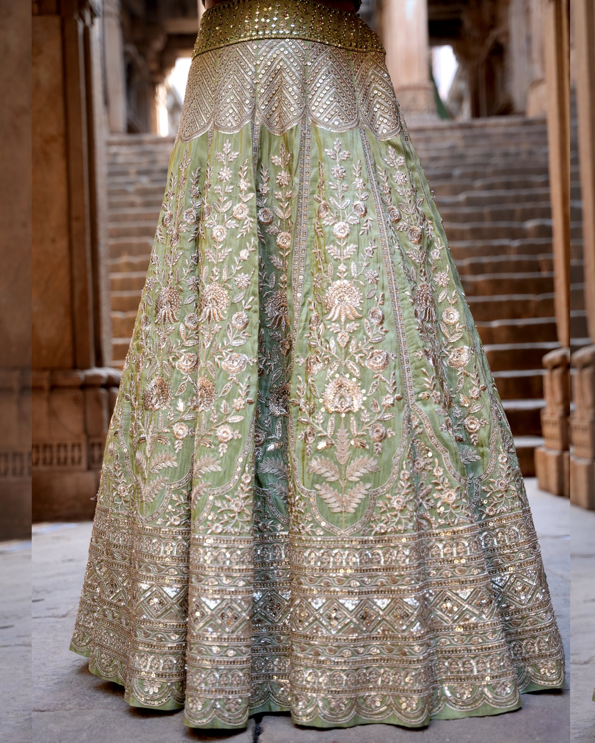 The Chaniya (skirt) is crafted from pure tissue in a soft pista green, lending a refreshing and elegant tone to the outfit. It features intricate hand-embroidery and sequins work throughout, with delicate motifs of flowers, pots, and unique patterns that add depth and cultural richness. Each motif shimmers with finely sequined detailing, creating a beautiful play of light with every movement.