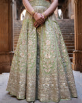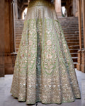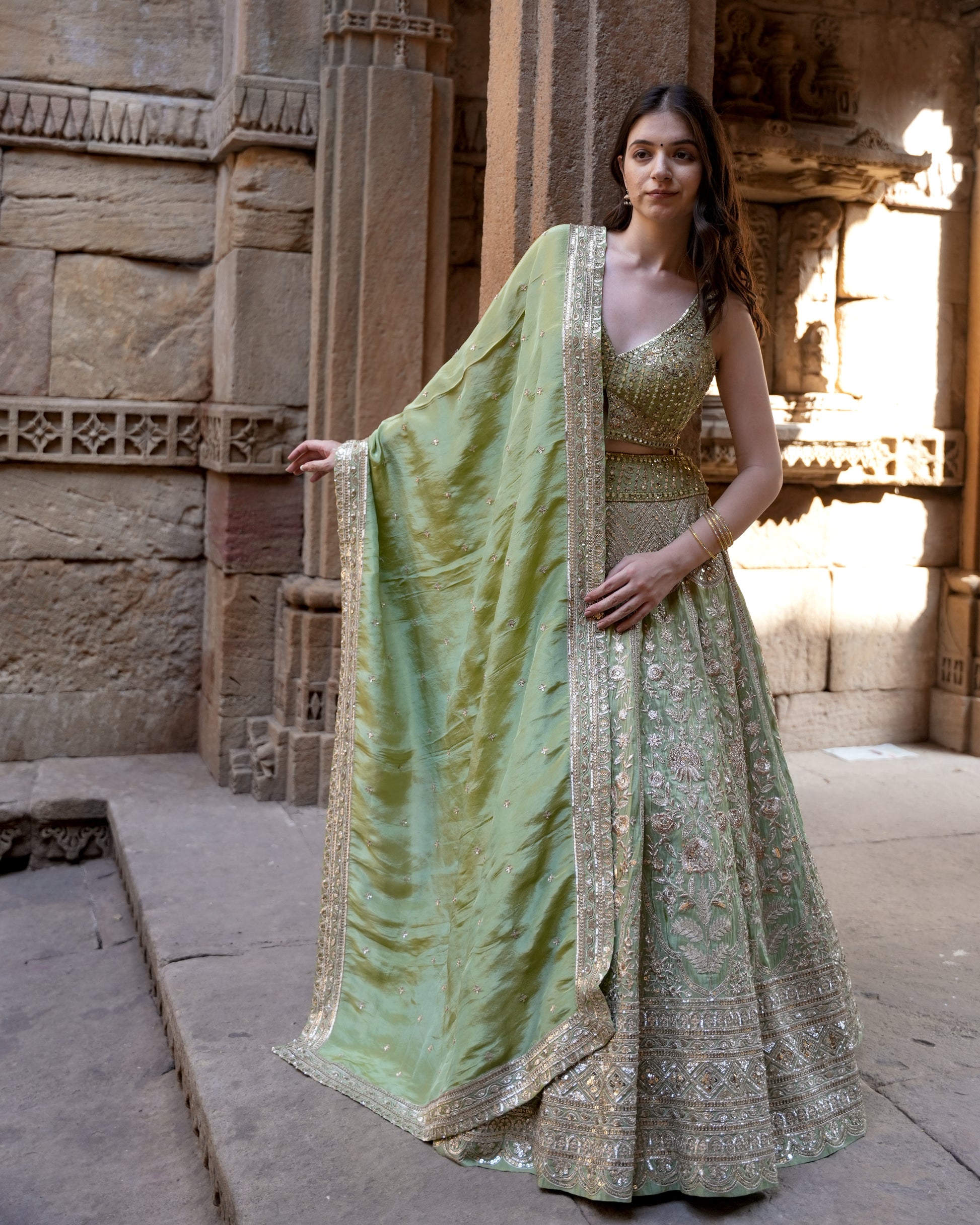 This pista green fusion Chaniya Choli is a beautiful blend of artistry and modern elegance, ideal for festive occasions and grand celebrations where standing out with elegance is essential.