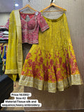 Kalpana’s Creations introduces a stunning designer Indo-Western ensemble that radiates elegance and contemporary flair. This outfit features a luxurious tissue dupatta, a heavy handwork katori cut peplum blouse, and a unique abstract print crush silk chaniya adorned with intricate tikki work. Perfect for special occasions, this chic and artistic creation merges traditional craftsmanship with modern design, offering a one-of-a-kind look.