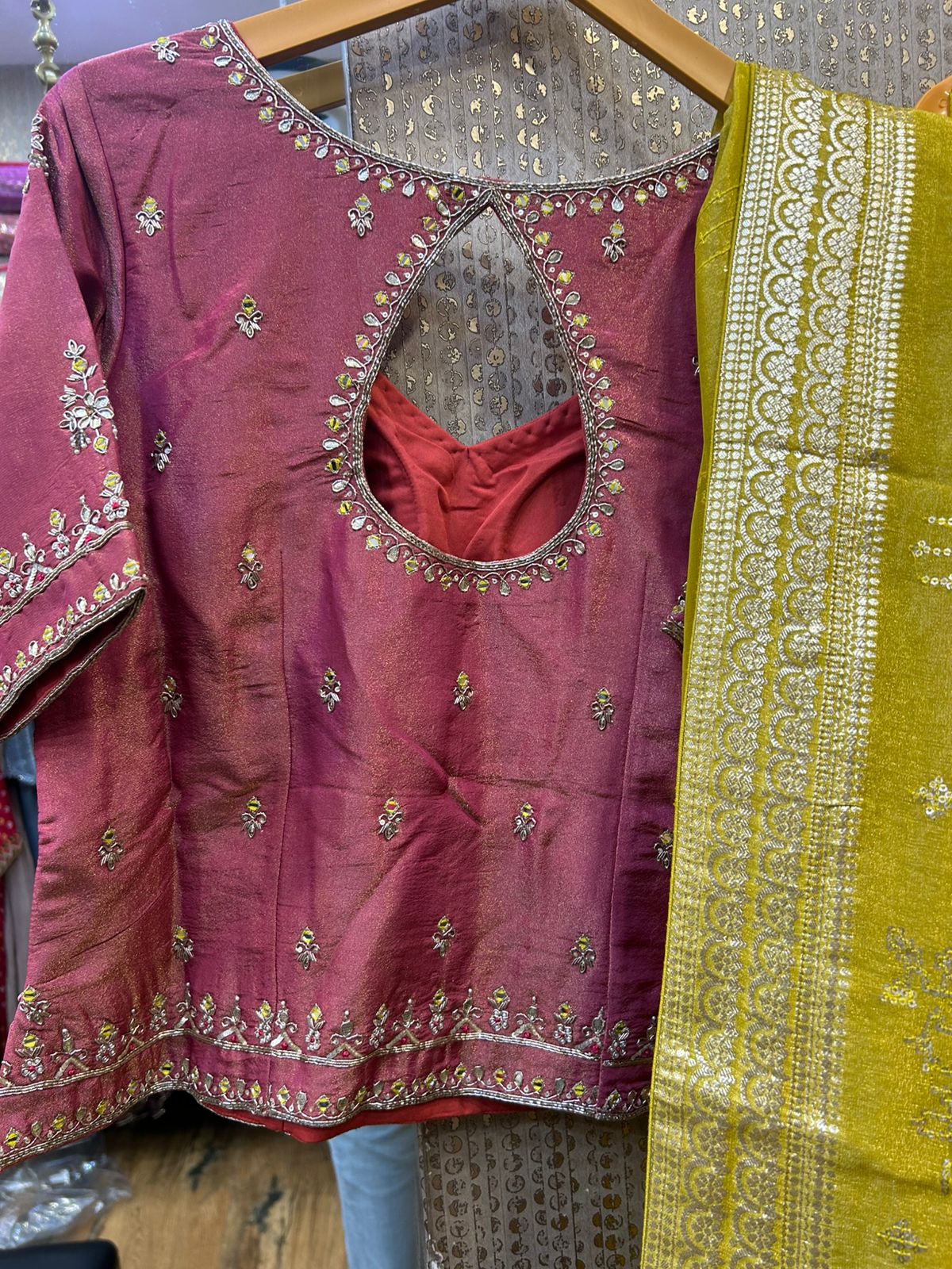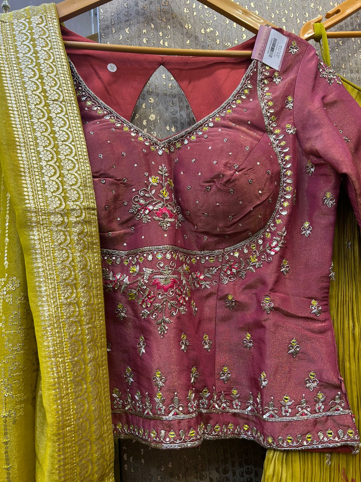 This designer Indo-Western outfit by Kalpana’s Creations is the perfect blend of traditional craftsmanship and contemporary style. The luxurious tissue dupatta, hand-embellished katori cut peplum blouse, and the abstract print chaniya with tikki work come together to form a truly unique ensemble. Ideal for weddings, festive occasions, and high-profile events, this chic fusion outfit is designed for the modern woman who values individuality, elegance, and timeless fashion.