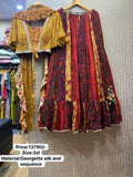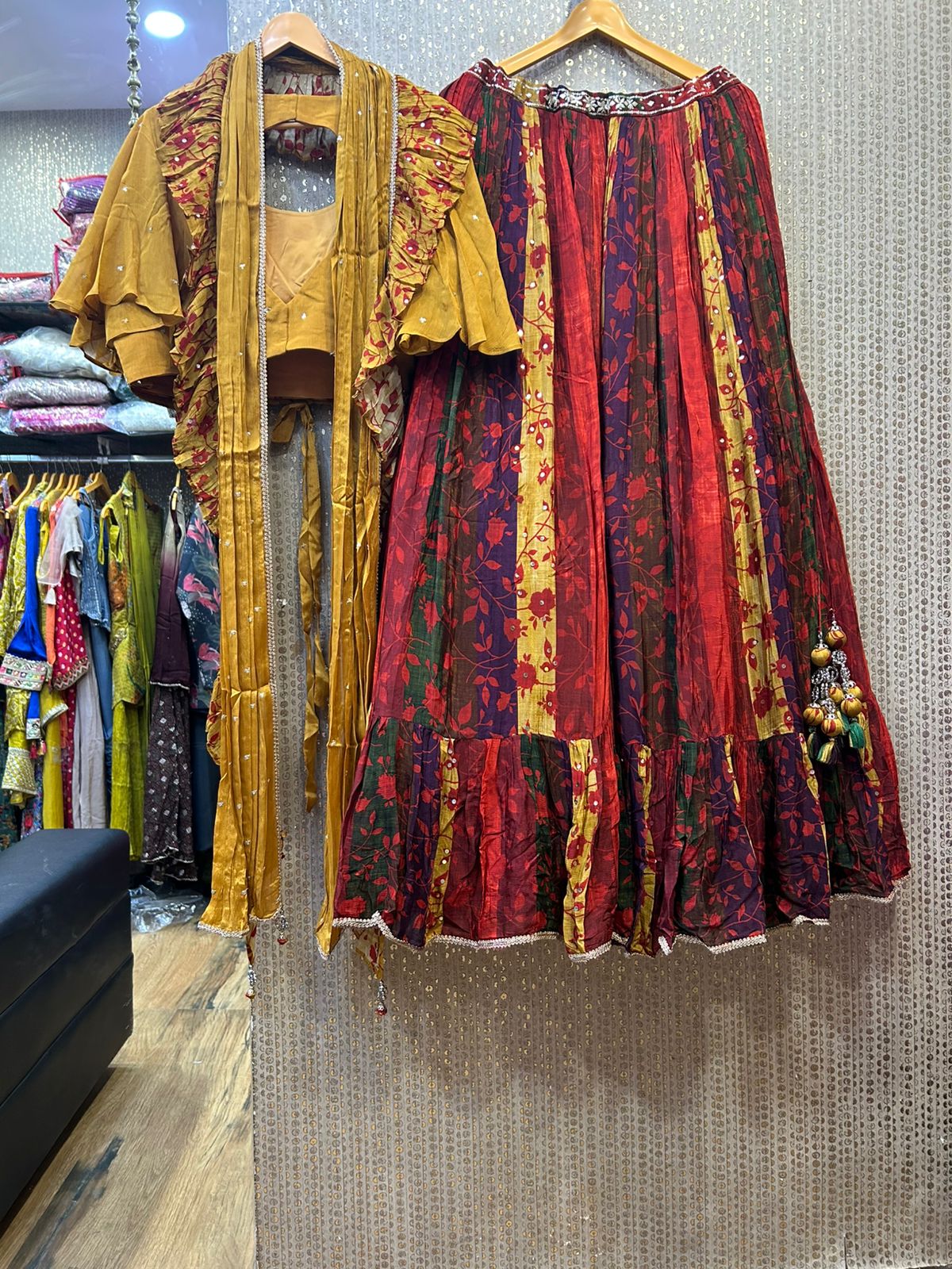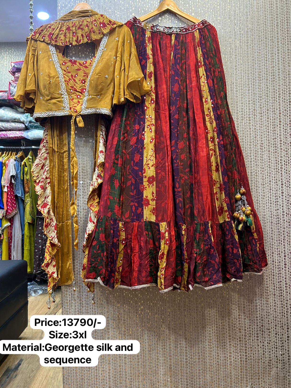 The flowing georgette chaniya (skirt) is the highlight of this ensemble, adorned with vibrant abstract prints that bring a dynamic and artistic touch to the design. The lightweight fabric offers effortless movement, creating a graceful silhouette that is both comfortable and eye-catching. The multi-print design adds a bold, contemporary flair, making this chaniya the perfect base for a fashion-forward Indo-Western look.
