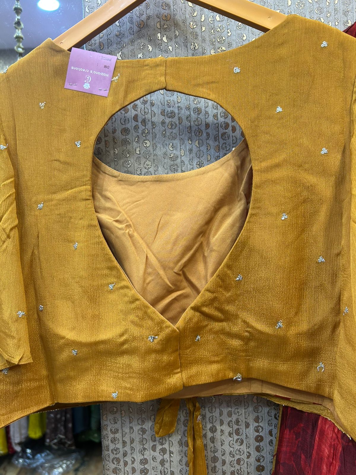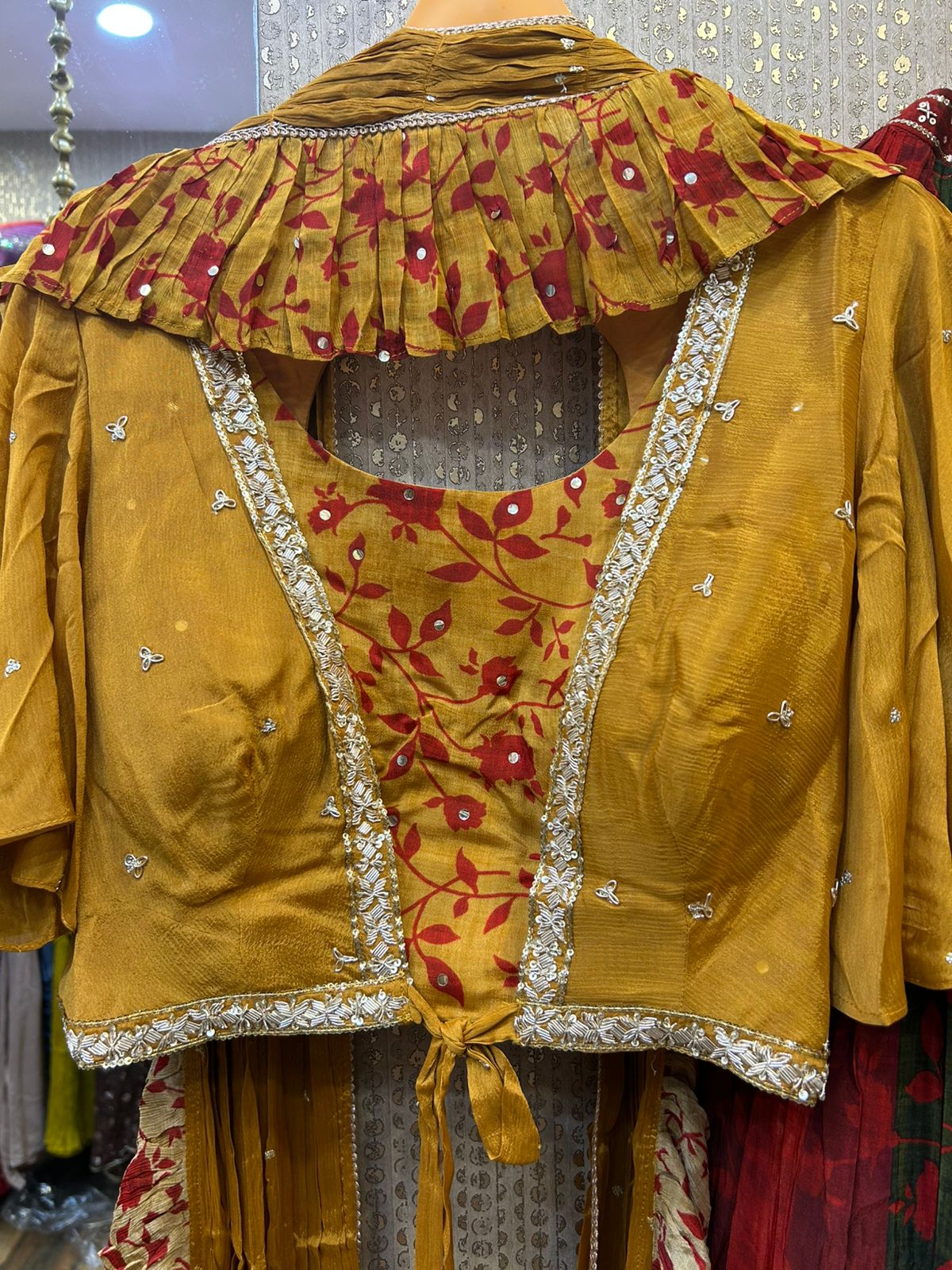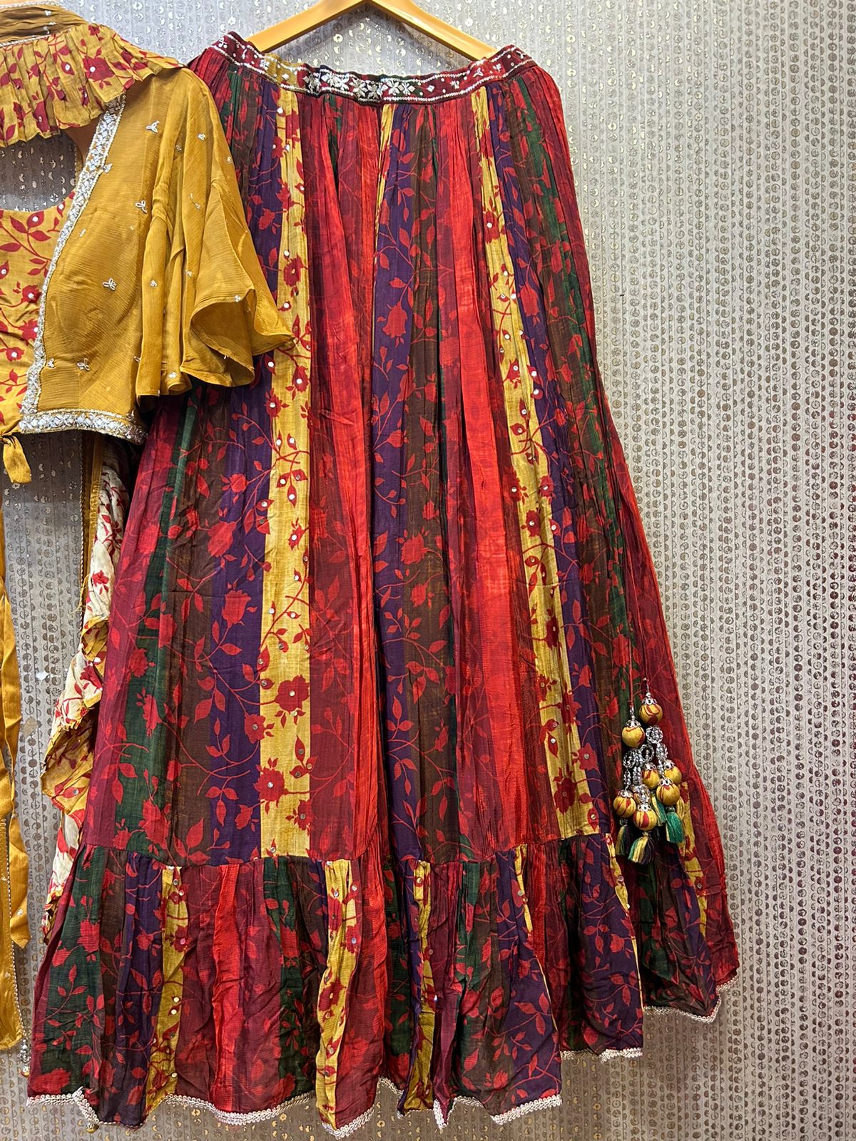 Paired with the chaniya is a stylish blouse featuring dramatic ruffle sleeves, giving the outfit a playful, modern twist. The blouse is further elevated by delicate handwork, adding intricate detailing to the chic design. The ruffle sleeves create a bold and fashionable statement, while the fitted bodice flatters the figure, ensuring a perfect balance between elegance and trendiness.
