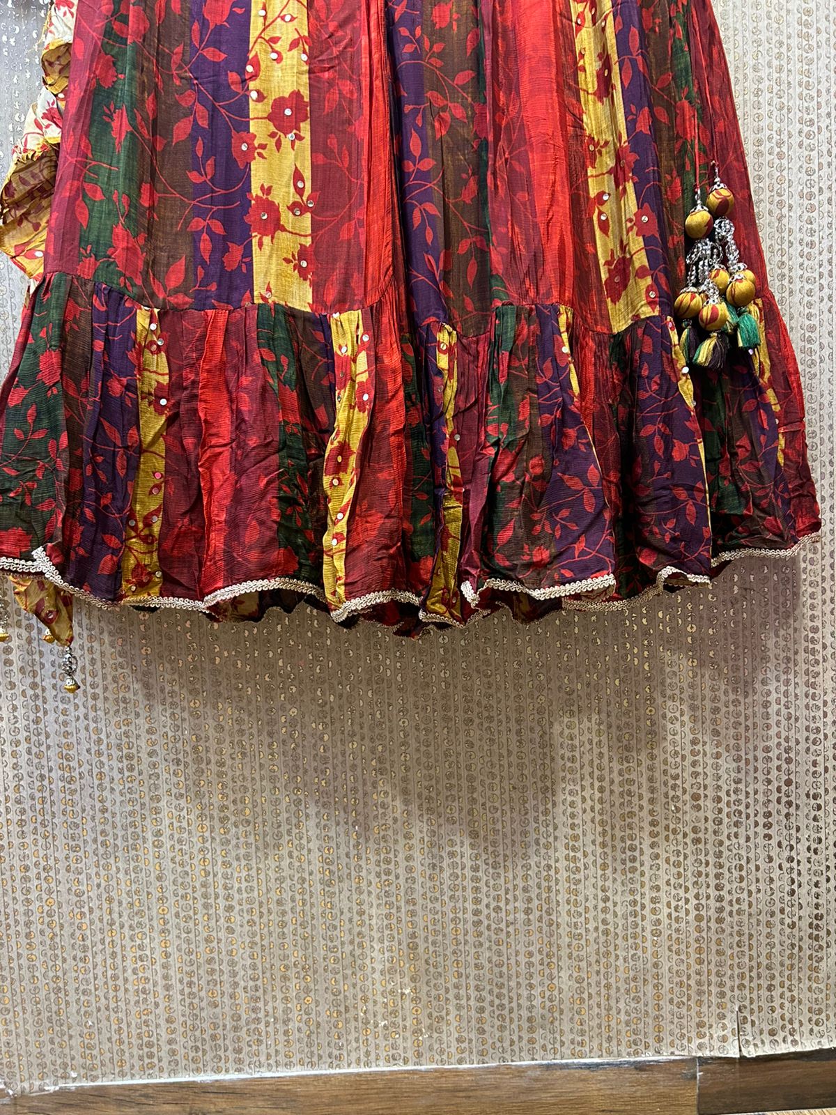 This Indo-Western creation by Kalpana’s Creations is the epitome of modern chic. The abstract printed georgette chaniya, the statement-making ruffle-sleeved blouse with intricate handwork, and the elegant silk dupatta come together to form a stylish and sophisticated ensemble. Perfect for festive celebrations, weddings, or formal events, this outfit is designed for the contemporary woman who loves to make a bold fashion statement while honoring her roots.