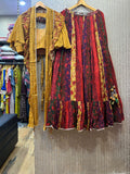 Kalpana’s Creations introduces a stunning designer Indo-Western ensemble featuring an abstract multi-print georgette chaniya, a ruffle-sleeved blouse with intricate handwork, and a soft silk dupatta. This outfit is the perfect blend of contemporary style and traditional charm, offering a fresh, modern chic look for any occasion.