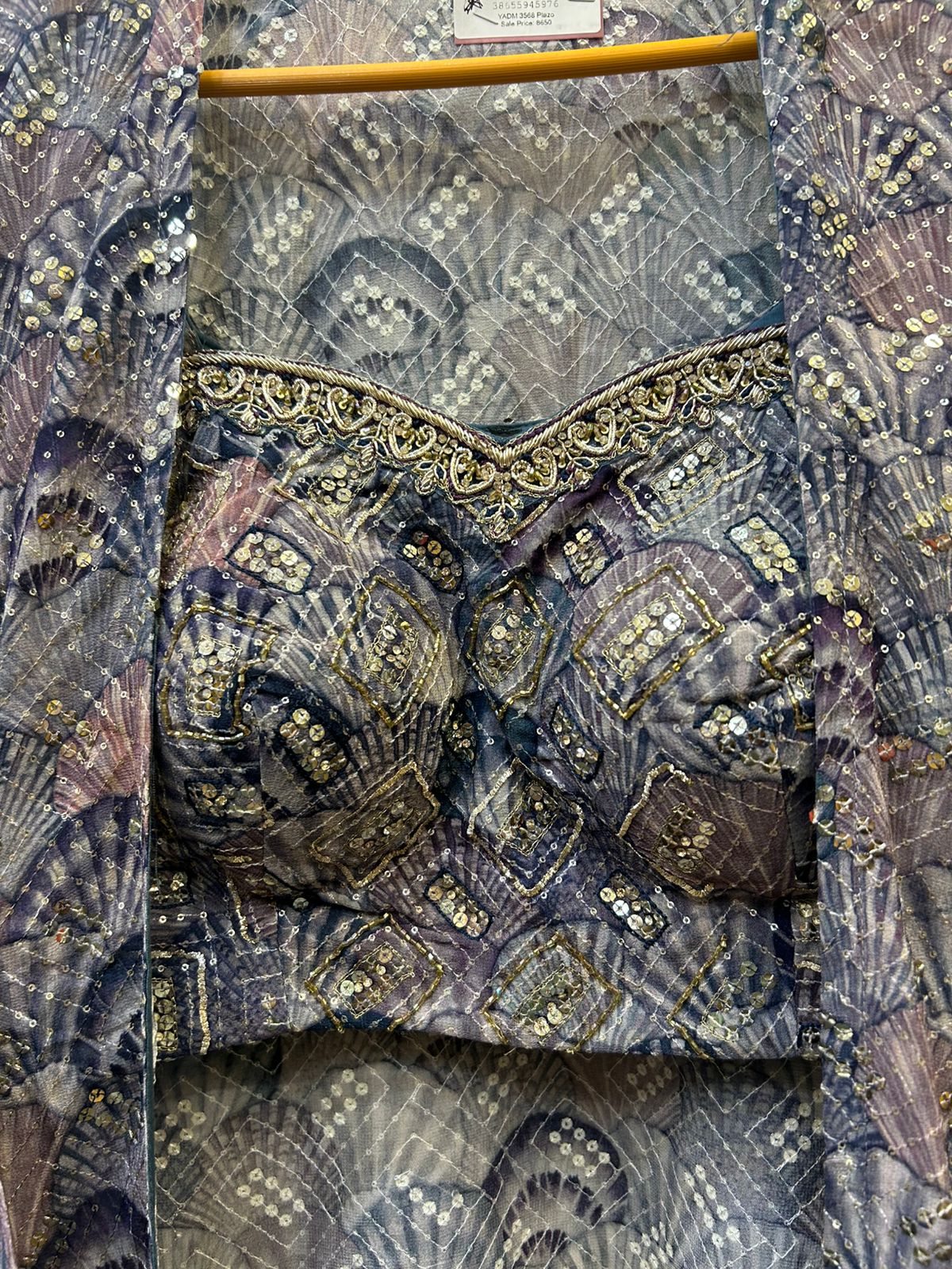 The crowning piece of this look is the pure georgette jacket, meticulously designed with heavy tikki work. The flowing georgette fabric drapes elegantly over the outfit, adding a layer of refinement and glamour. The intricate tikki embellishments scattered across the jacket create a dazzling effect, while the open-front style maintains a chic, contemporary feel. The jacket’s lightweight, sheer texture adds an ethereal touch, balancing the heavier elements of the outfit for a perfect fusion of modern and traditional aesthetics.