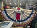 The golden elements bring a touch of richness and elegance, complemented by the cool tones of silver and blue, creating a harmonious contrast against the creamy backdrop. The design itself might include traditional motifs or patterns that are characteristic of cultural or festive attire, adding a celebratory and ornate feel to the garment.