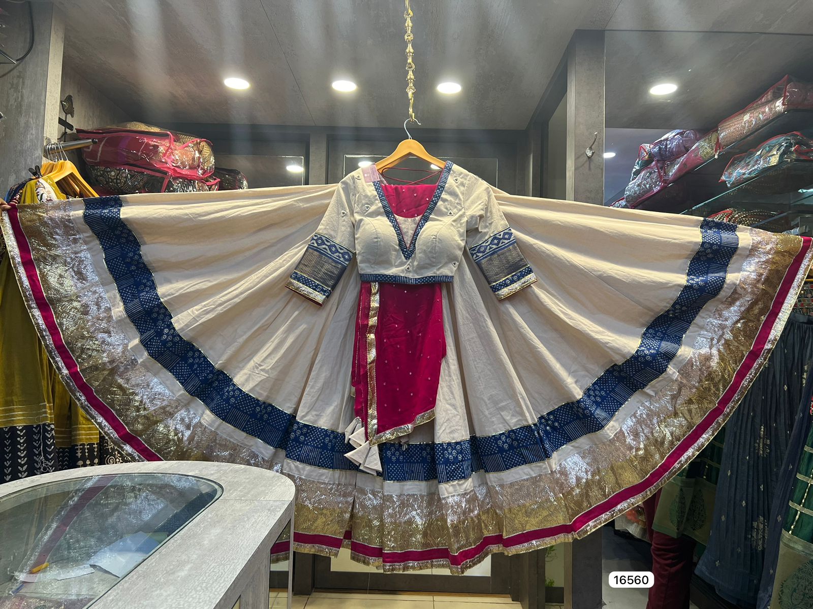 A 10-meter cotton chaniyo in a cream color serves as the canvas for an intricate and vibrant design. The lower part of the chaniyo features a blend of golden, silver, and blue colors, intricately woven or embroidered into the fabric.