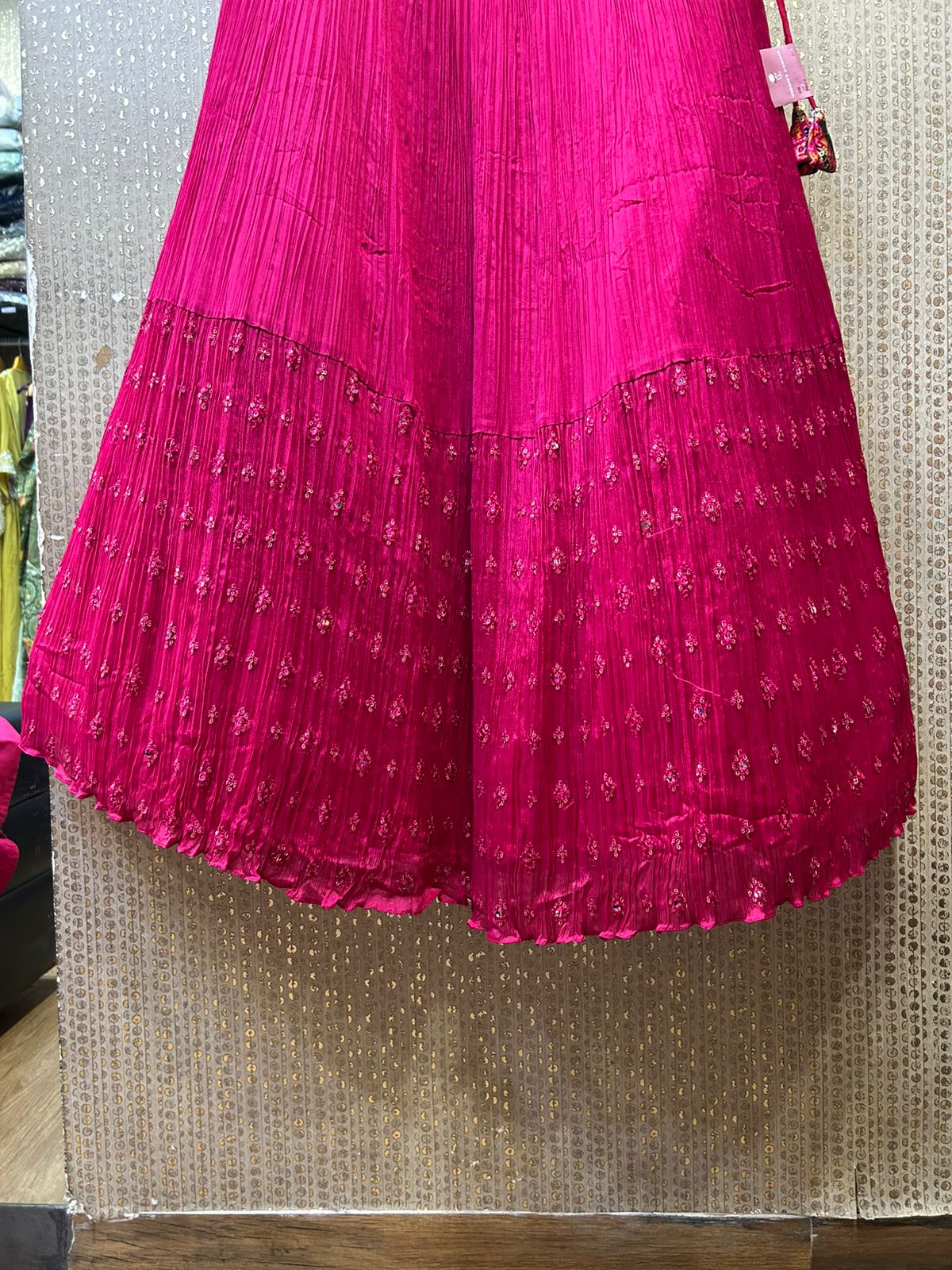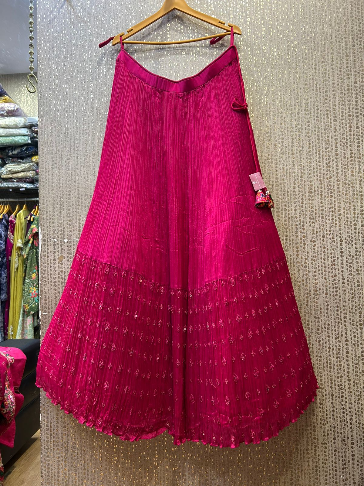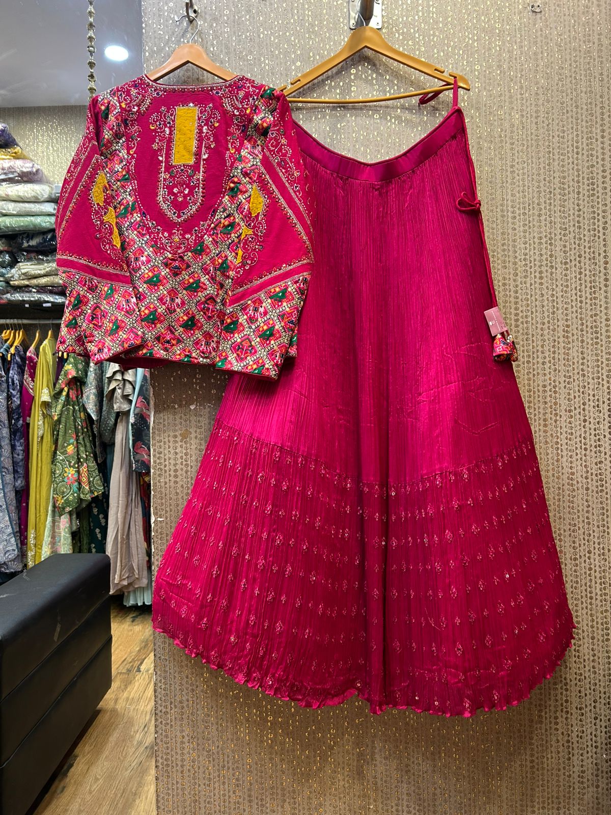 The focal point of this outfit is the intricately designed Zardosi and sequin Chaniya. Crafted from luxurious fabric, this Chaniya features elaborate Zardosi embroidery and shimmering sequin details that create a dazzling effect. The flow of the skirt ensures graceful movement, while the rich textures and intricate embellishments make it a showstopper. This Chaniya exudes elegance and sophistication, perfect for a modern, fashion-forward look.