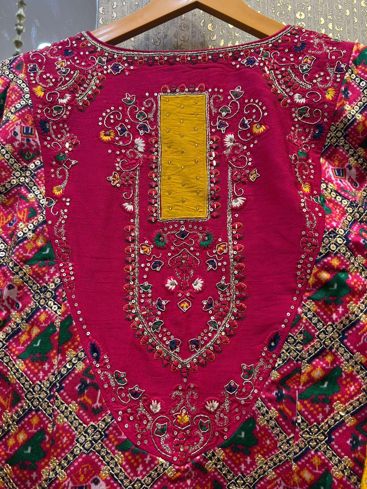 Elevating the outfit further is the striking Patola Koti, a nod to traditional craftsmanship with a modern edge. The Patola Koti, with its vibrant patterns and rich colors, adds a layer of sophistication and depth to the ensemble. Its structured design contrasts beautifully with the flowing Chaniya and delicate blouse, creating a balanced and harmonious look that is both unique and stylish.