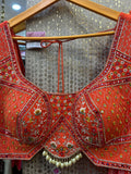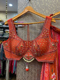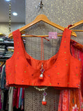 The fancy spaghetti blouse adds a modern flair to the traditional Chaniya. Featuring delicate mirror work, the blouse glimmers with subtle reflections, enhancing the overall allure of the outfit. The sleek spaghetti straps introduce a contemporary edge, while the mirror detailing ties back to the traditional elements of the Chaniya. This blouse beautifully balances the opulence of the Zardosi work, creating a chic, stylish contrast.