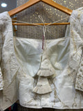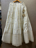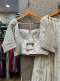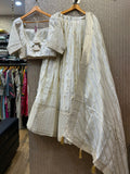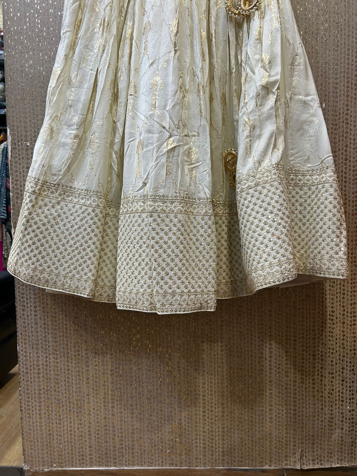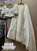 The luxurious Banarasi silk Chaniya is the centerpiece of this ensemble, adorned with delicate sequin work that adds a subtle shimmer. The rich texture of the silk combined with the sparkling sequins creates an opulent and graceful look. Its flowing silhouette enhances the elegance, making it a standout piece for weddings, festive events, or evening celebrations.