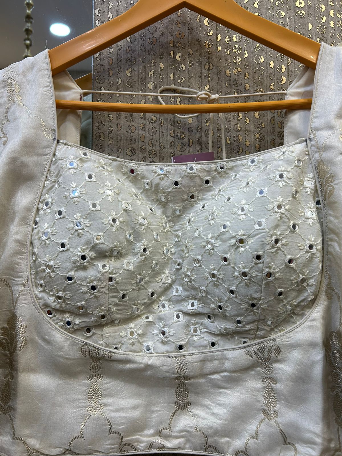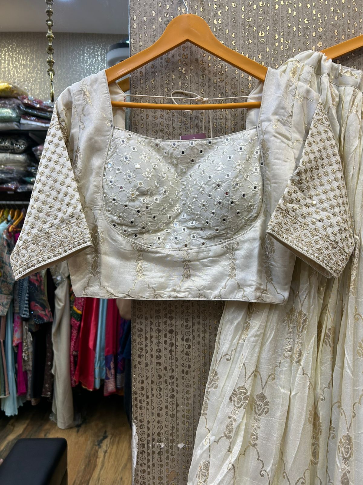 Paired with the Chaniya is a fancy blouse adorned with intricate mirror work, adding a vibrant, contemporary touch. The mirror details reflect light in a way that complements the soft sheen of the sequin Chaniya, creating a cohesive yet striking look. The fancy design of the blouse adds a modern edge to the traditional Banarasi silk, making the outfit versatile and chic.