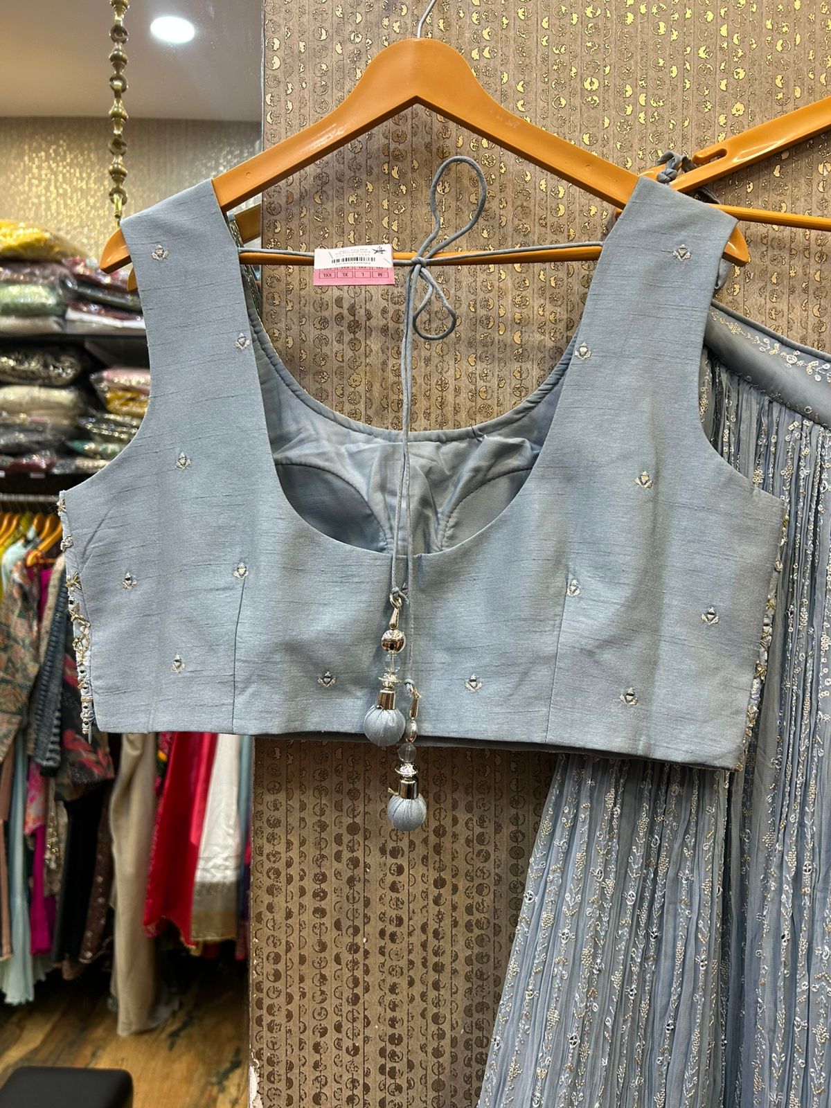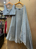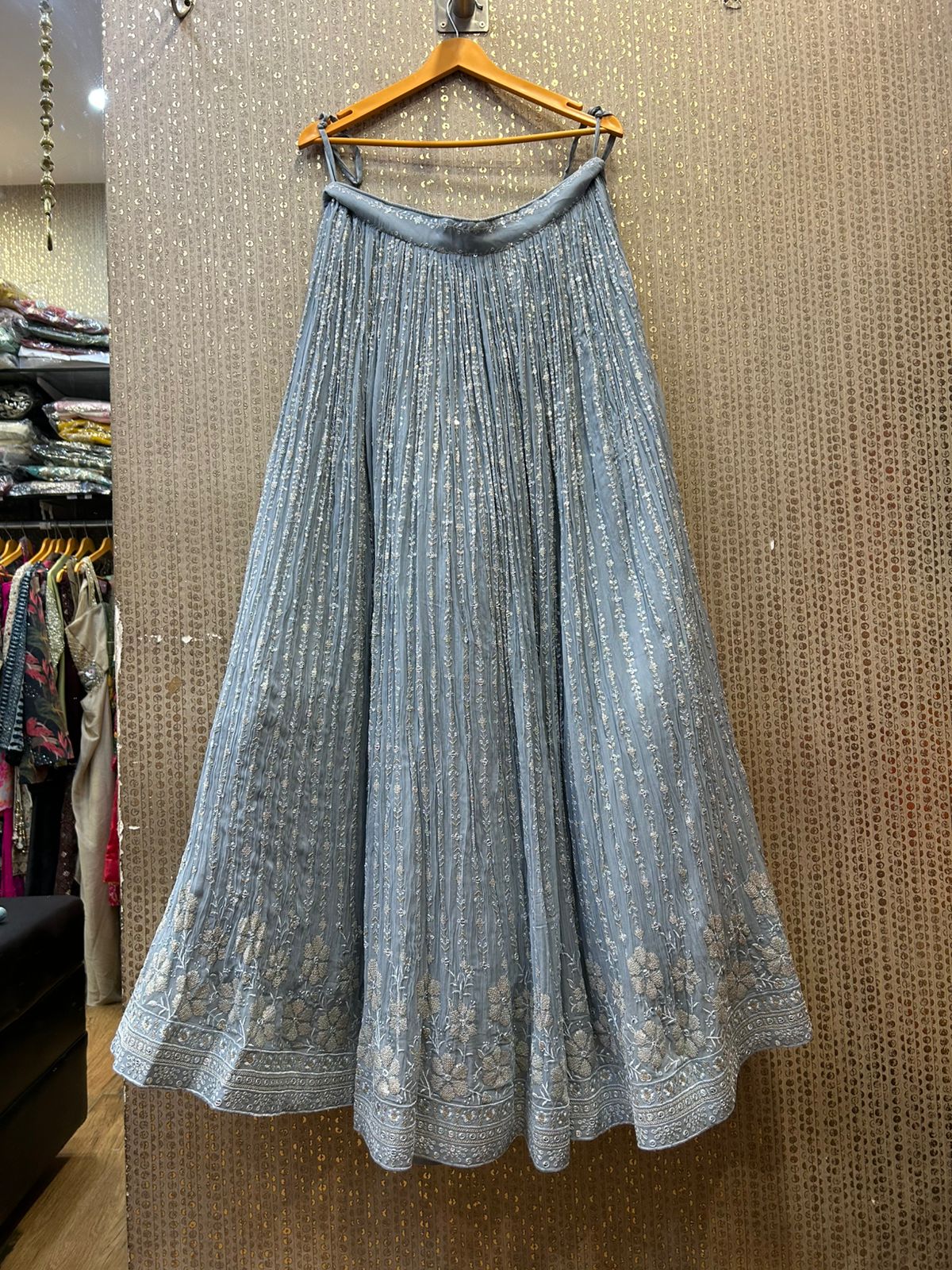 Paired with the Chaniya is a fancy spaghetti blouse, featuring delicate mirror work that adds a contemporary sparkle. The sleek spaghetti straps lend a modern, chic vibe, while the mirror detailing enhances the blouse’s stylish appeal. This combination of sleek lines and reflective mirrors creates a bold yet elegant contrast with the richly embroidered Chaniya.