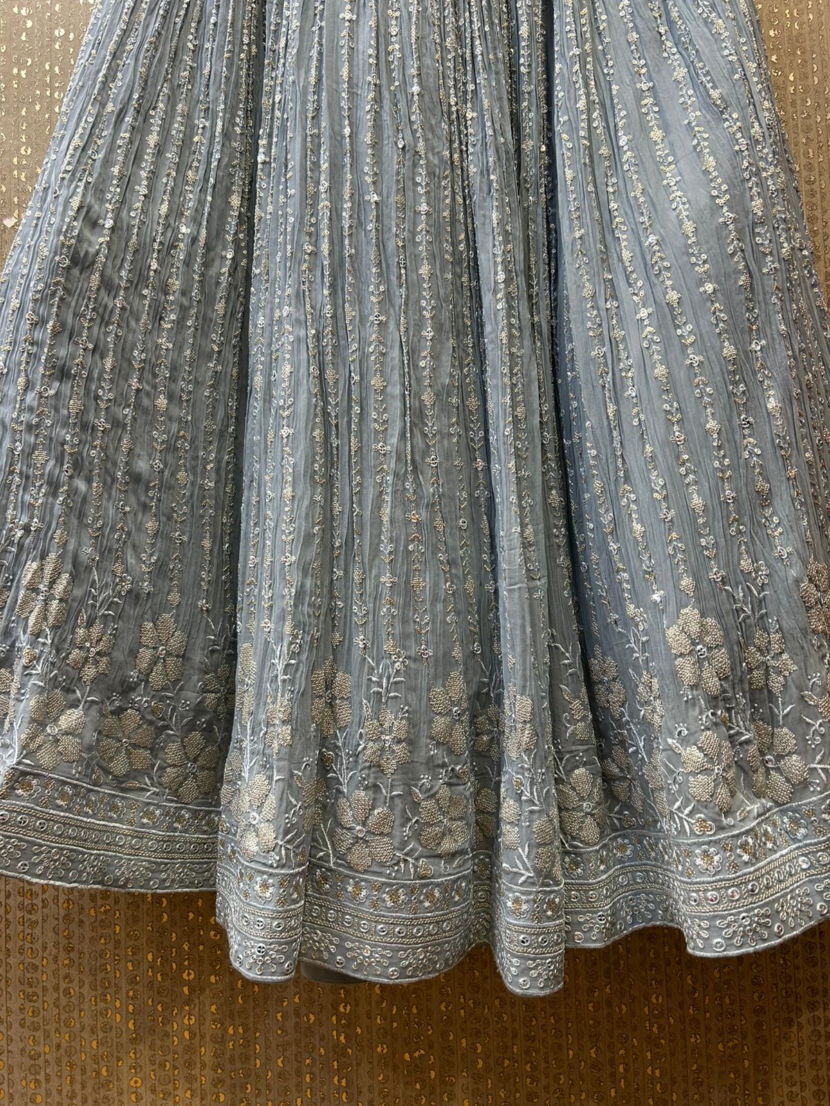 The star of this outfit is the georgette Chaniya, meticulously adorned with Zardosi and Katdana work. The lightweight georgette fabric drapes beautifully, giving the Chaniya a fluid, graceful movement. The intricate Zardosi embroidery and sparkling Katdana embellishments create a luxurious texture, adding a touch of opulence and making it perfect for special occasions.