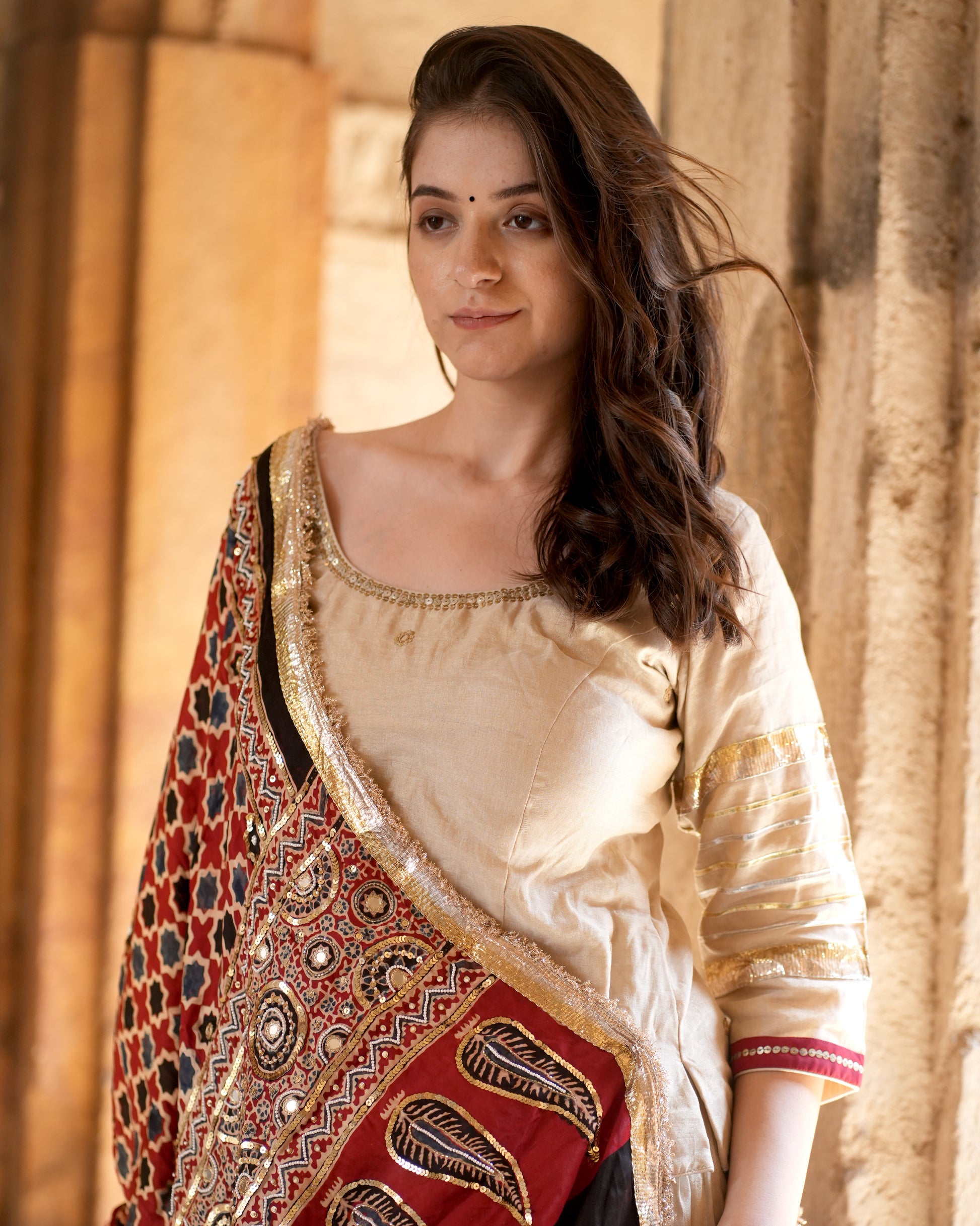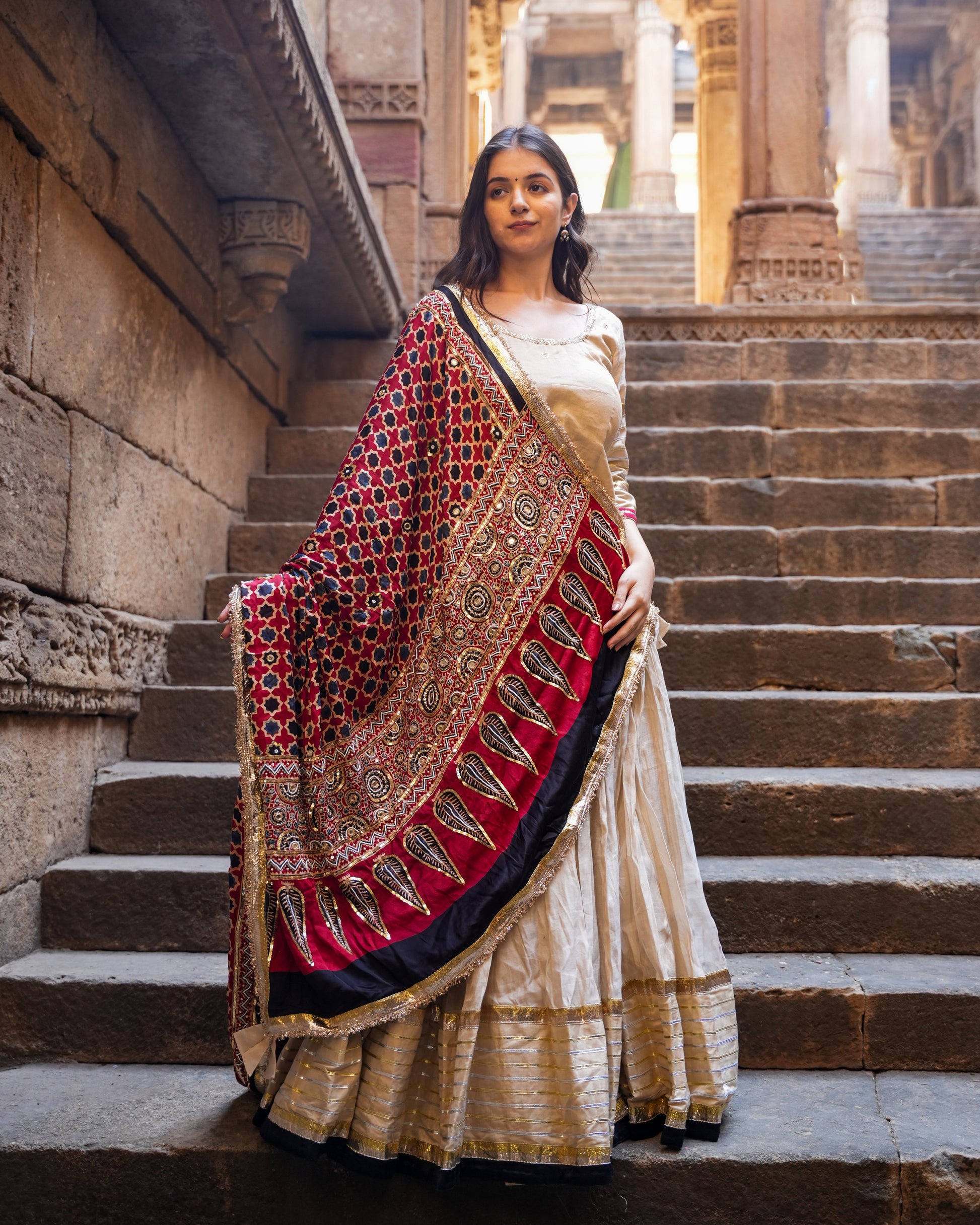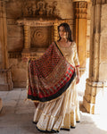 The ensemble is completed by a luxurious pure modal silk Ajrakh dupatta, a masterpiece on its own. This dupatta features all-over heavy handwork, delicate khat work, and intricate zardosi detailing, bringing a hint of shimmer and artistry that contrasts beautifully with the serene base tones. The rich Ajrakh patterns add depth and cultural heritage, making a bold statement in the most graceful way.