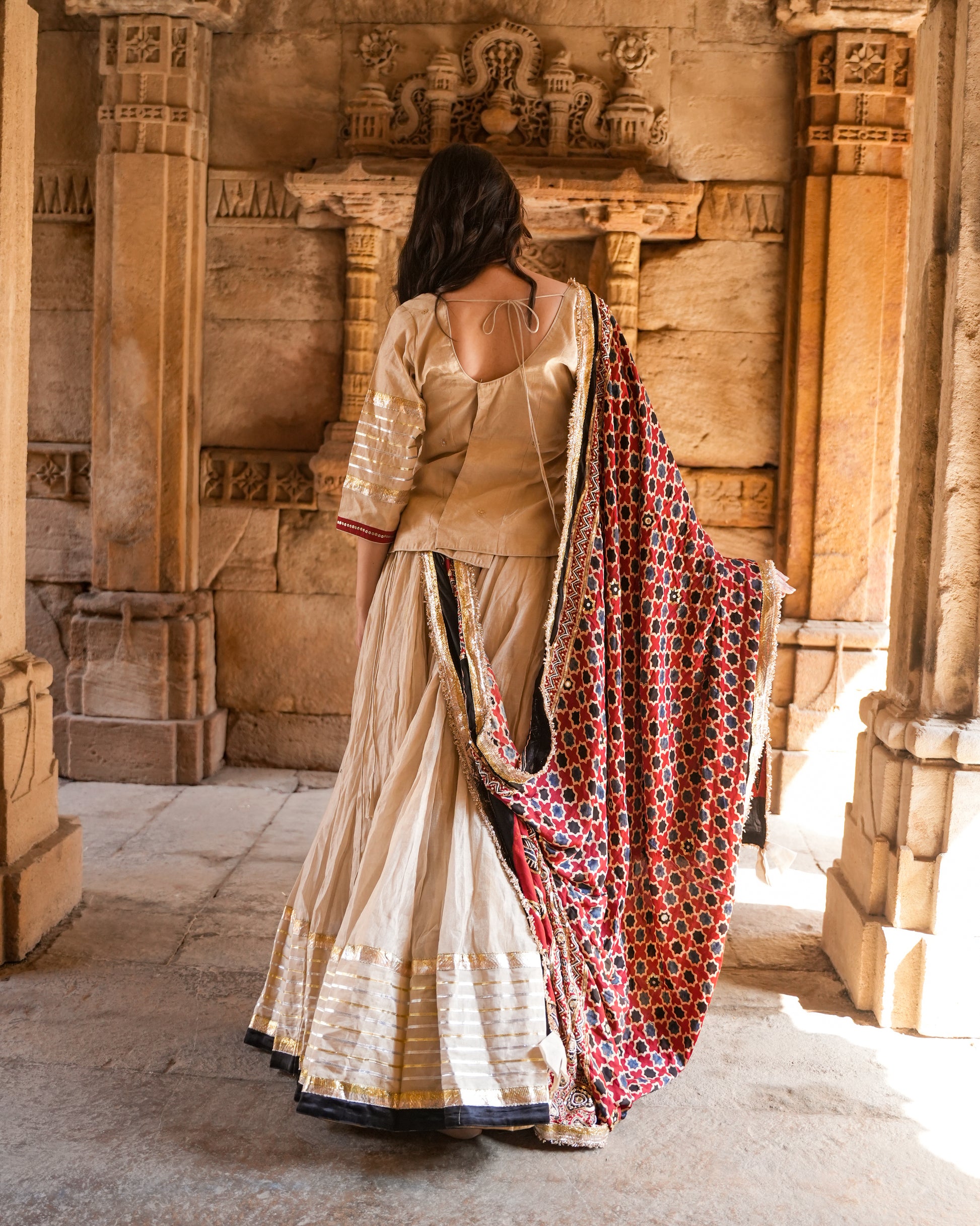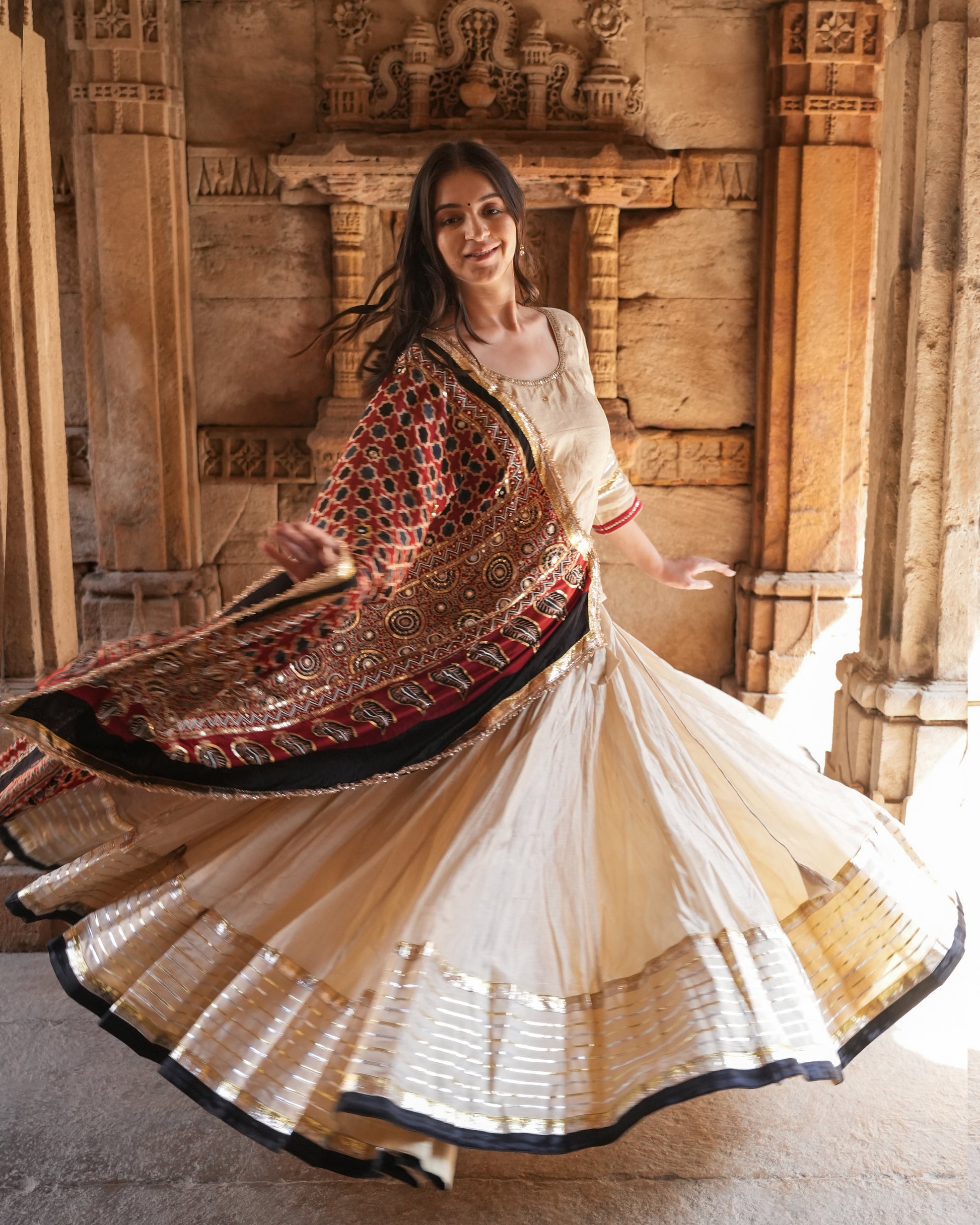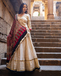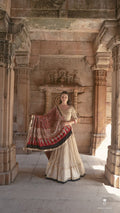 This cream chaniya choli is an ode to simplicity elevated to royalty – ideal for those who seek sophistication with subtle grandeur for special occasions.