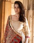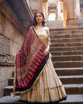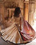 Presenting the sixth ensemble from the Indie Spark Collection by Kalpana's Creations Sindhubhavan – a breathtaking Cream Chaniya Choli that embodies simplicity, elegance, and timeless royalty. This outfit speaks volumes with its serene beauty and intricate detailing, making it a perfect choice for those who prefer understated opulence.