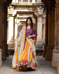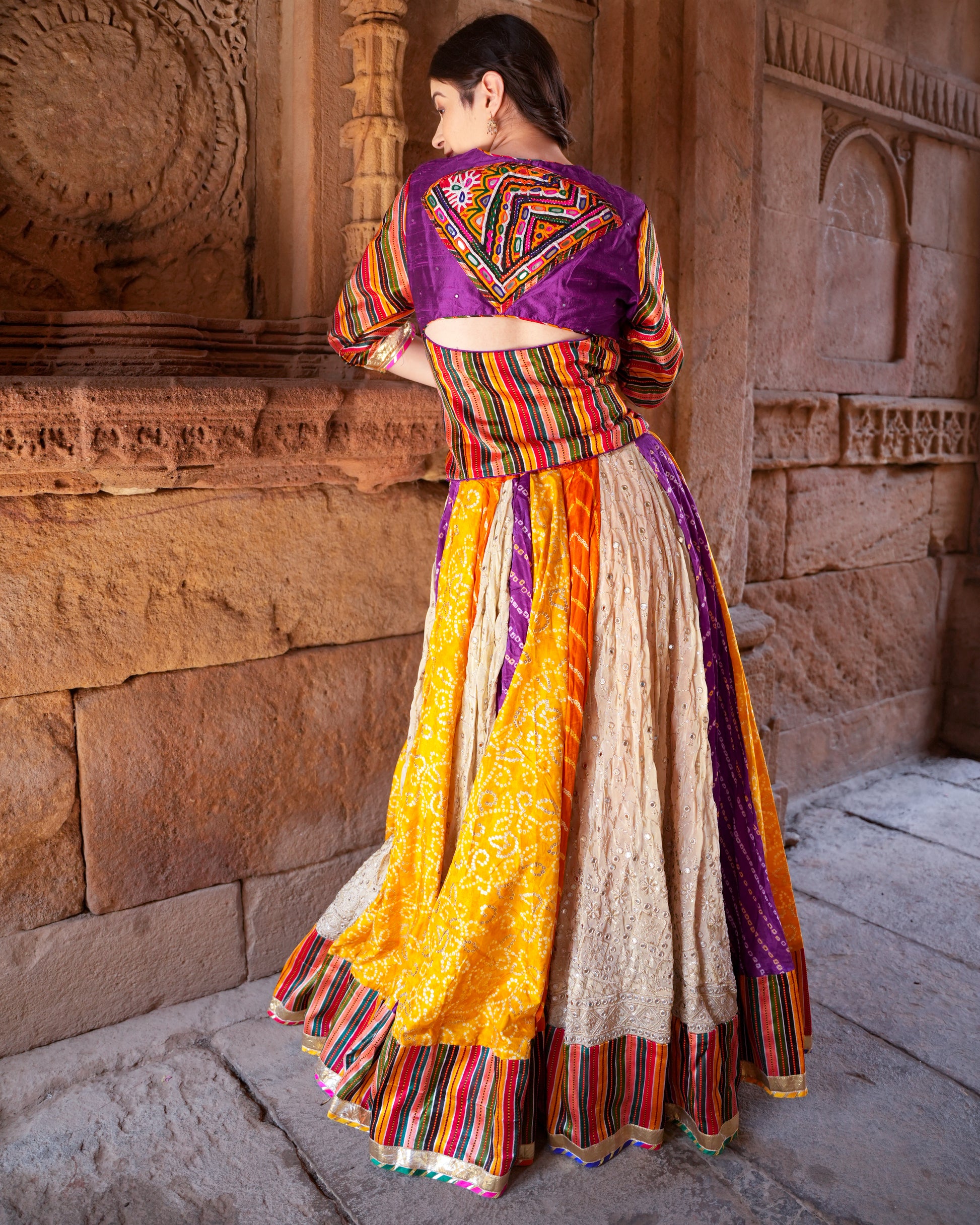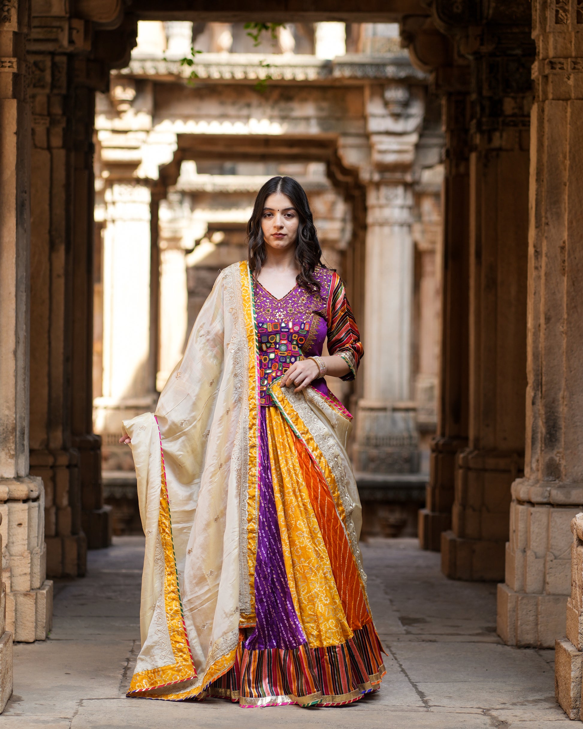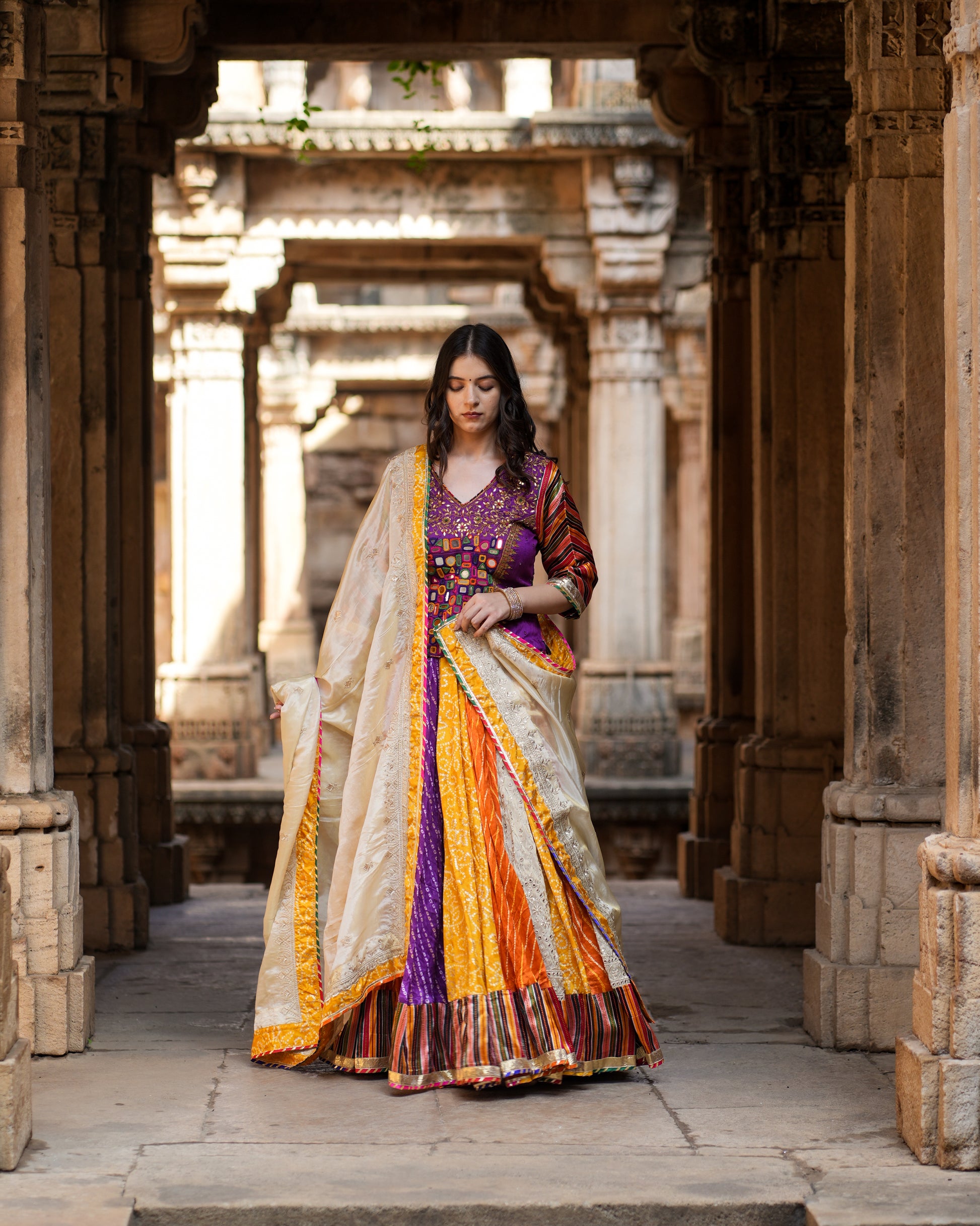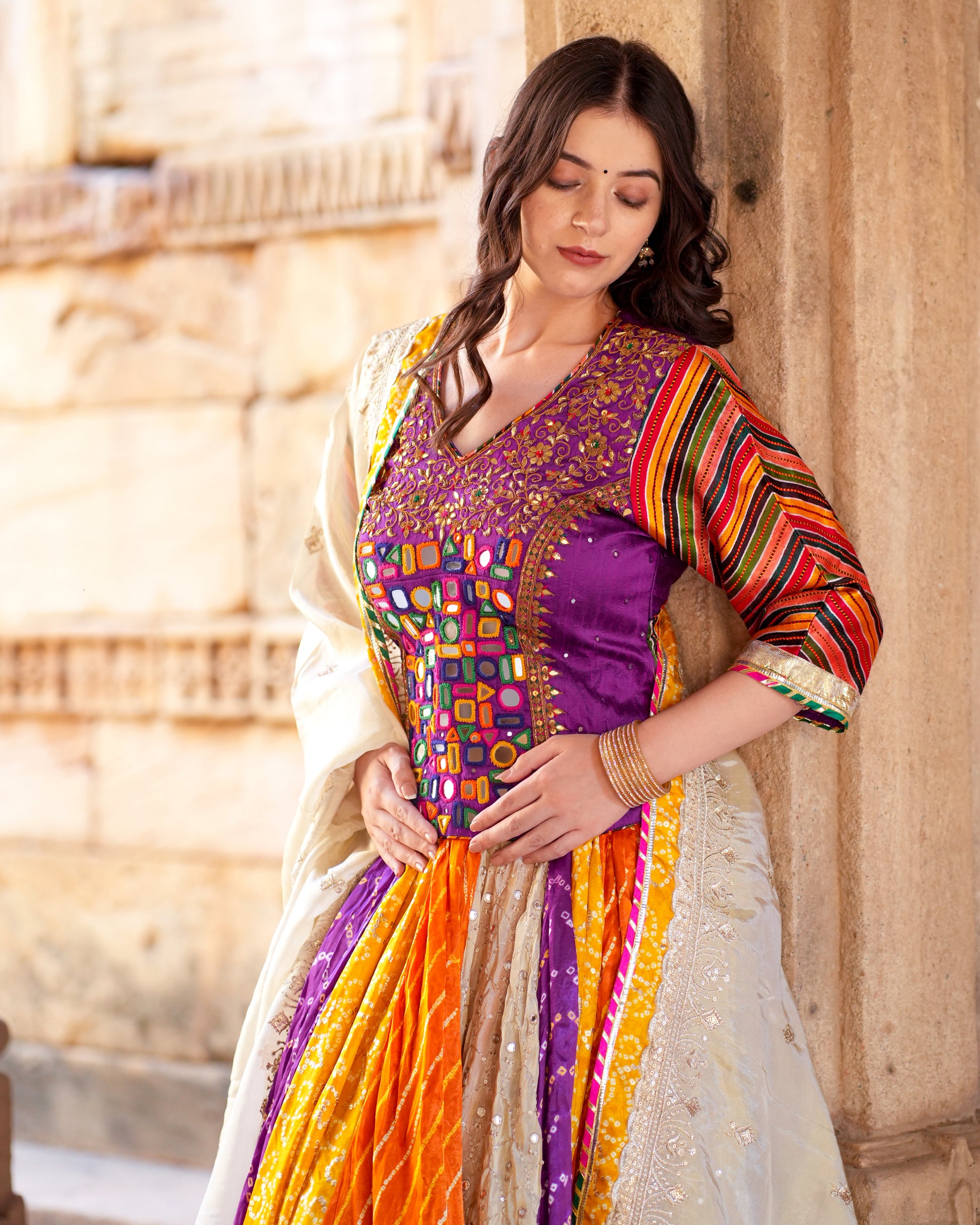 The Kalidar Chaniya (skirt), with its majestic flair, is crafted from pure fabrics and adorned with intricate Bandhani patterns in a regal palette of vibrant orange, creamy ivory, and pastel purple. This combination evokes an aura of elegance and tradition, perfect for making a statement at any celebration.