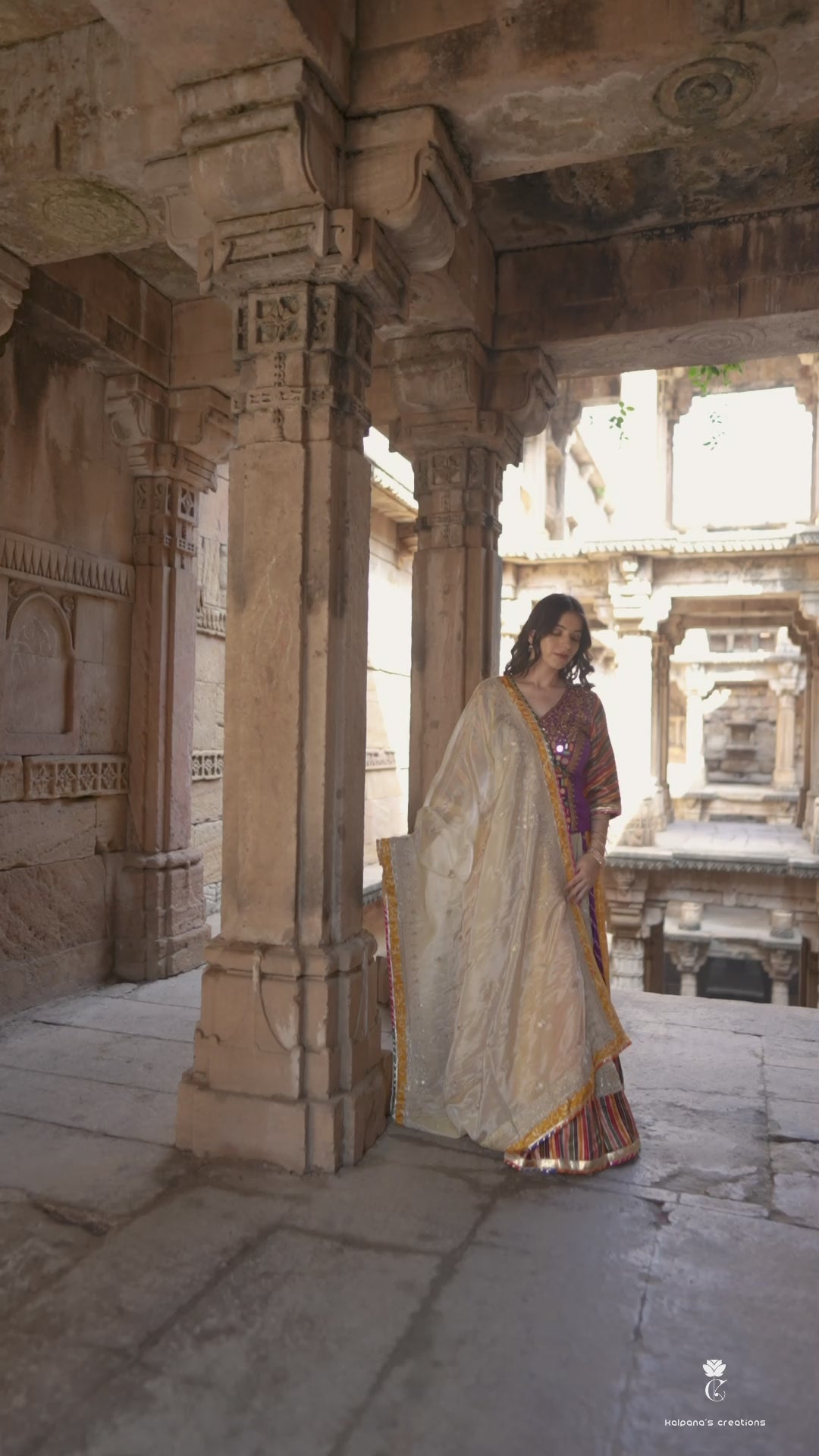 Introducing the first masterpiece of the Indie Spark Collection by Kalpana's Creations Sindhubhavan – an opulent 20-meter flair Chaniya Choli crafted to exude the grandeur and elegance of royal celebrations. This piece is a true work of art, created with the finest materials and the skilled hands of Kutch artisans, who bring tradition to life with every detail.
