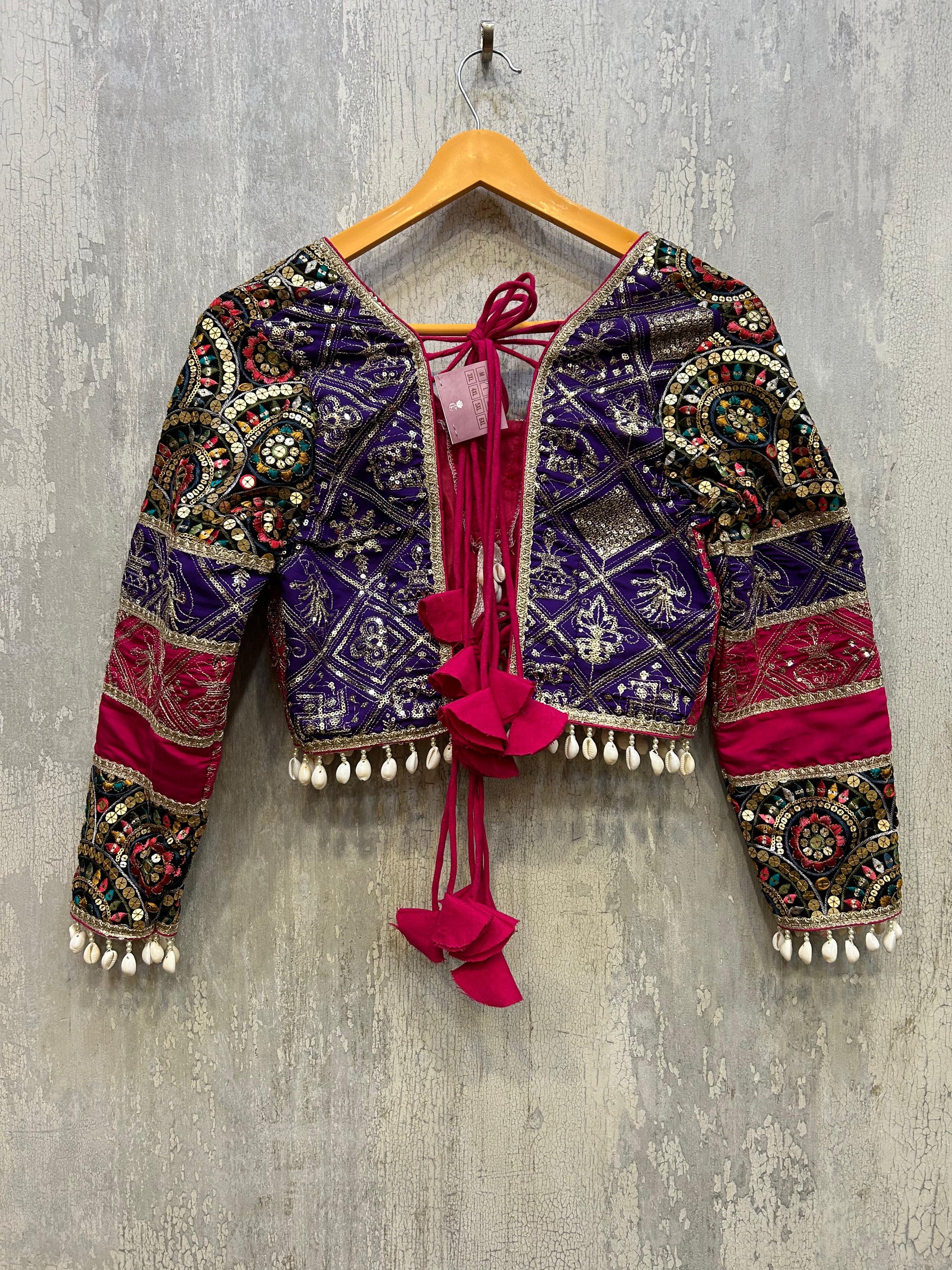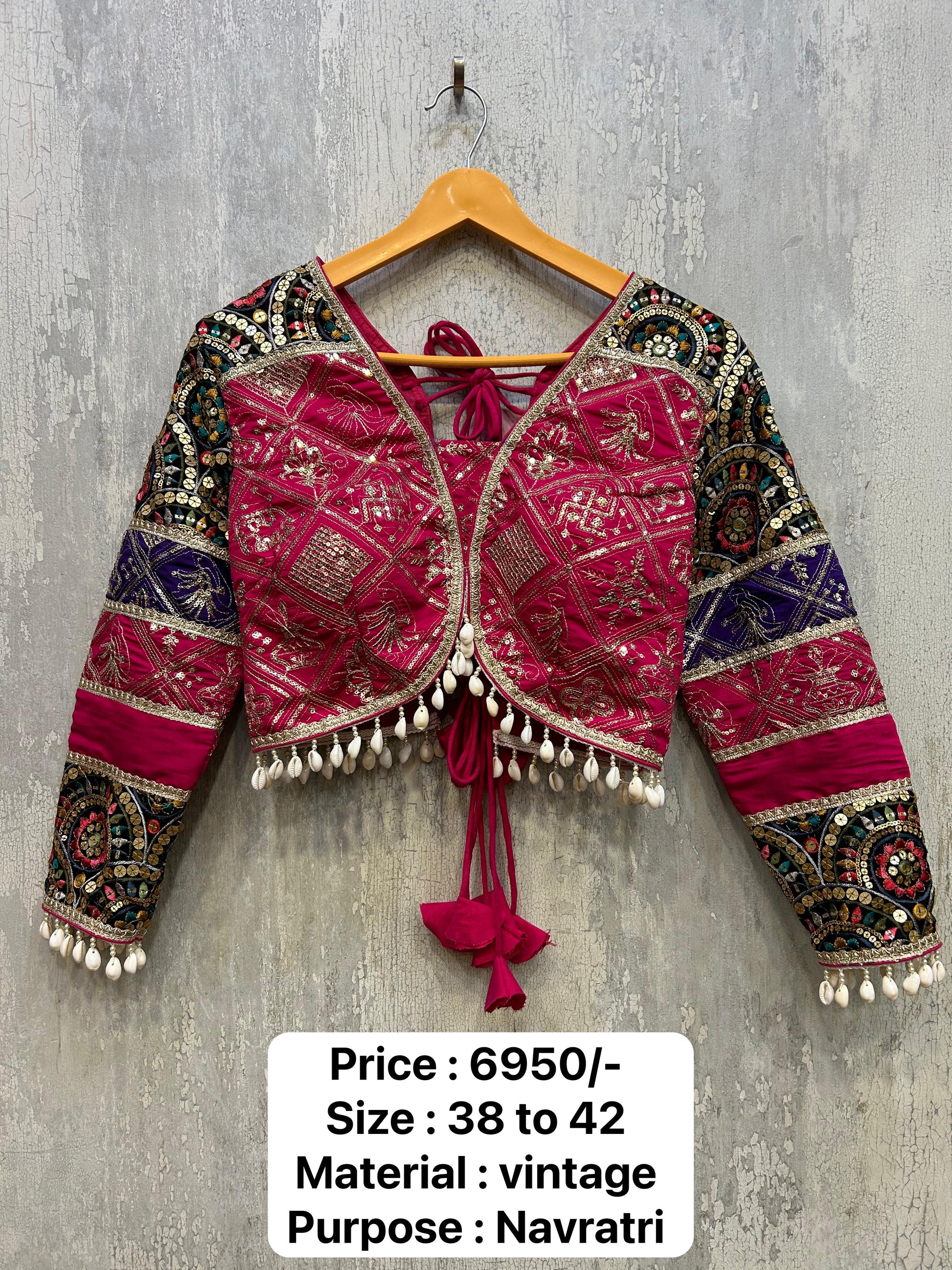 This exquisite blouse is crafted with a nod to vintage charm, featuring intricate embroidery, vibrant hues, and delicate embellishments inspired by Navaratri traditions. The tailored fit accentuates the silhouette, while the rich detailing reflects timeless craftsmanship. Its contemporary cut, such as a sleek neckline or unique back design, adds a modern twist, making it a versatile choice for pairing with lehengas, Chaniyas, or even modern skirts.