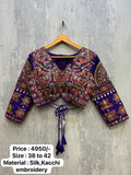 This DESIGNER silk Kacchi embroidery blouse by Kalpana’s Creations is a must-have for fashion enthusiasts who appreciate the seamless fusion of heritage and contemporary elegance.