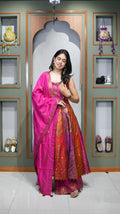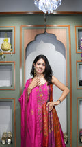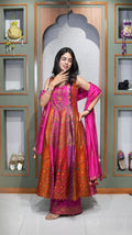 The Anarkali is paired with a designer palazzo pant, offering ease of movement while maintaining a structured and elegant look. Completing the ensemble is a self-tone dupatta featuring all-over weaving, adding subtle texture and sophistication while keeping the overall appearance refined and balanced.
