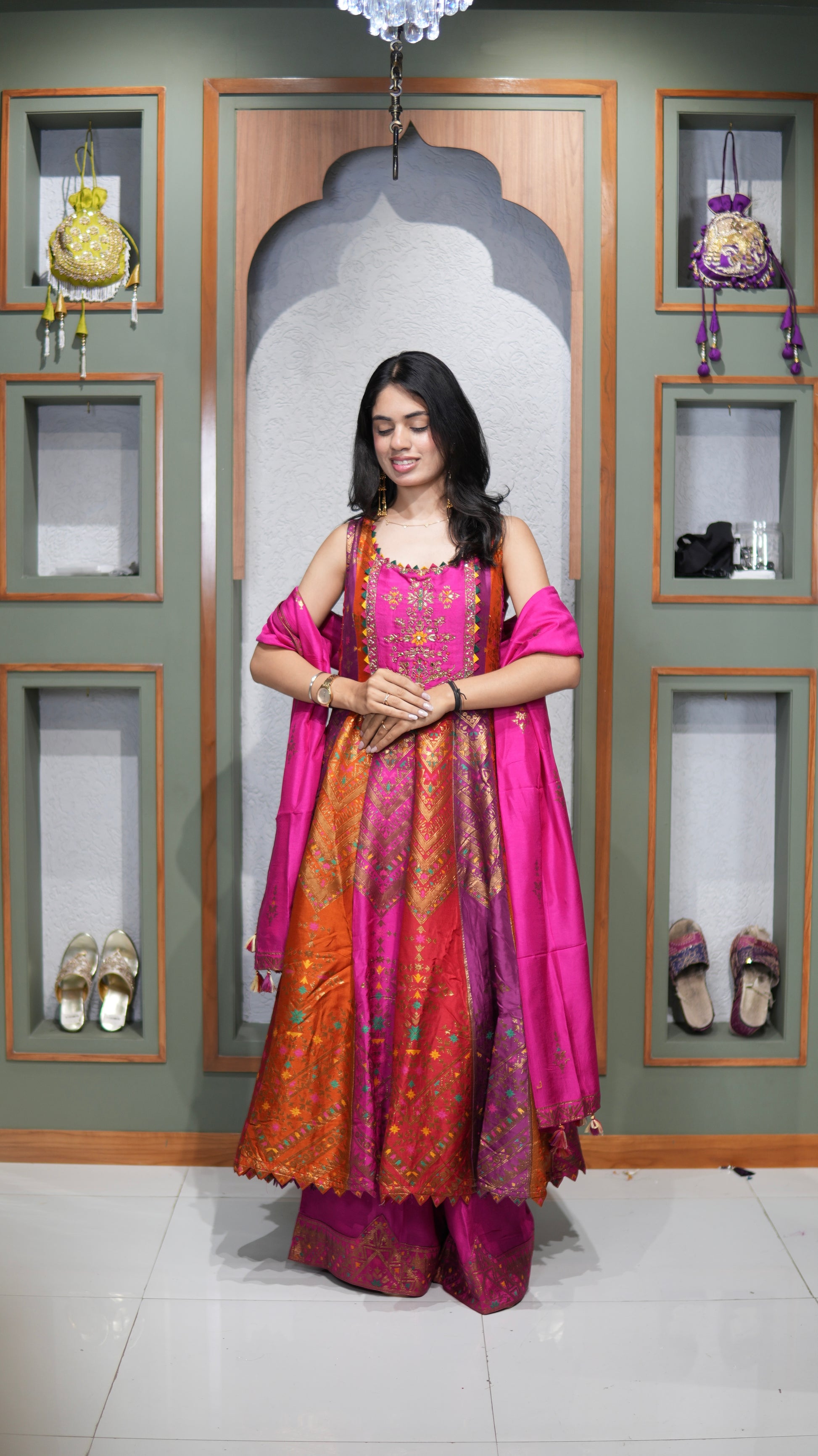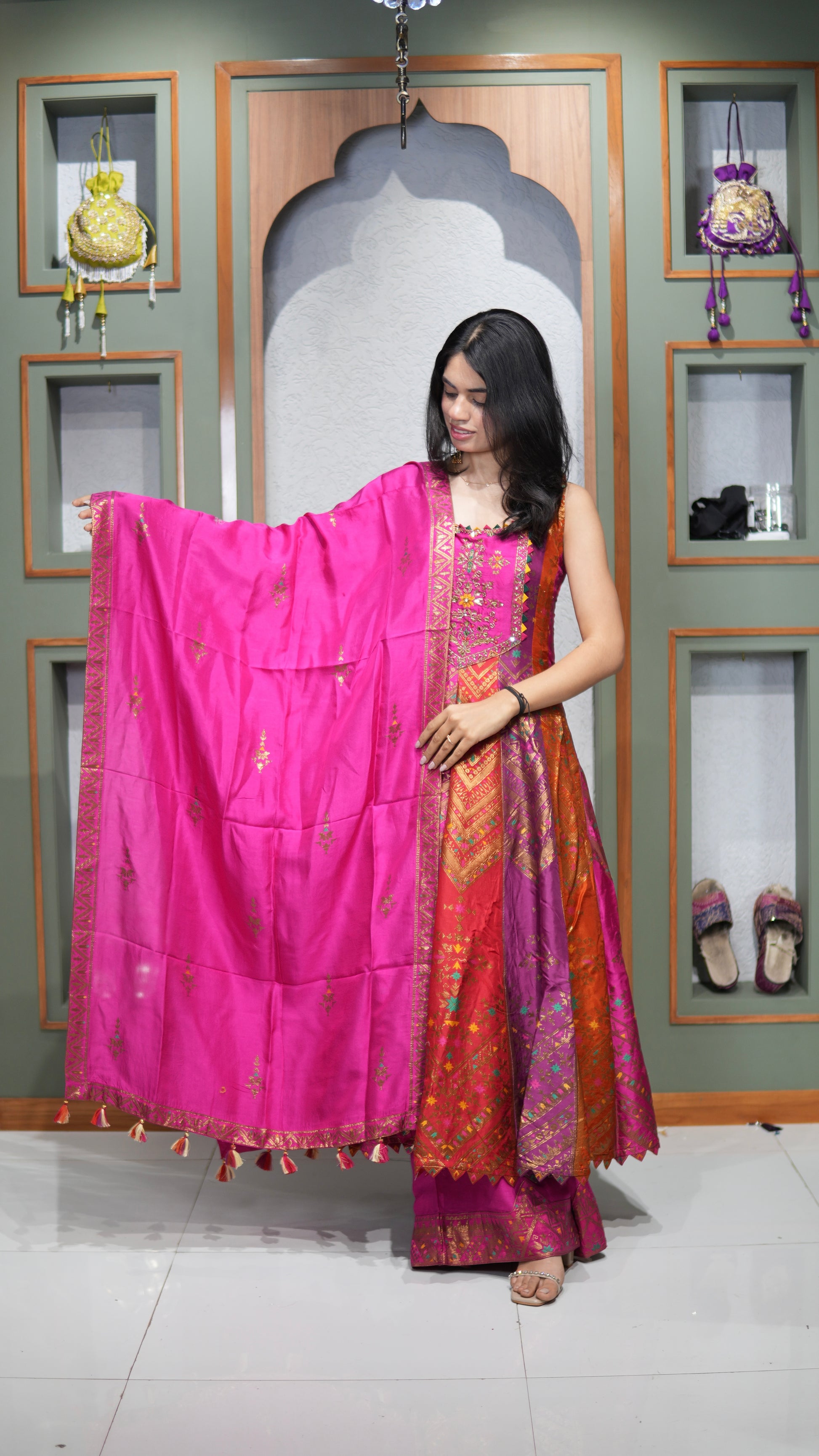 ✨ Anarkali: Short Length with Full Ghera, Antique Weaving & Hand Khat Mirror Work Yoke