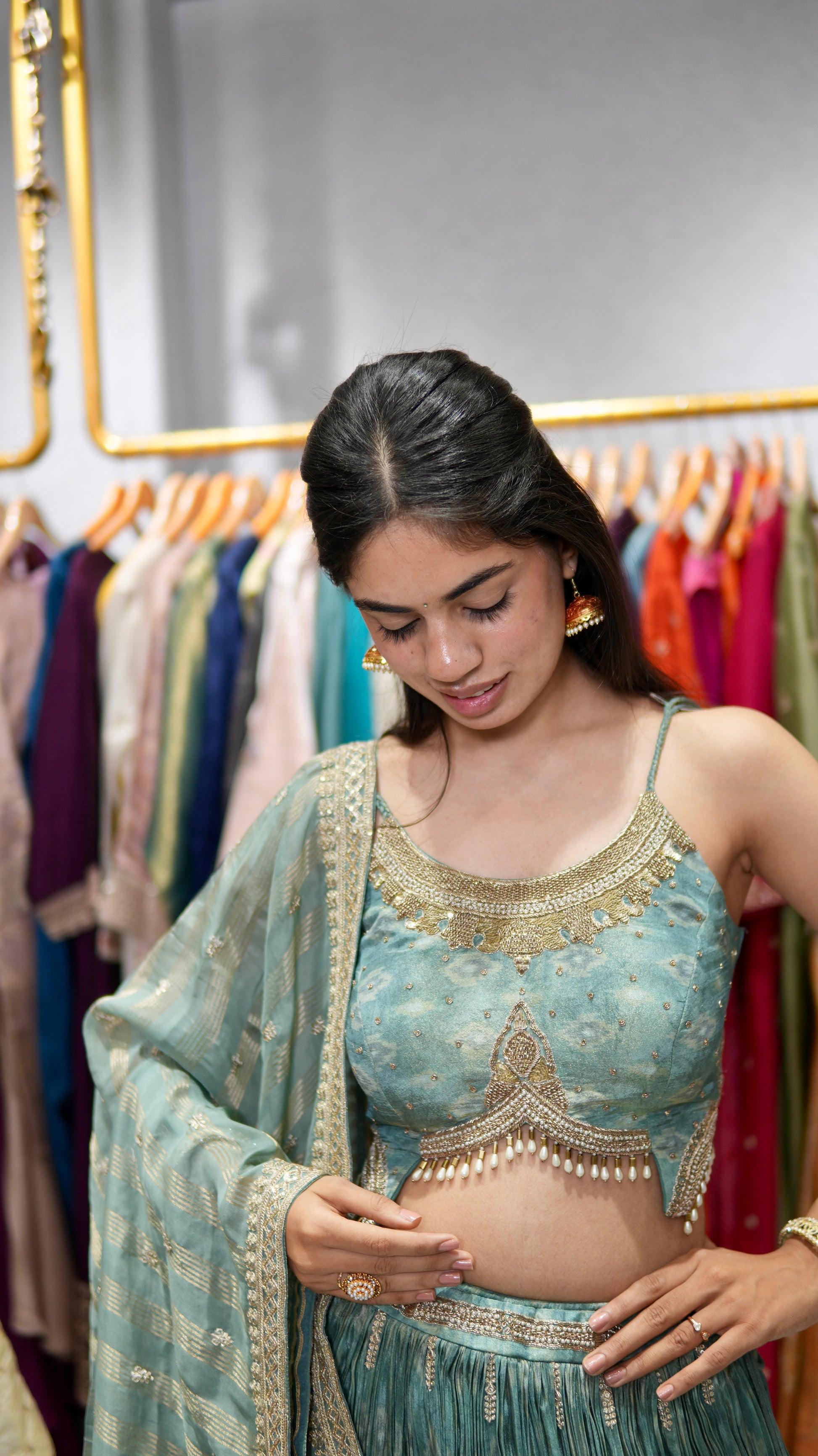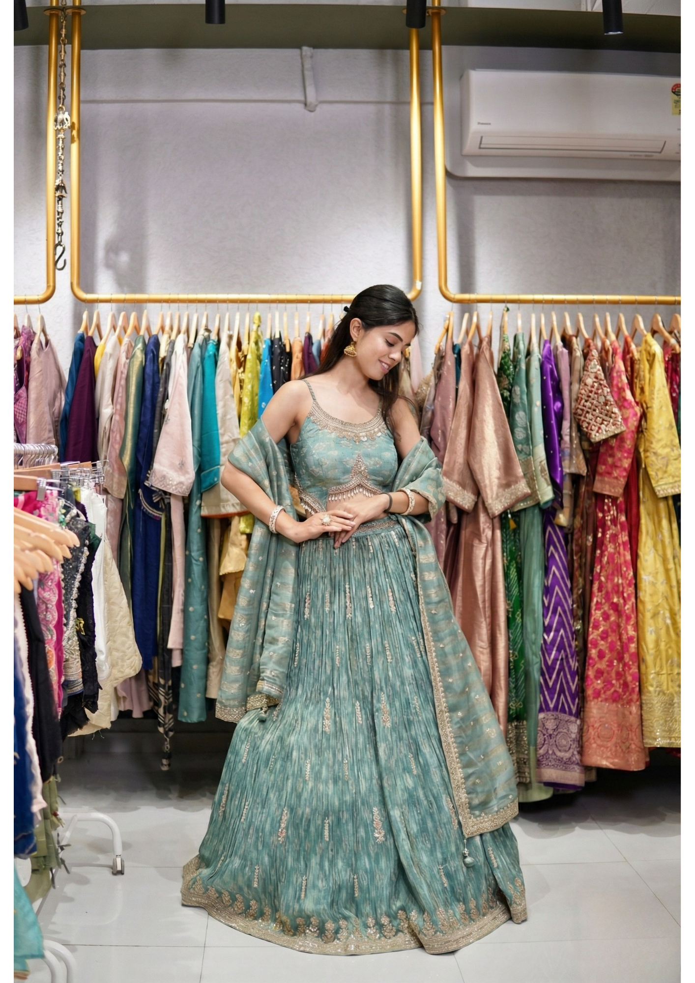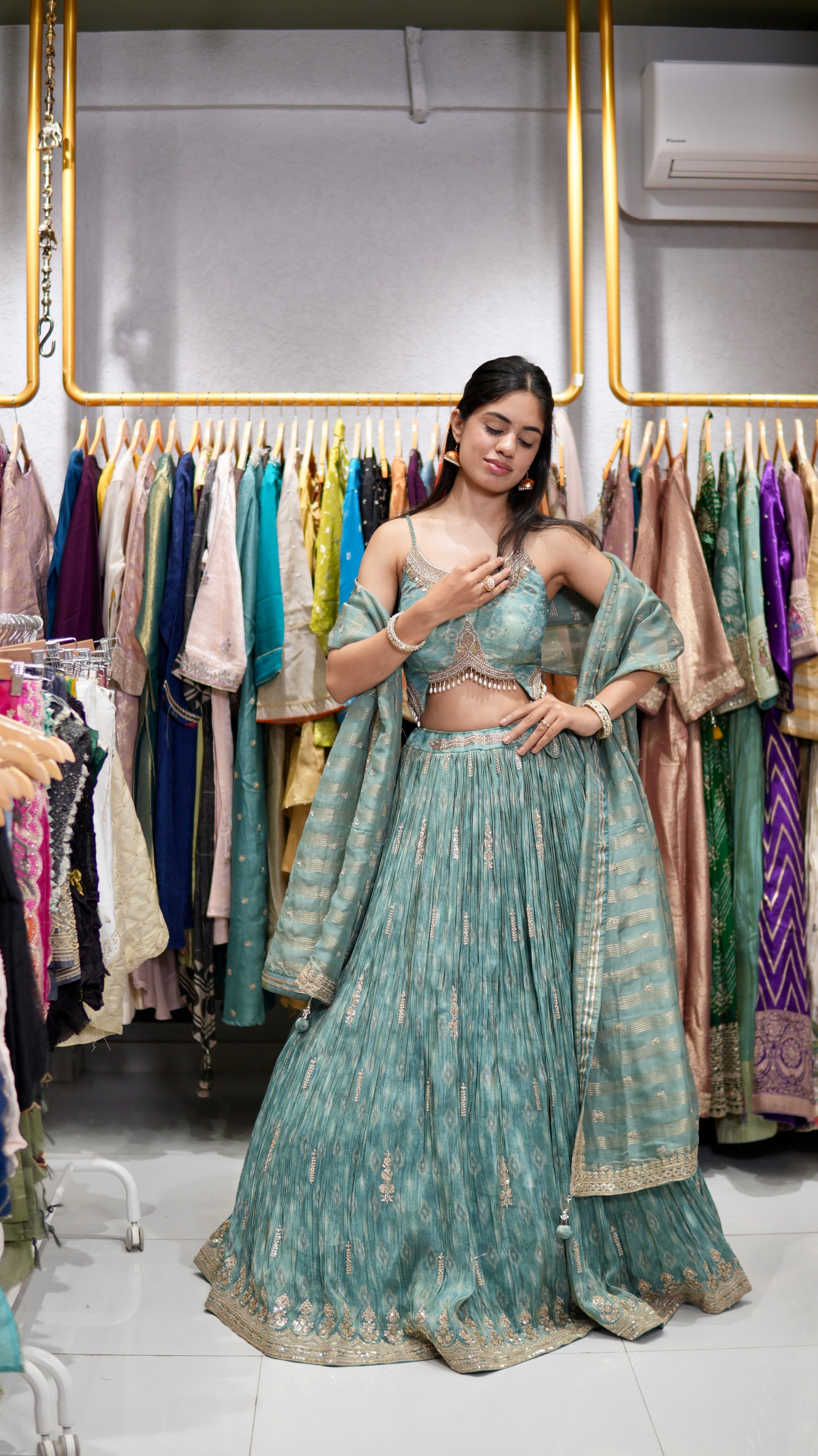 The lehenga skirt is crafted in luxurious crush tissue fabric, giving it that dreamy fall and graceful movement we all adore