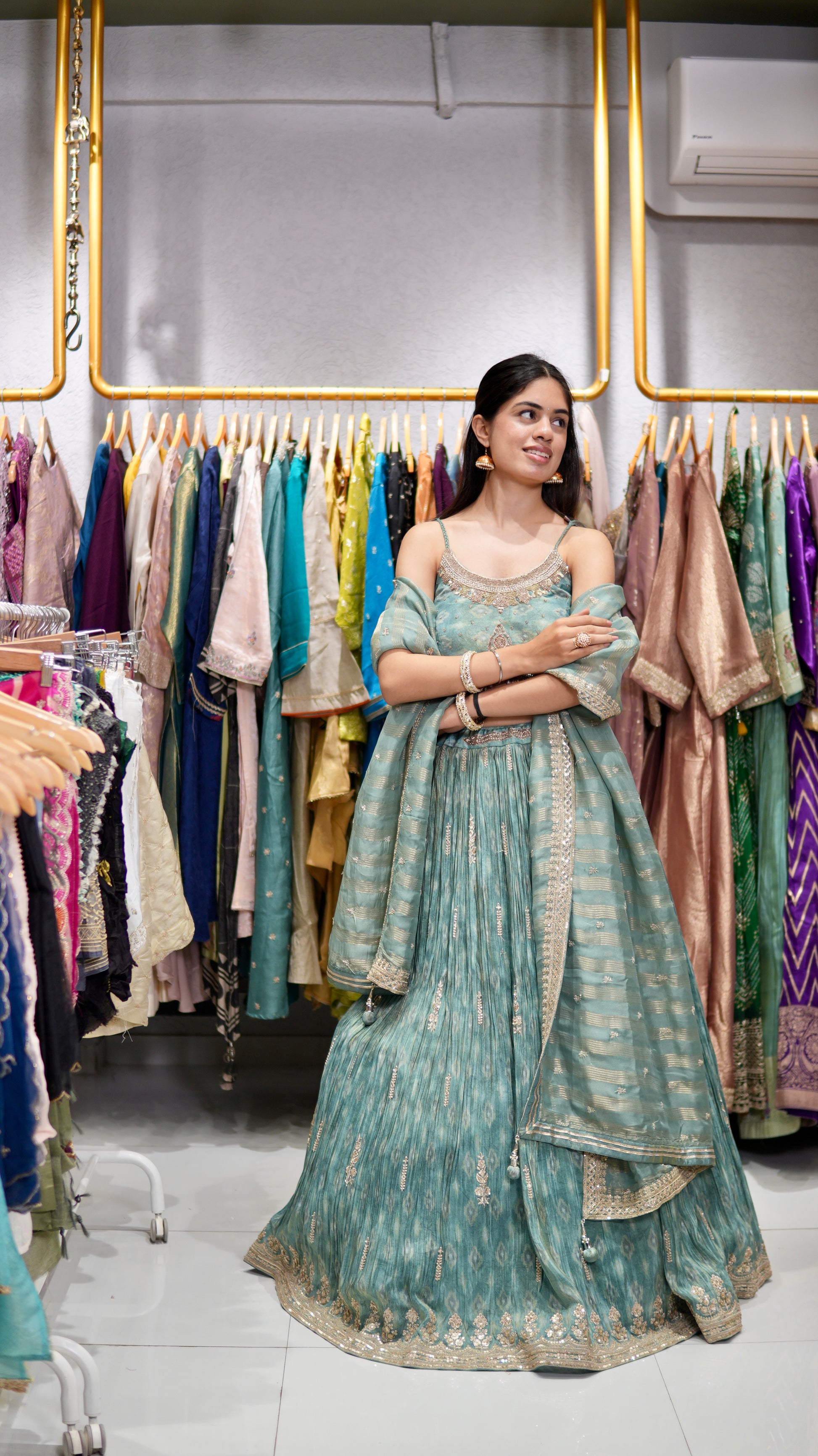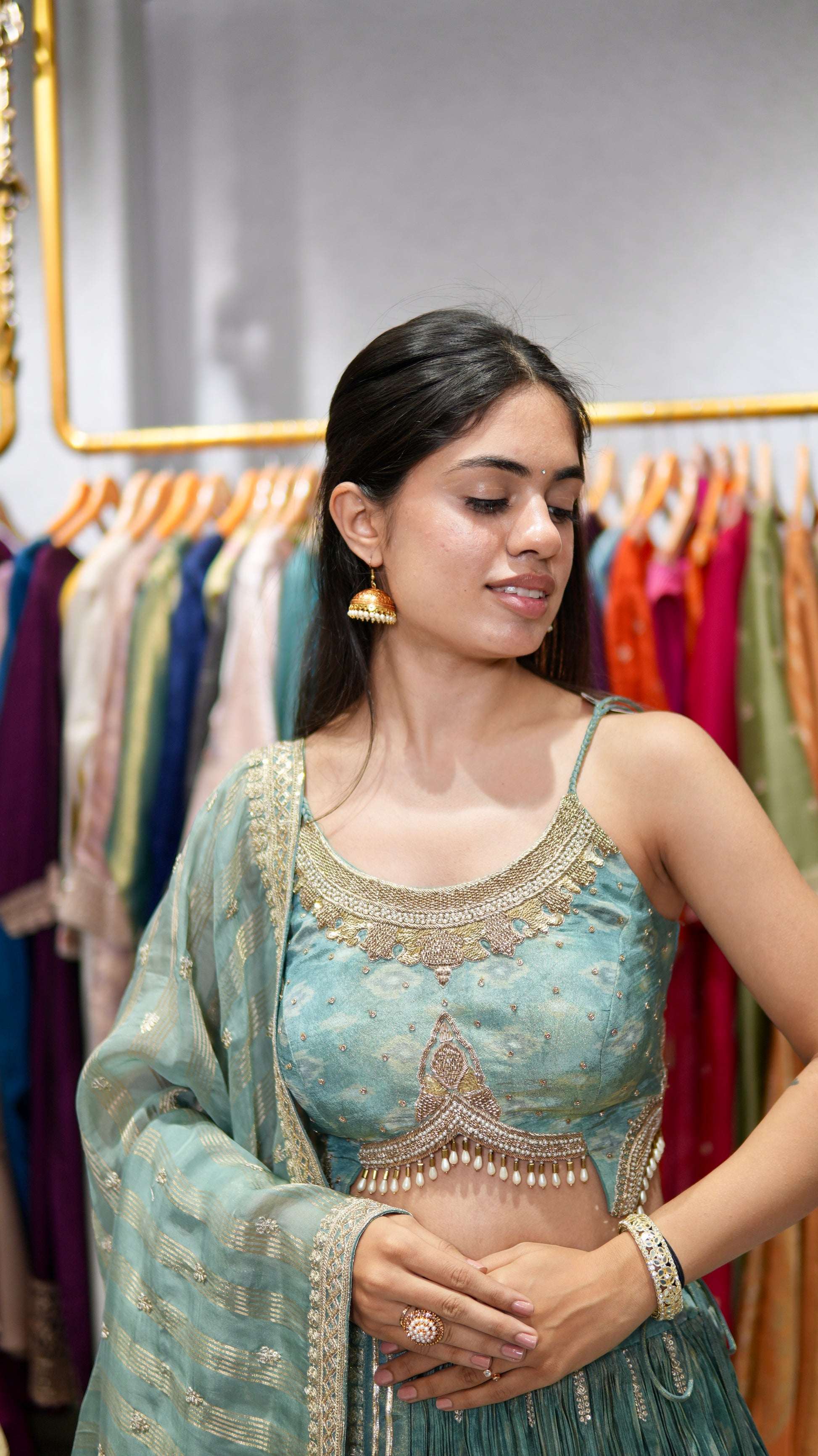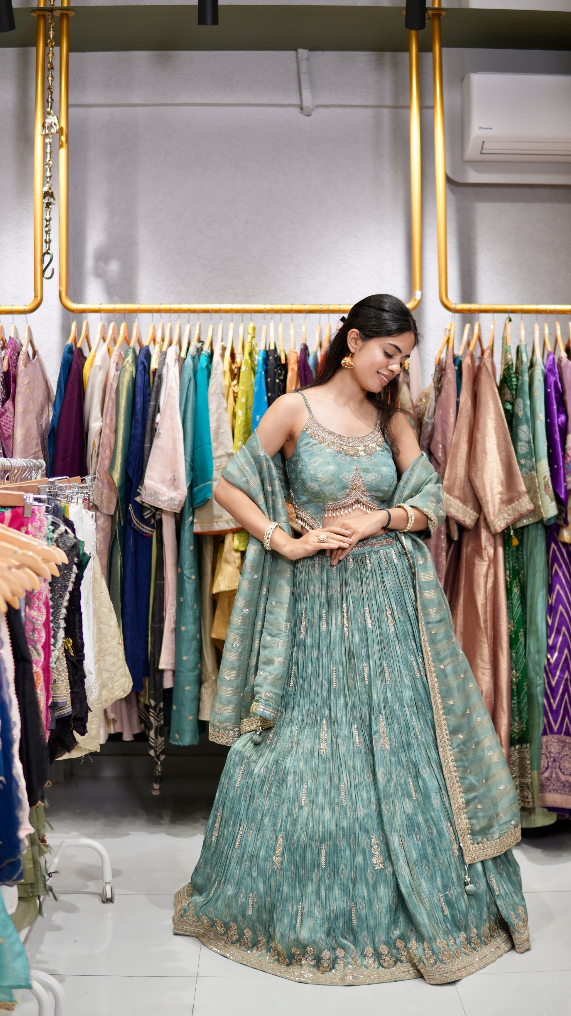 The lehenga skirt is crafted in luxurious crush tissue fabric, giving it that dreamy fall and graceful movement we all adore