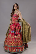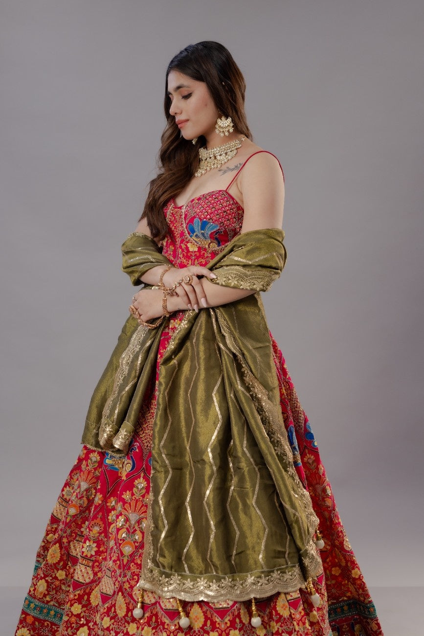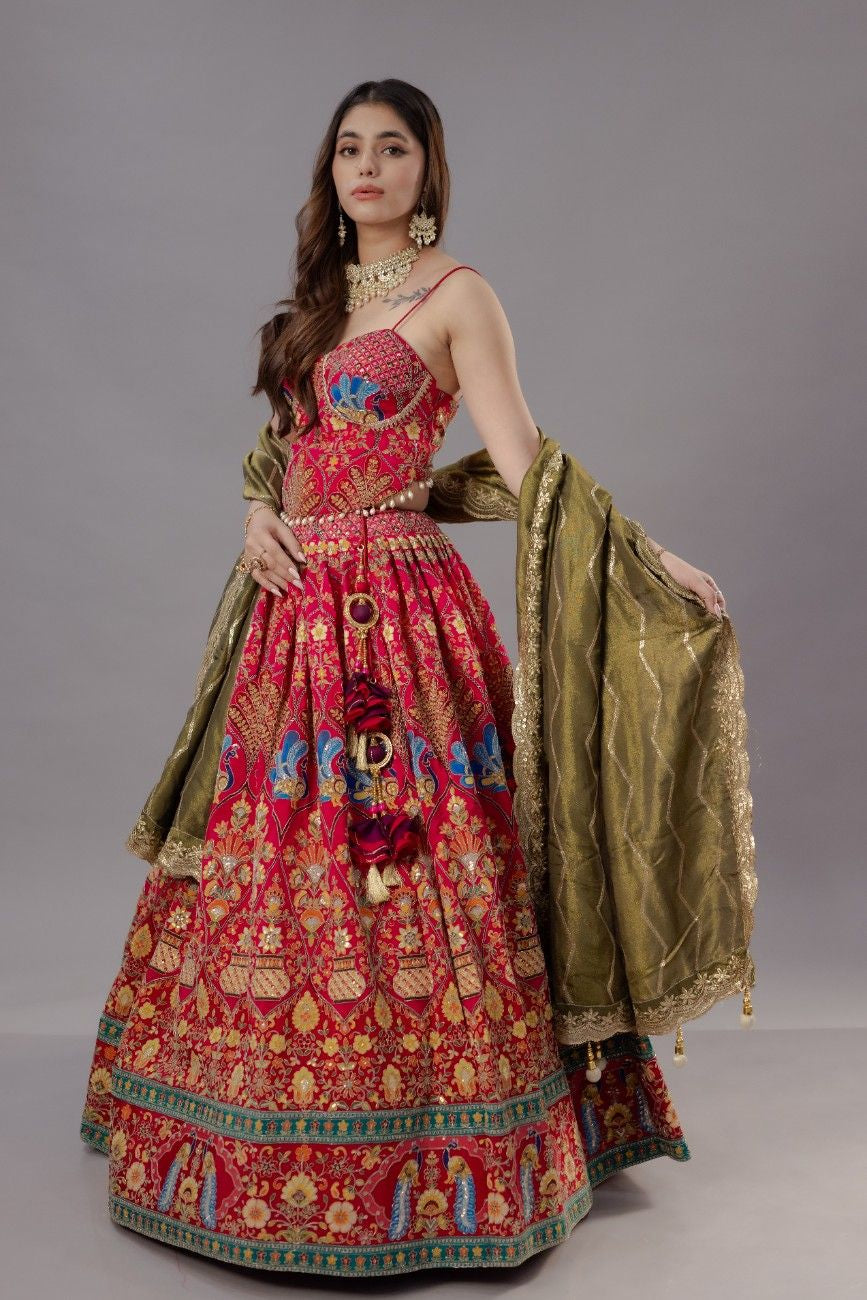 Designer Pure Silk Chaniya Choli Set with Corset Blouse, Peacock Vintage Motifs & Pure Tissue Dupatta