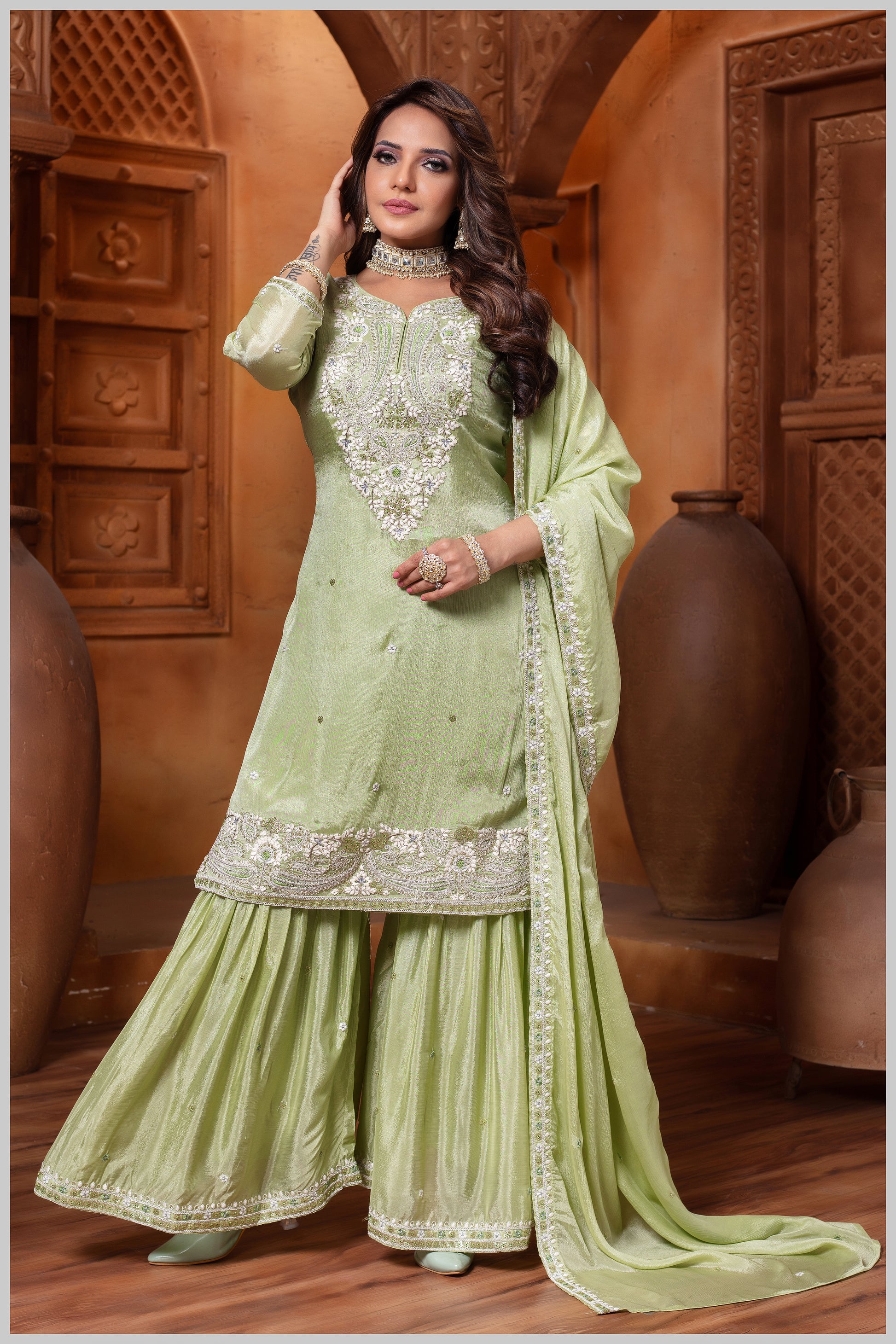 Designed with full sleeves, the ensemble exudes a graceful and poised charm. The full-sleeve silhouette adds versatility and elegance, making it suitable for a wide range of occasions while offering a balanced and refined look.