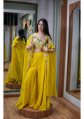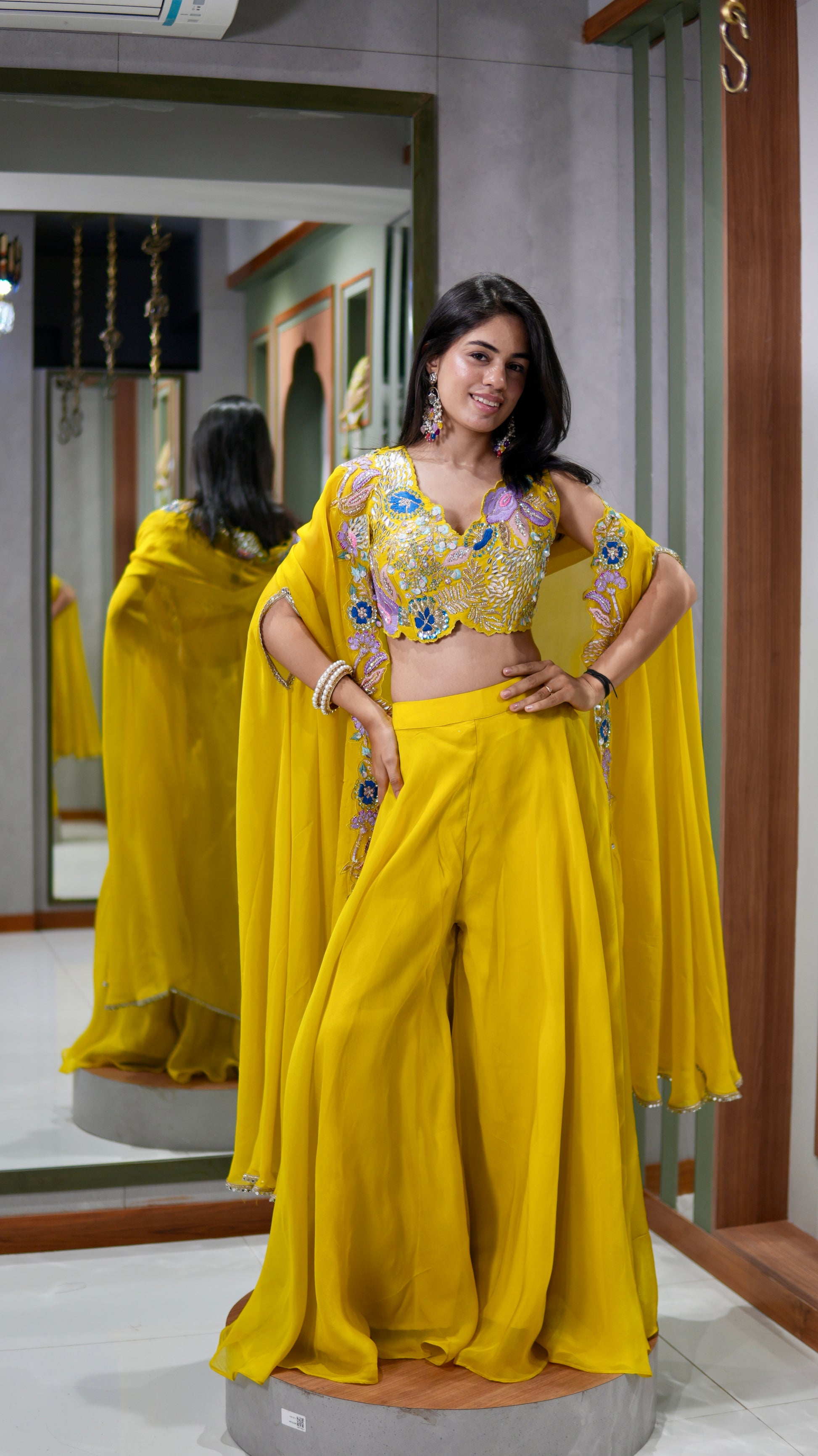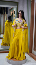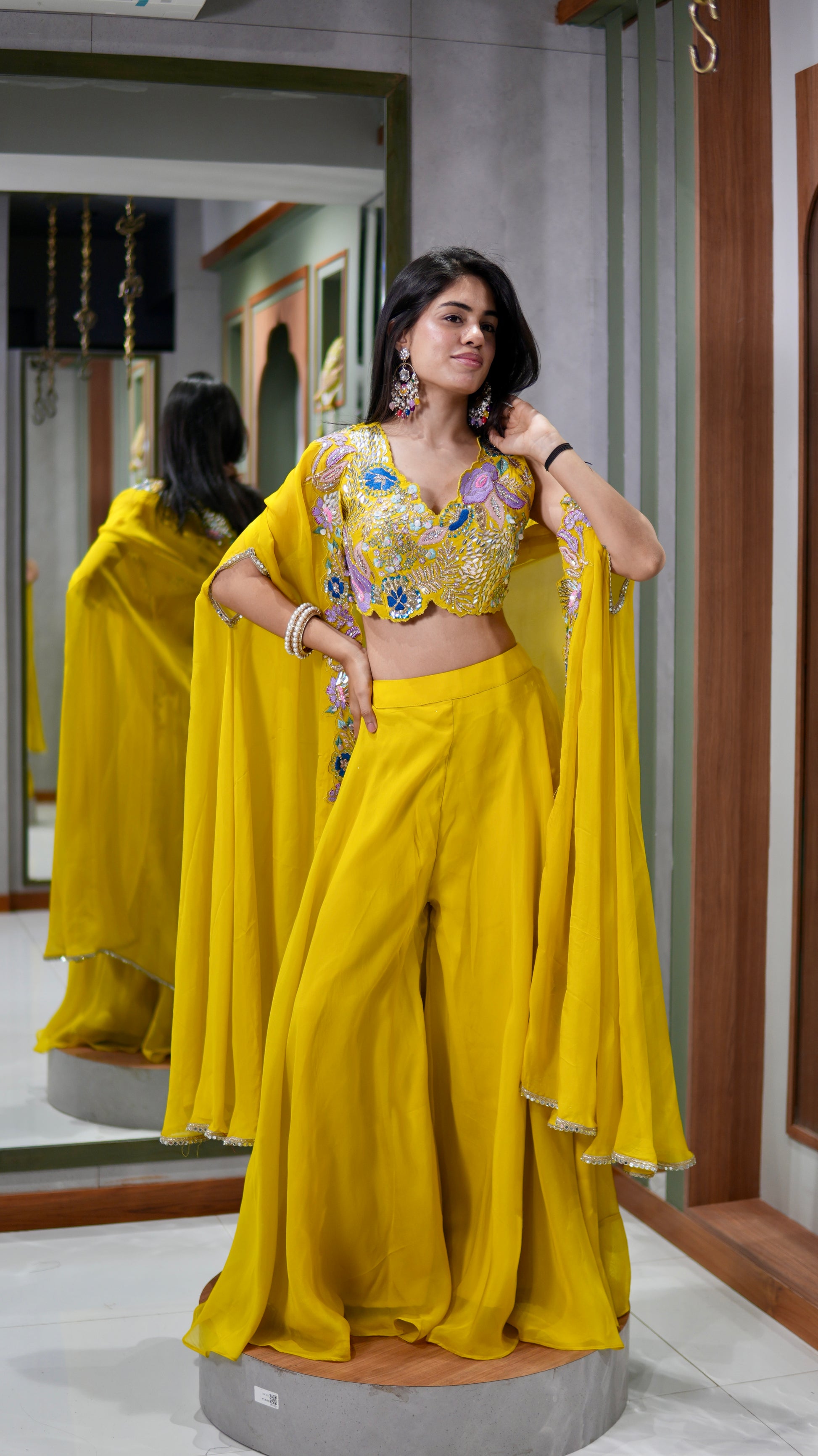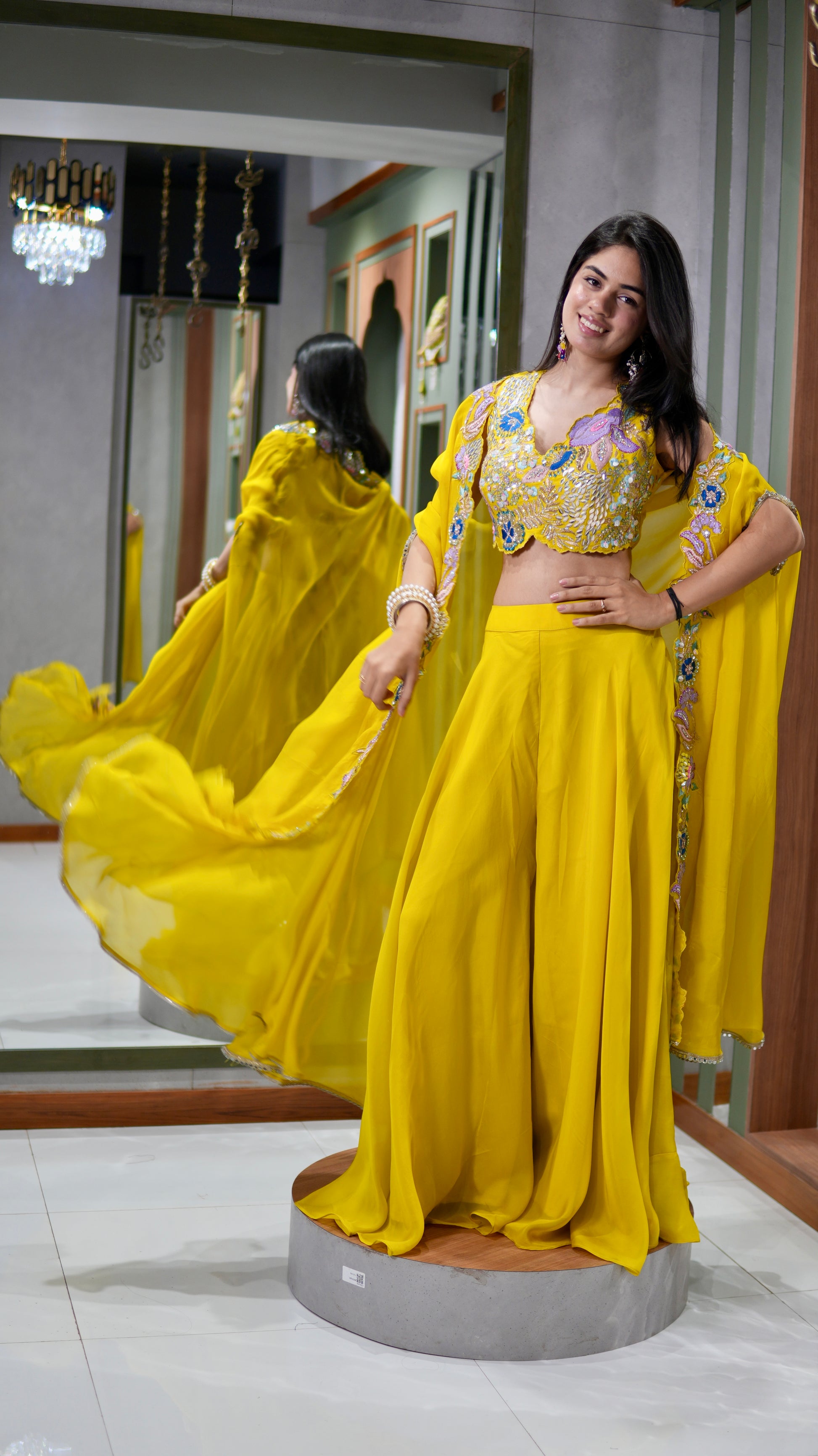 It’s paired with a full-ghera divider palazzo in luxurious pure glass tissue, designed to move beautifully with every step, twirl, and candid shot